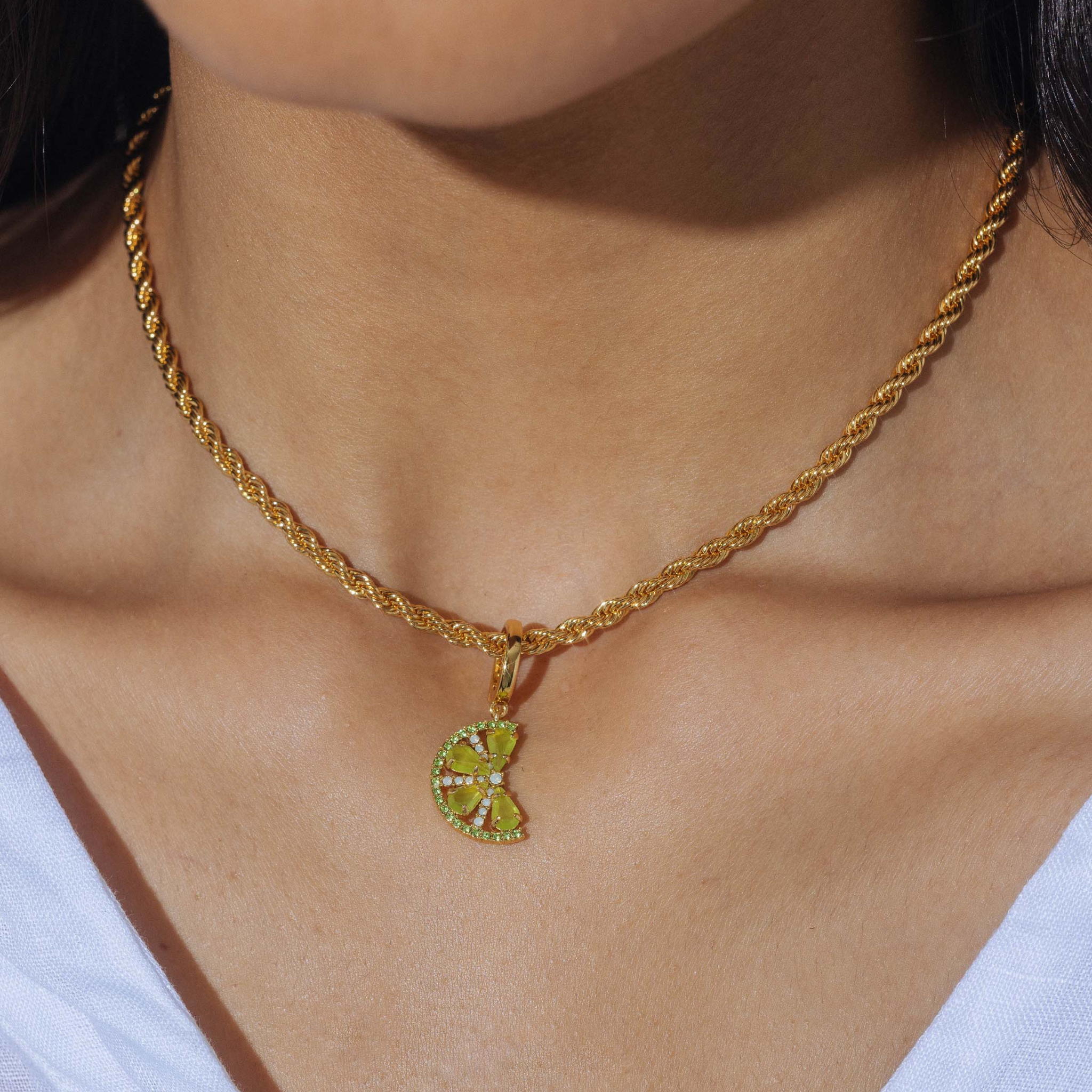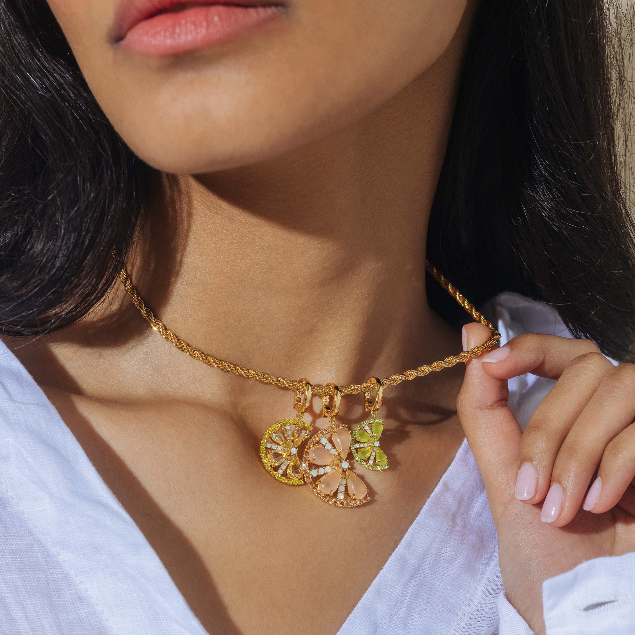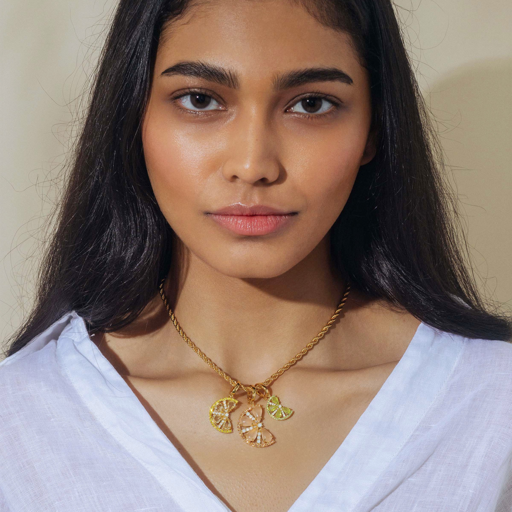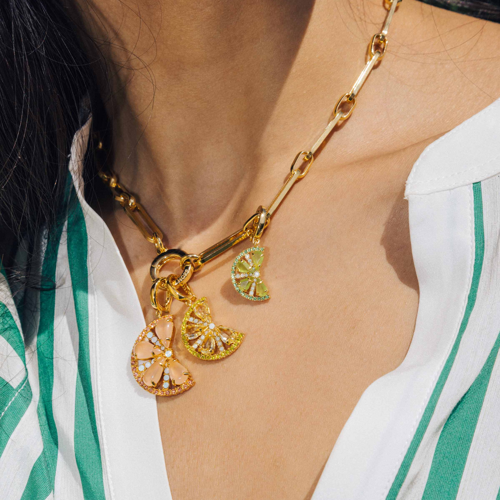 It’s hard to play favorites but we’d be lying if we didn’t think our Citrus Slice Trio Pendant Set has main squeeze potential. These teeny slices of grapefruit, lemon and lime beg to be layered in a jewelry fruit salad, dancing from our newest chain, the Cara Rope Chain Necklace. Features a 24K shiny gold finish over brass.