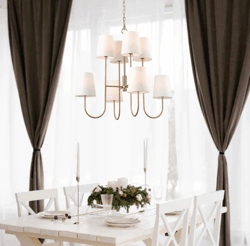 The Kinley Chandelier is a fresh take on a classic two-tiered shape. Subtle modern touches like the tapered shade and gold finish complete the look.