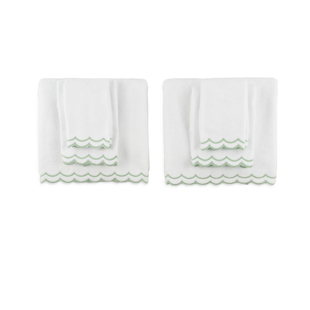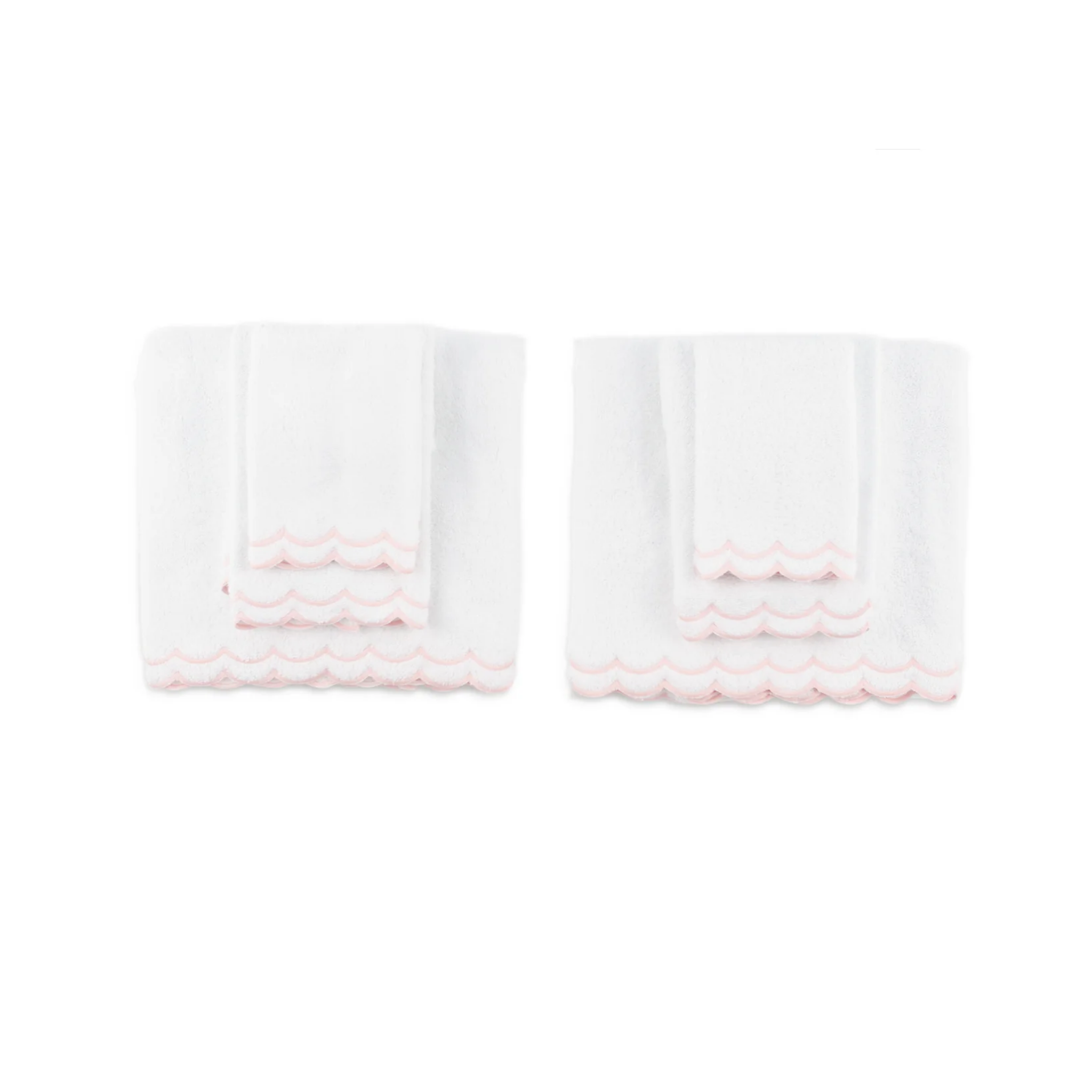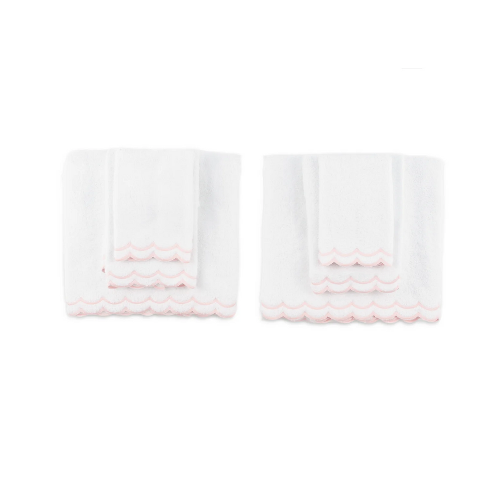 Classic Bundle of White Scalloped Edge Embroidered Cotton Bath Towels- Available With Pink, Blue Or Green Trim