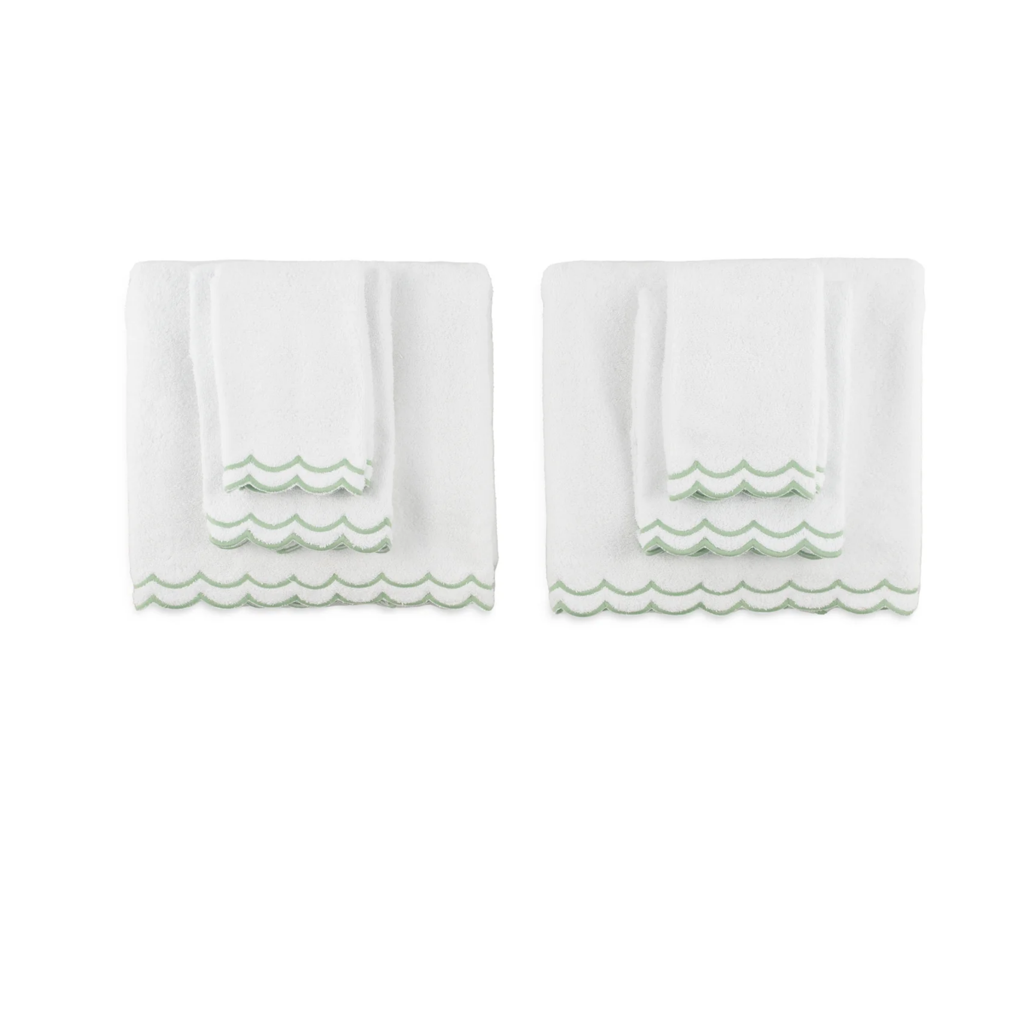Elevate your bathroom with this luxurious floor mat and towel set. You'll love these thick, absorbent towels finished with double scallop cotton embroidery. The 6 Pack Classic Bundle includes 2 bath towels, 2 hand towels, and 2 face towels. Available with light blue, pink, or green trim. This item is final sale and is not eligible for return. Click images for greater detail.
