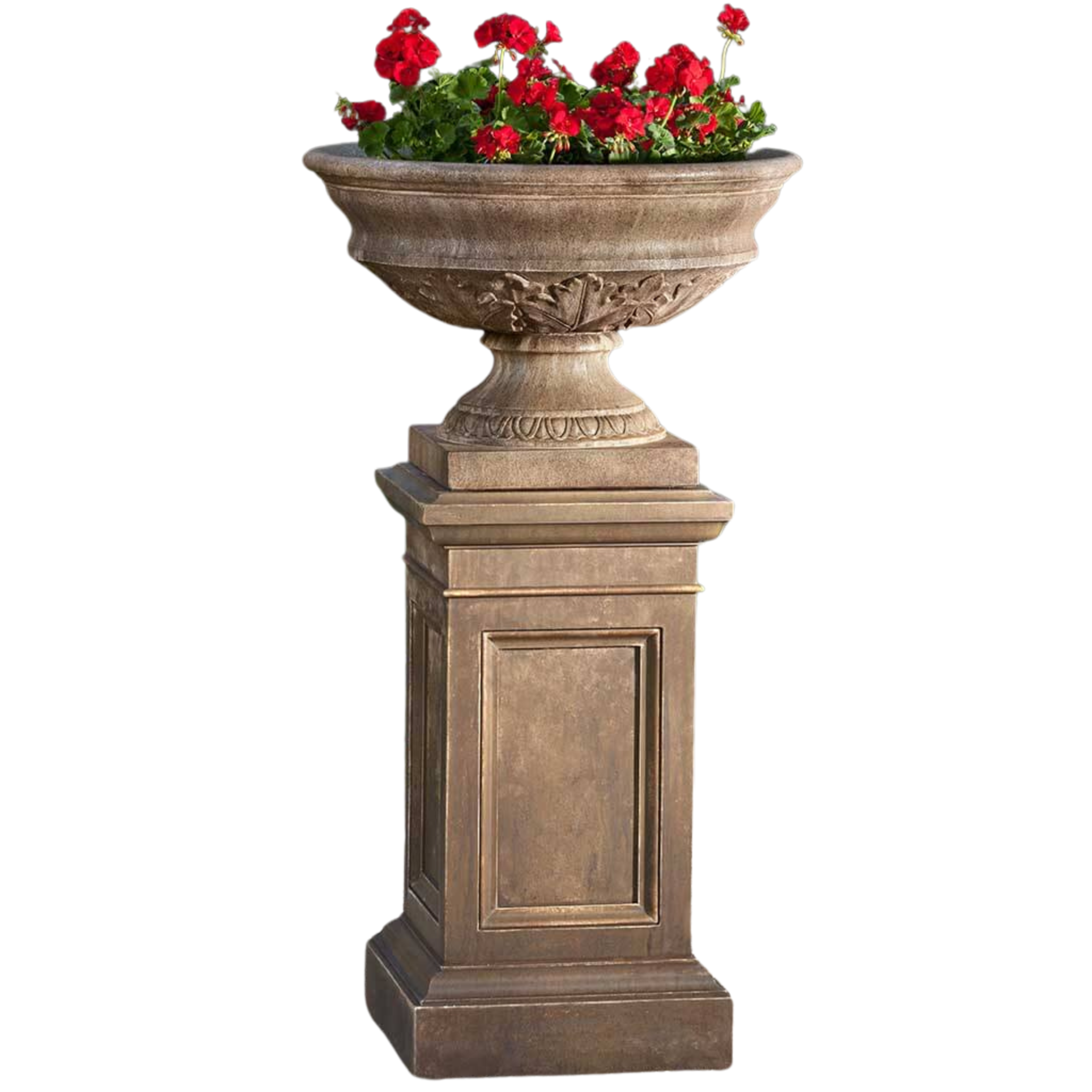 The Coachhouse Urn with Pedestal is a magnificent statement piece, perfect for adding grandeur to your outdoor garden or patio. Made from durable cast stone, this exquisite urn is designed to sit atop the matching pedestal, elevating your favorite plants or flowers for a dramatic, stylish display. With its intricate detailing and classic design, the urn is finished in Aged Limestone to complement any outdoor aesthetic. The Coachhouse Urn is not only visually stunning but also built to withstand the elements, making it an enduring addition to your landscape. Bring timeless beauty and sophistication to your home with the Coachhouse Urn With Pedestal, available now at The Well Appointed House.
