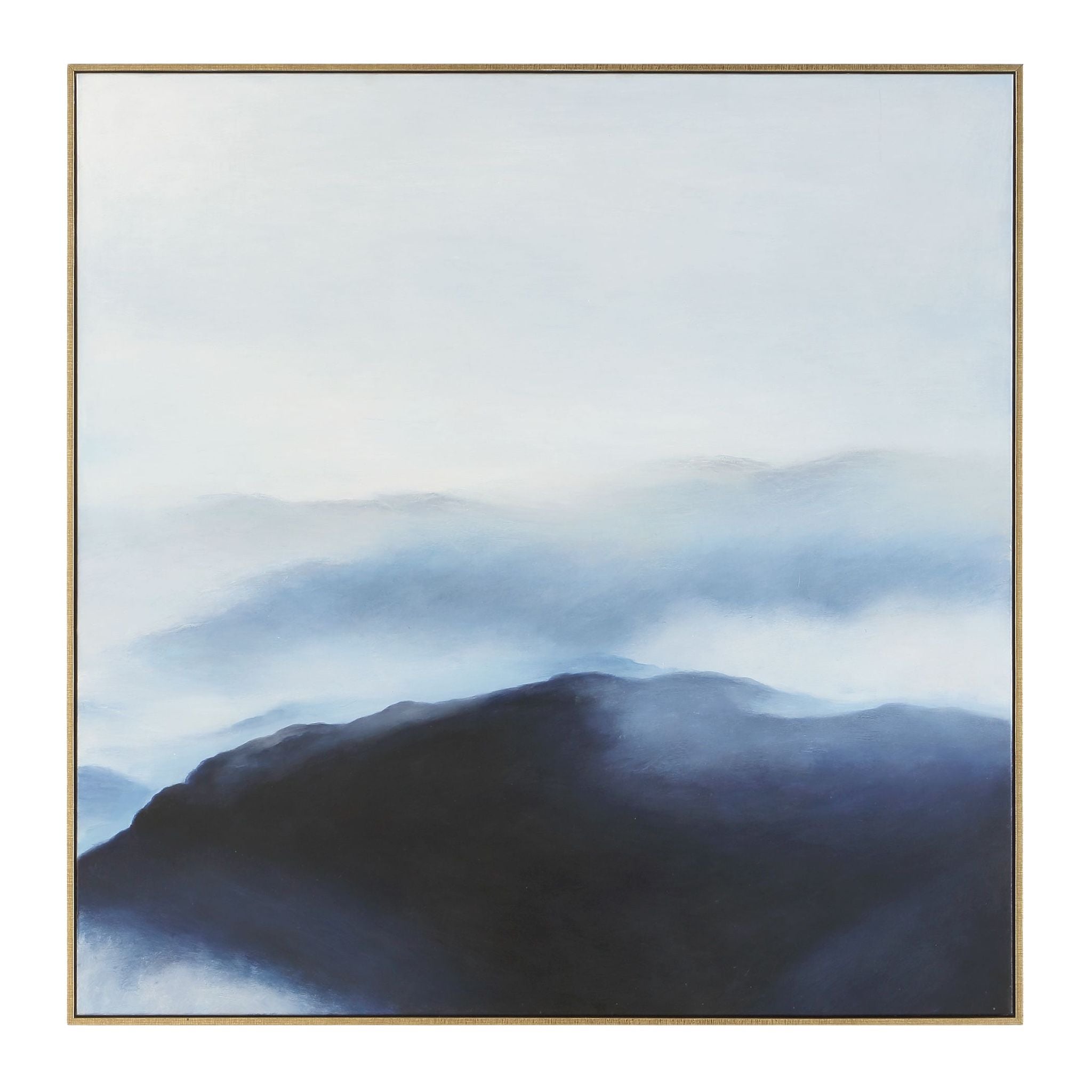 Cold Shoulder features a serene mountain landscape rendered in rich, moody blues that fade into soft grays and whites, creating a calm, atmospheric feel. Hand-painted on canvas and framed in a slim dark gray wood frame, each piece is uniquely finished, adding depth and quiet sophistication to any space.
