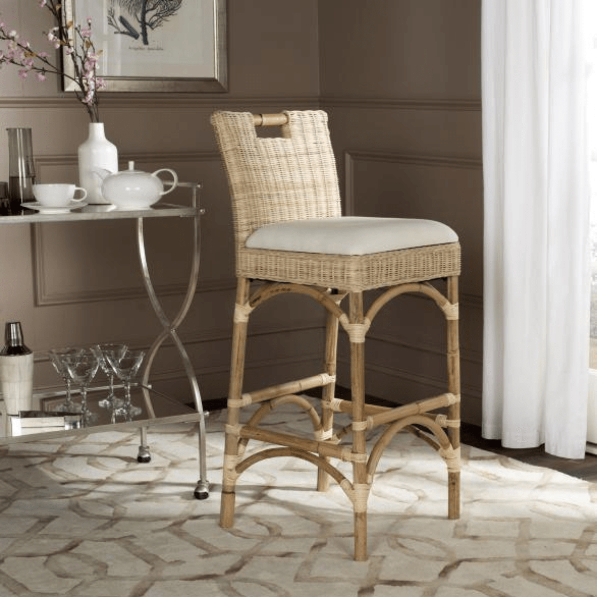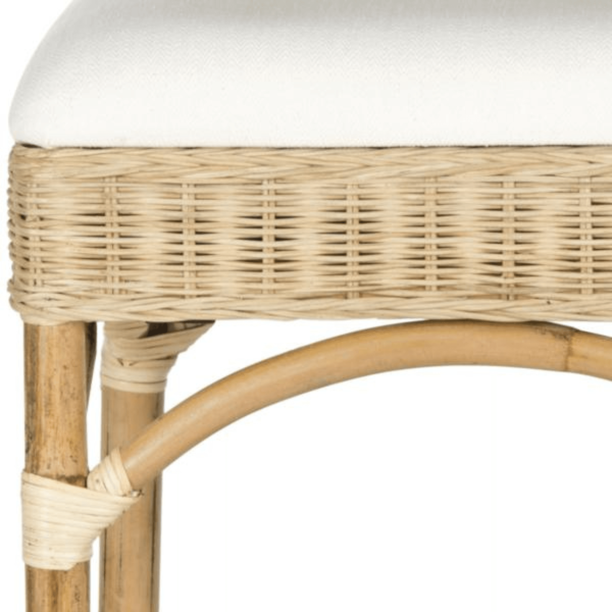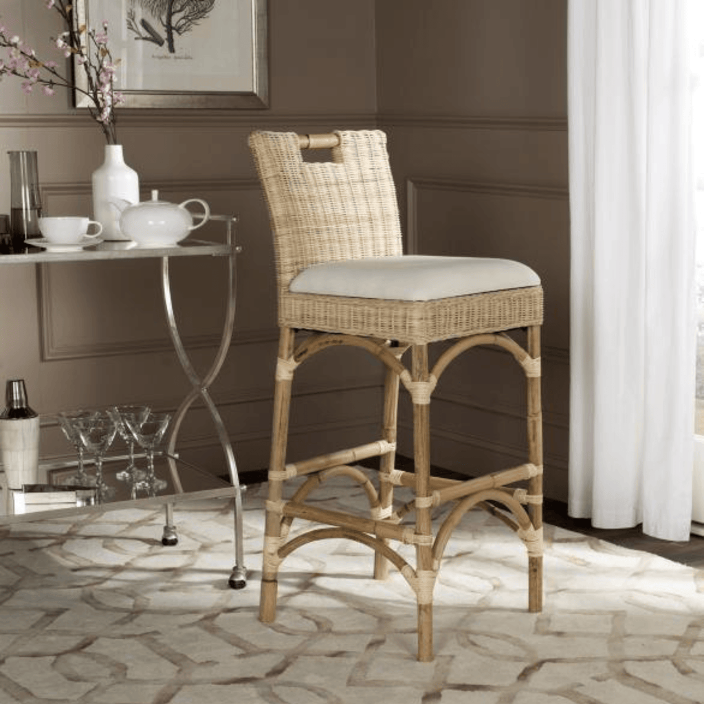 A modern take on classic Thonet design, this white rattan bar stool blends a contemporary seat back with the graceful bentwood curves of traditional European bistro chairs. Finished with a soft white poly-cotton cushion, it offers inviting comfort—perfect for long, relaxed conversations in the kitchen. Click on images for greater detail.