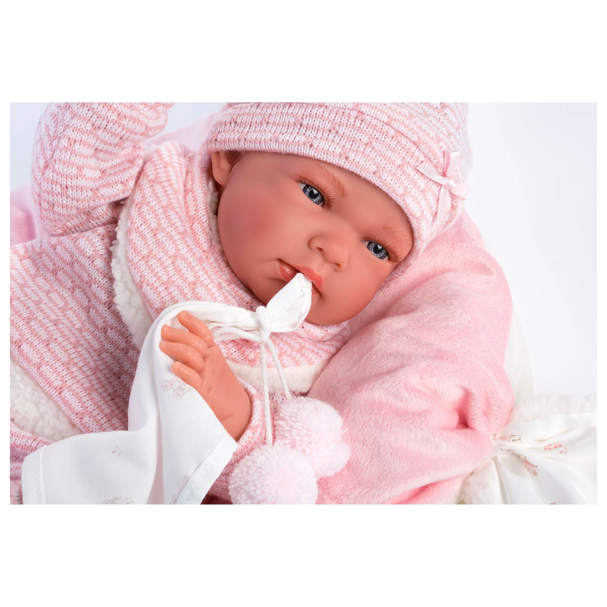 Naomi is a perfect first baby doll. Her small size makes her perfect for toddlers to hold and cherish. She is dressed in an adorable long-sleeve pink and white knit onesie, that includes a knit stocking cap with ribbon. Bright blue eyes and a smooth baby complexion. Adorable baby fingers and toes, baby rolls on belly and legs.
