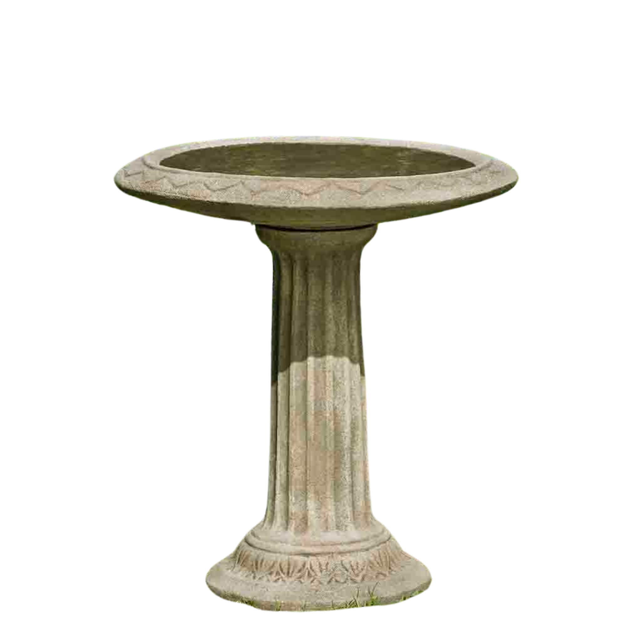 - Care Instructions: We suggest that birdbath/fountain tops not be left outside in the winter. Once the top fills with water/snow and freezes, the top may crack. All birdbath/fountain bases, bench legs and statuary should be raised up off the ground in winter so they will not freeze to the ground surface. Ideally, a fountain should be stored indoors in the winter away from the elements. However, if a fountain bowl must be left outside, remove all pumps, rubber stoppers, drain pipes, finials and small components, and cover the top with burlap or any absorbent material (old blanket/towel) and then wrapped with dark plastic, making sure that water does not accumulate in the basin and freeze. Fountain pumps, finials, and other small components should be stored indoors. Check the fountain periodically to insure that the cover is secure and water is not accumulating in any fountain component.