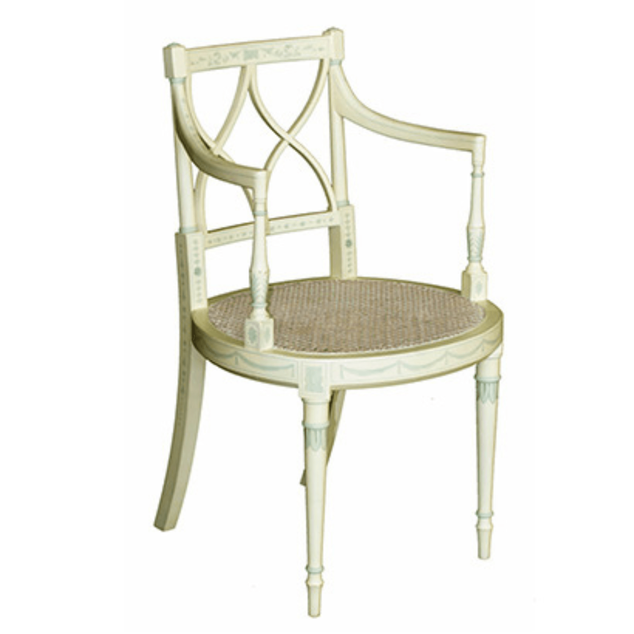 This sophisticated French Country style dining chair features a cane seat and light blue accents. The craftsmanship is exquisite. Click images for greater detail.