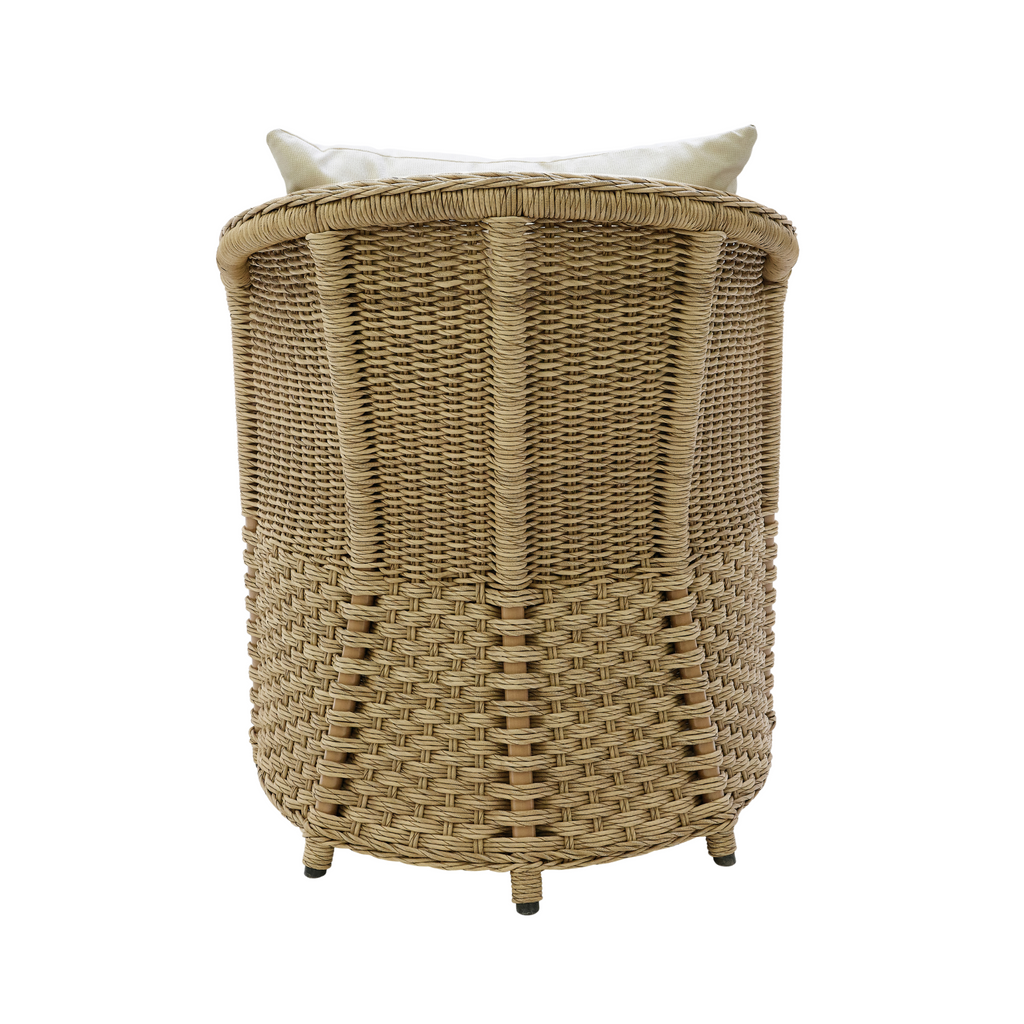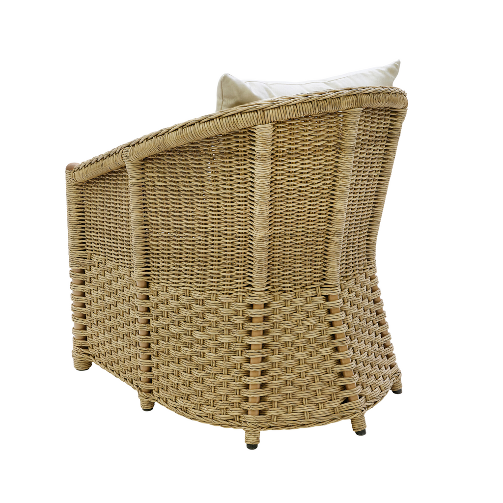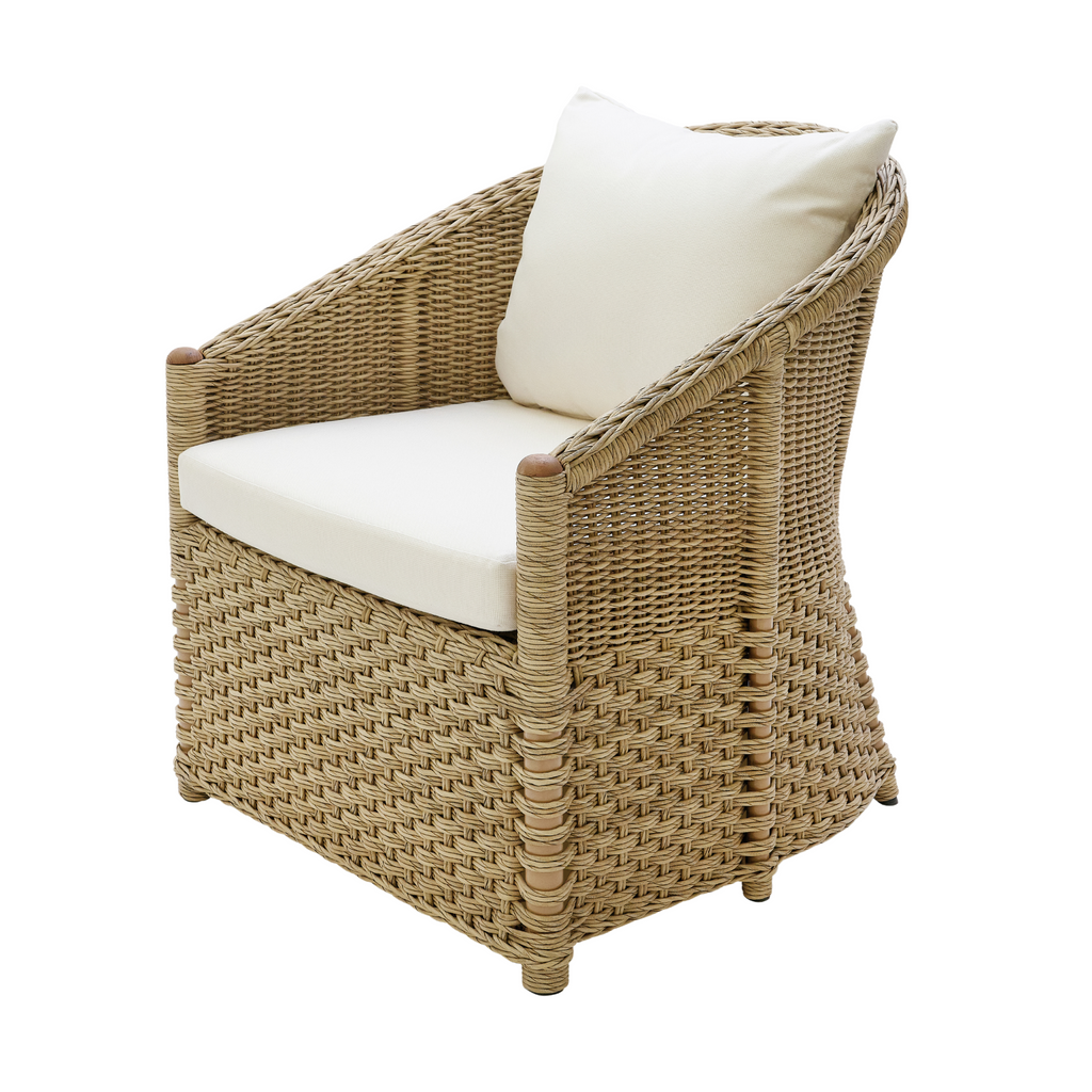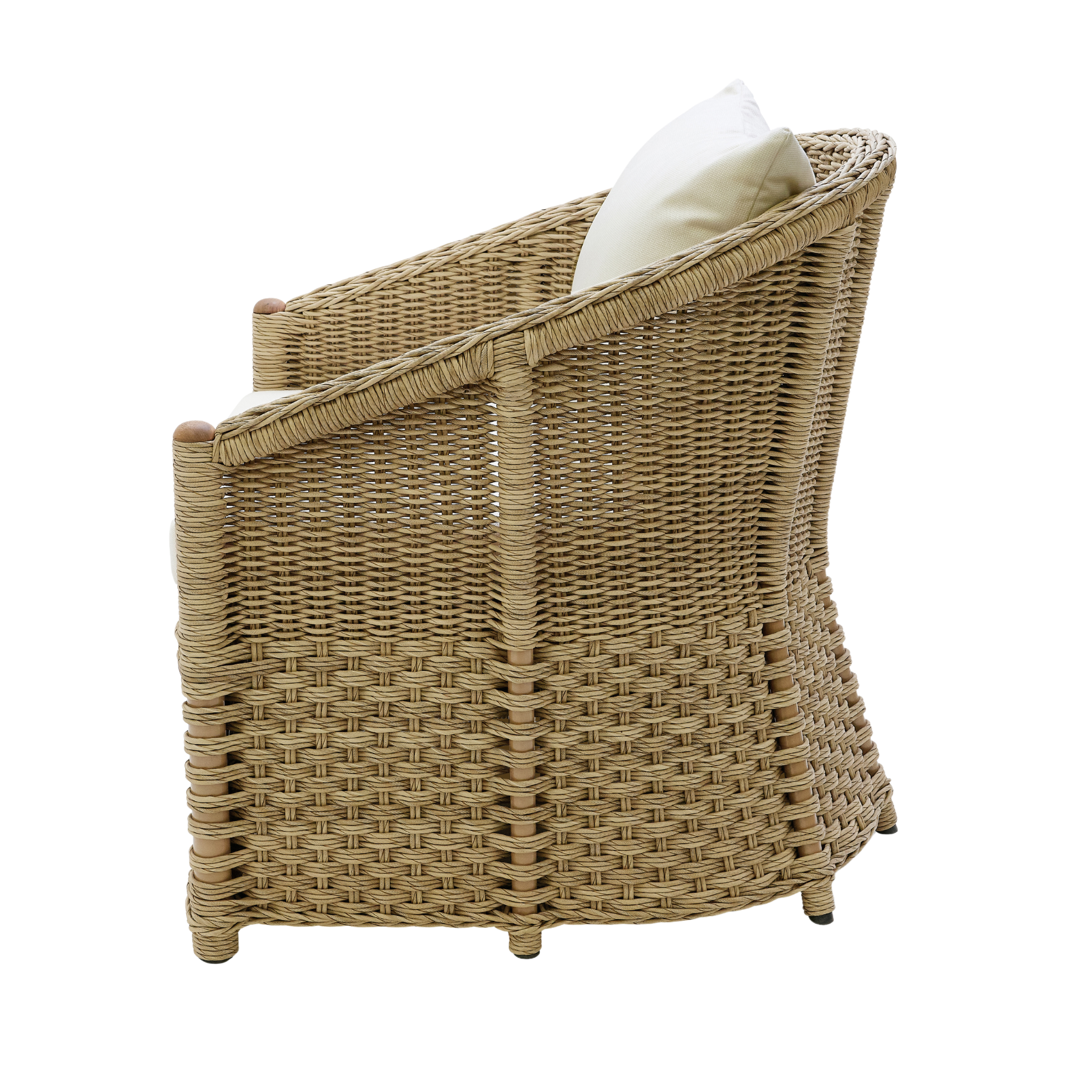 Inspired by the form a of traditional crofter’s chair, our new all-weather wicker group has a fantastic, indoor-outdoor finish with a textured hand. A curved back, with canted supports, is surrounded by a tight, smaller wickerwork weave that descends into larger, check-patterened weave along the apron; the arms each have a teak end cap.
