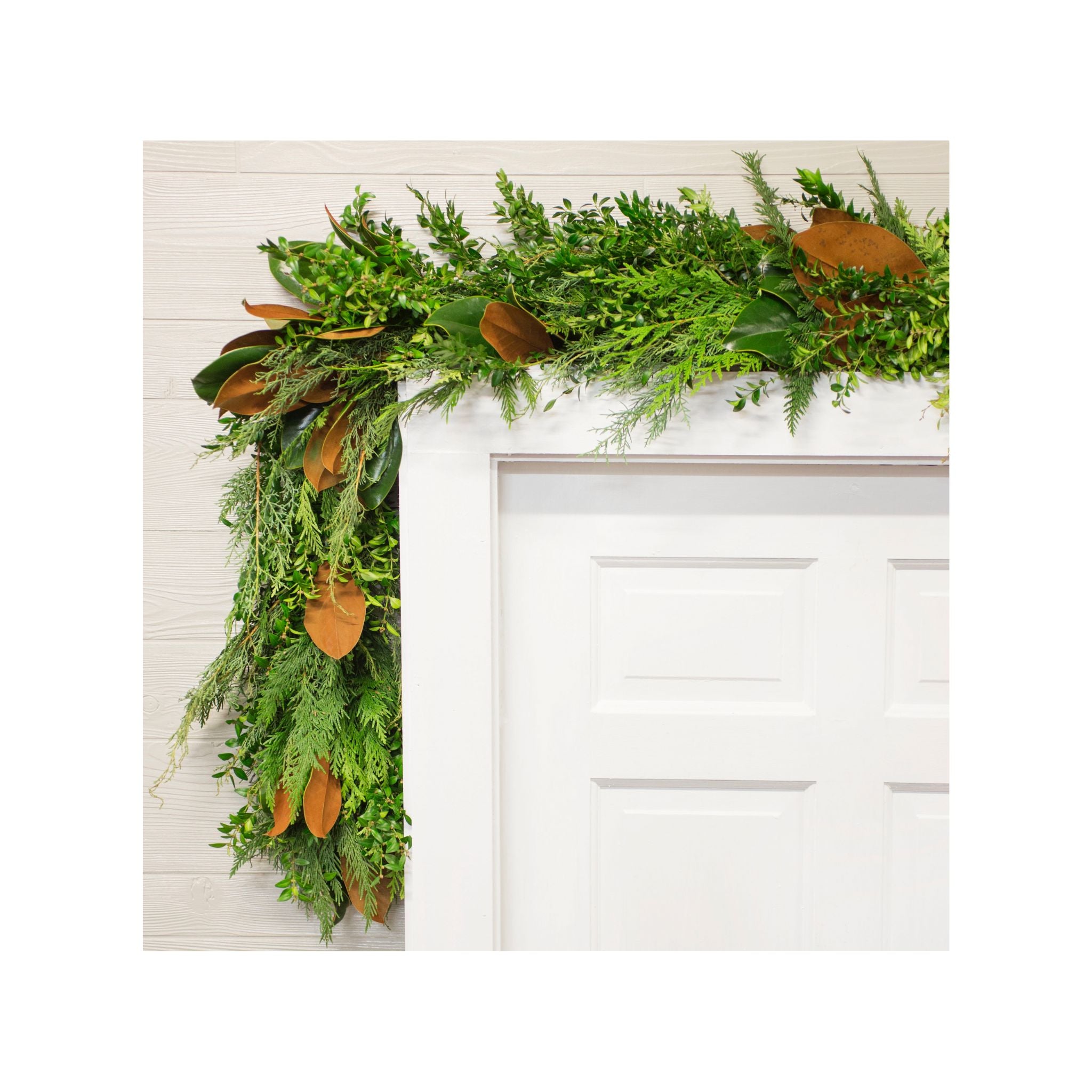Copper and green leaves cut from the farm and hand woven into a cascading classic garland with Cypress stems. Easy to hang and enjoy while trimming your home. Each fresh garland is individually packaged and boxed in its own tray.