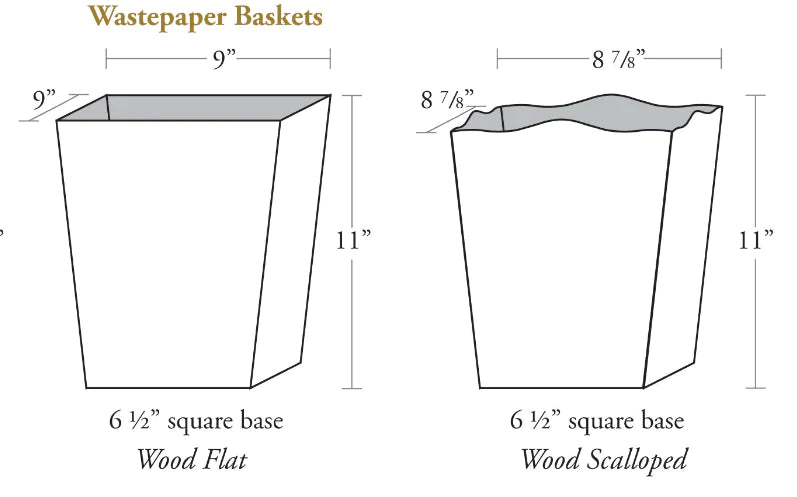 • Overall the wood scalloped top wastepaper basket measures approximately  8 7/8''W x 11''. Wood flat top measures 9''W x 11H. Tin scalloped top 10 1/2''W x 12 1/4''H.