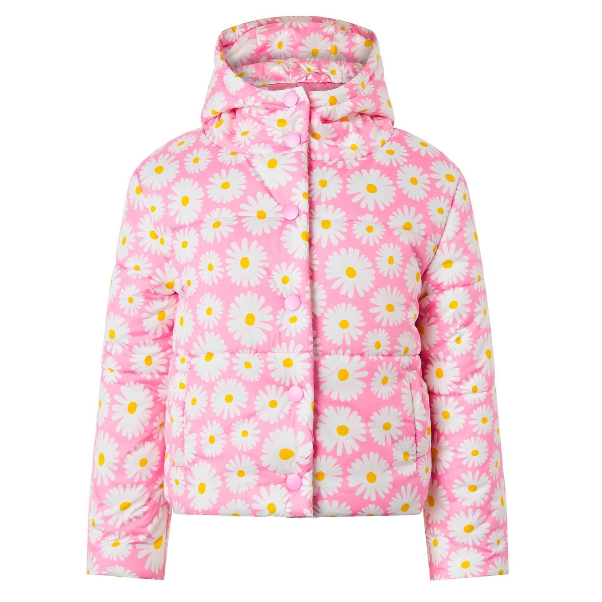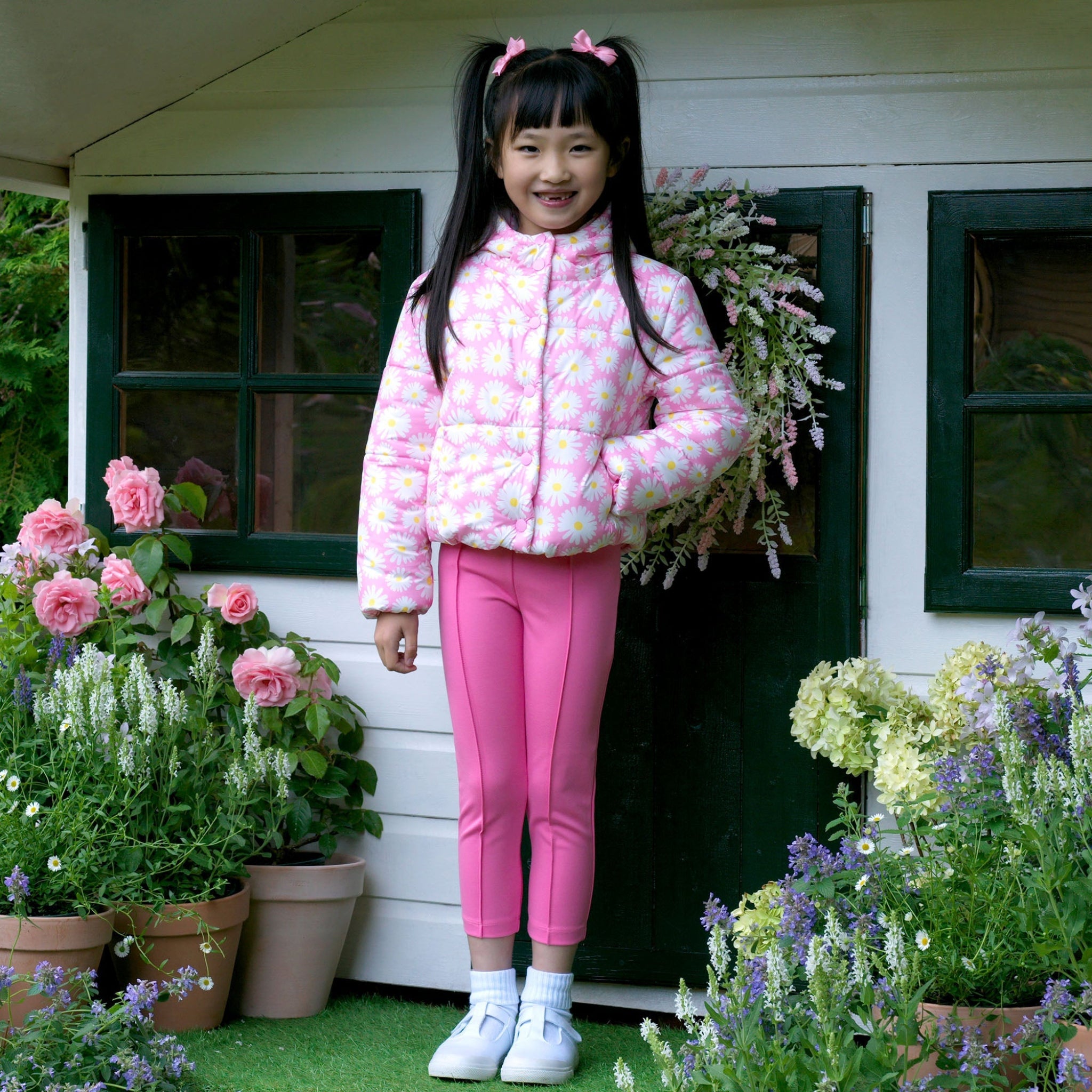 Add a pop of color to your little girl's wardrobe with our Daisy Puffer Jacket. This sweet pink jacket features a hood and a playful daisy print in soft ivory and yellow hues. Perfect for cooler days, your little one will be both stylish and cosy.