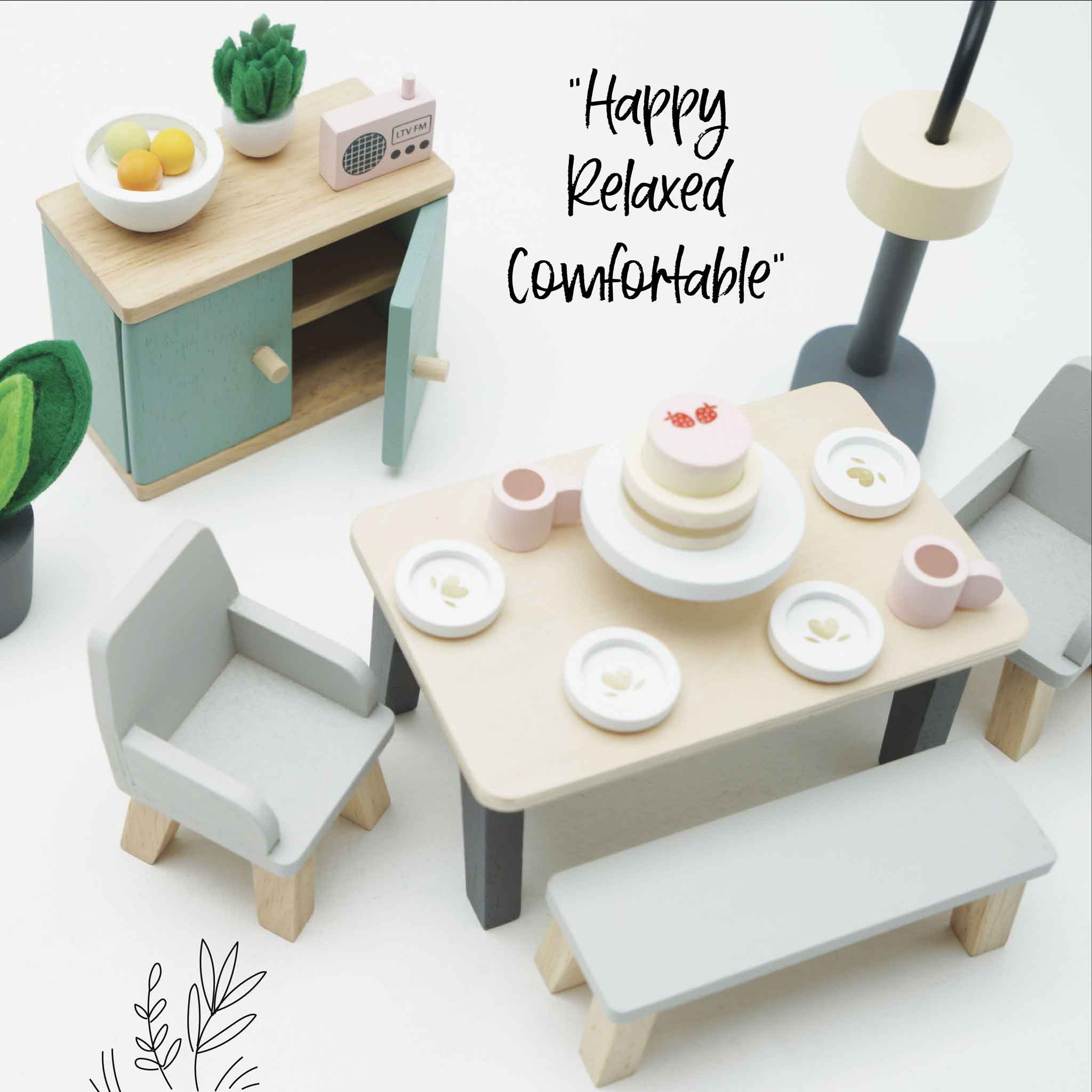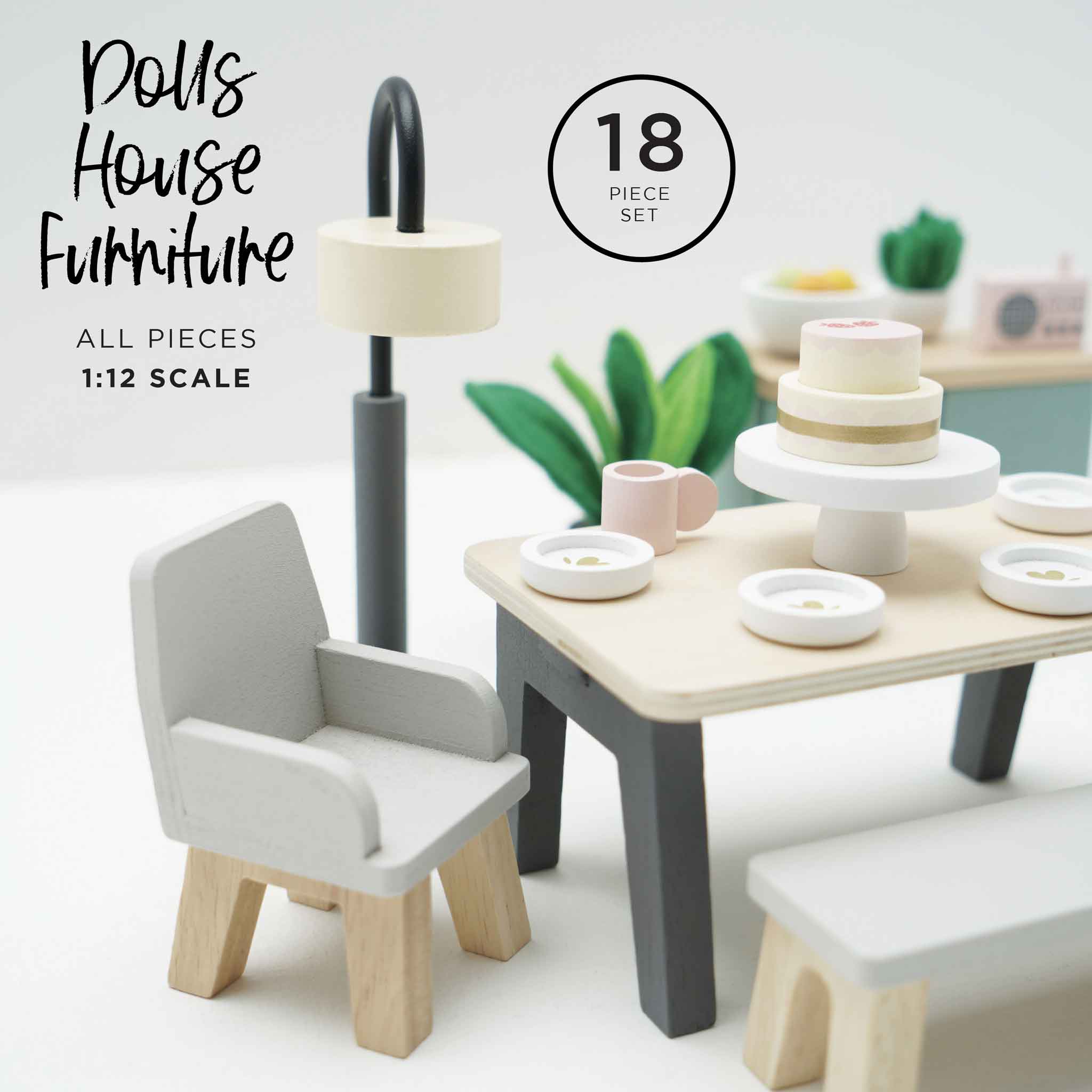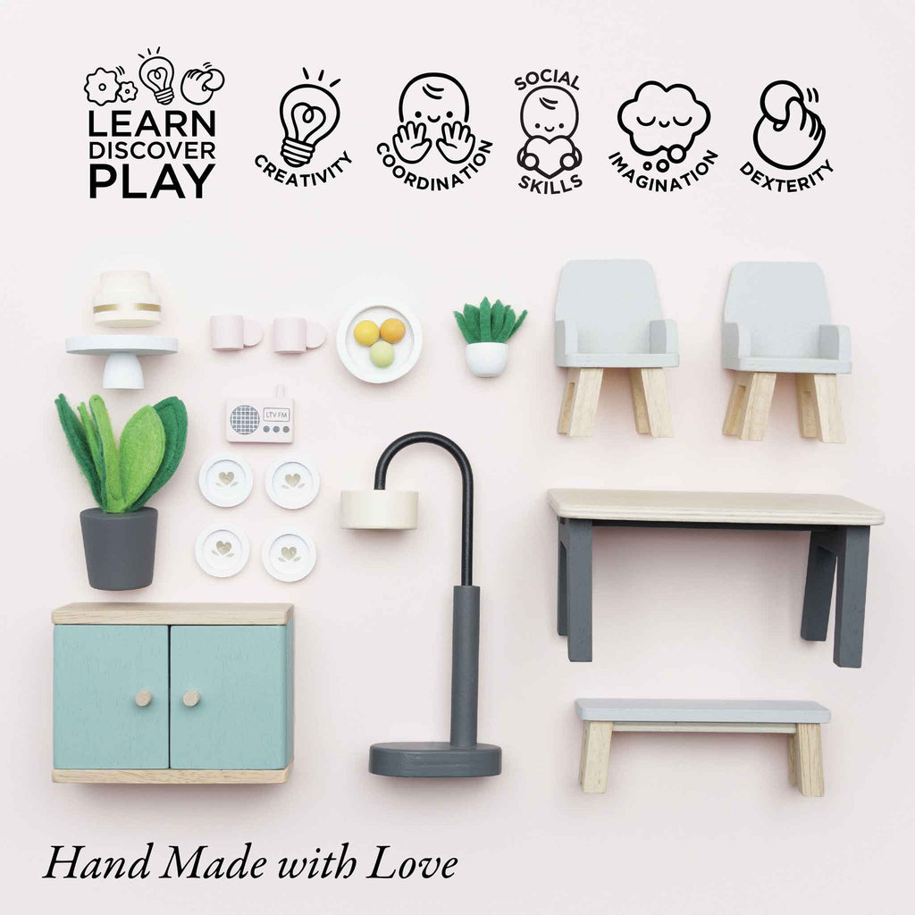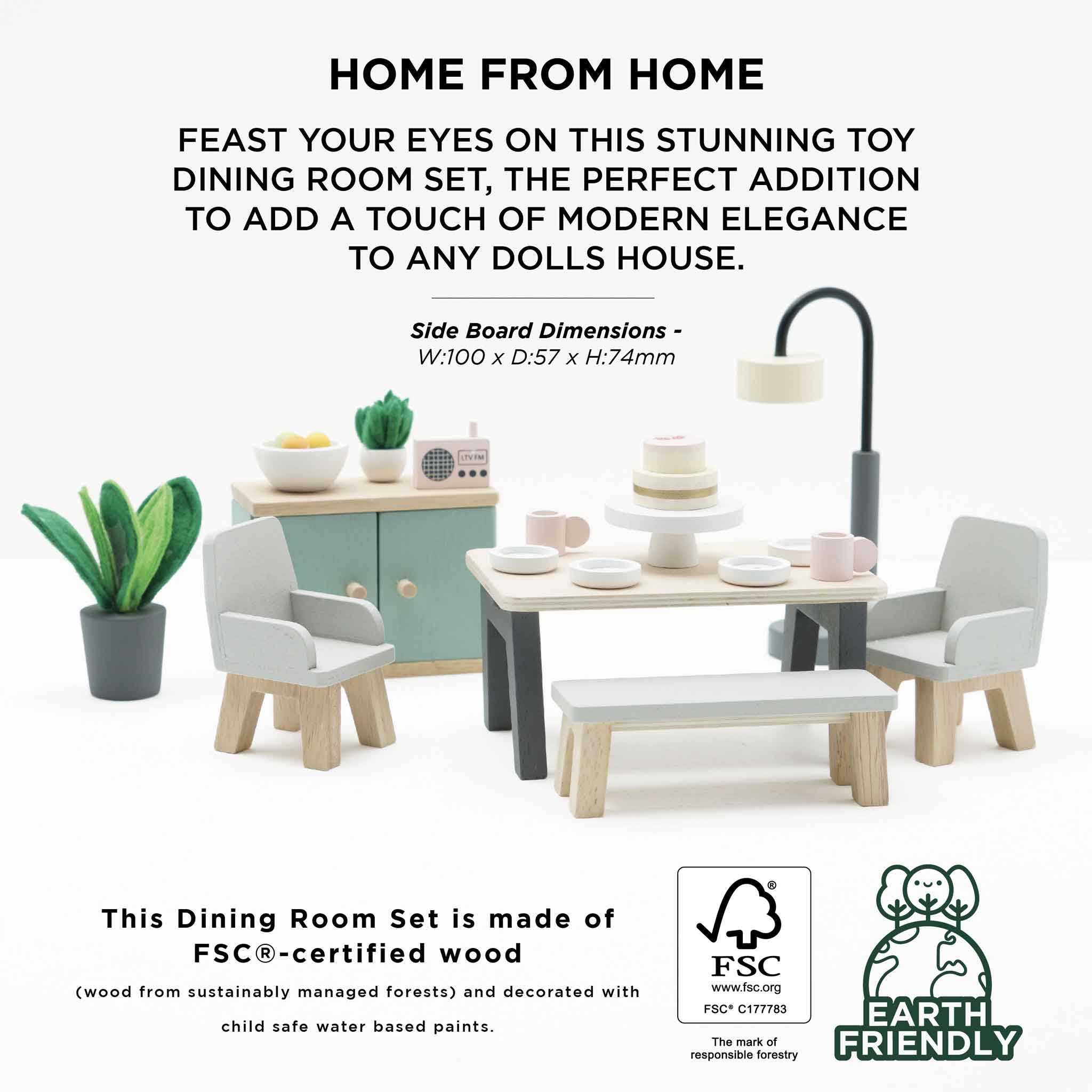 Feast your eyes on this stunning toy dining room set, the perfect addition to add a touch of modern elegance to any home of miniature. Stylish and sustainable, this 18 piece set is made from FSC® - certified wood and features; a smart wooden table with two co-ordinating chairs plus a bench, a free standing lamp, sideboard, 2 pot plants with realistic felt leaves, a fruit bowl complete with wooden fruit, a radio and, to top it all off, 4 dinner plates, cups and a showstopper cake arranged on a stand – the perfect table centrepiece to tempt little dinner guests. This sweet set is compatible with our full range of stunning dolls houses.