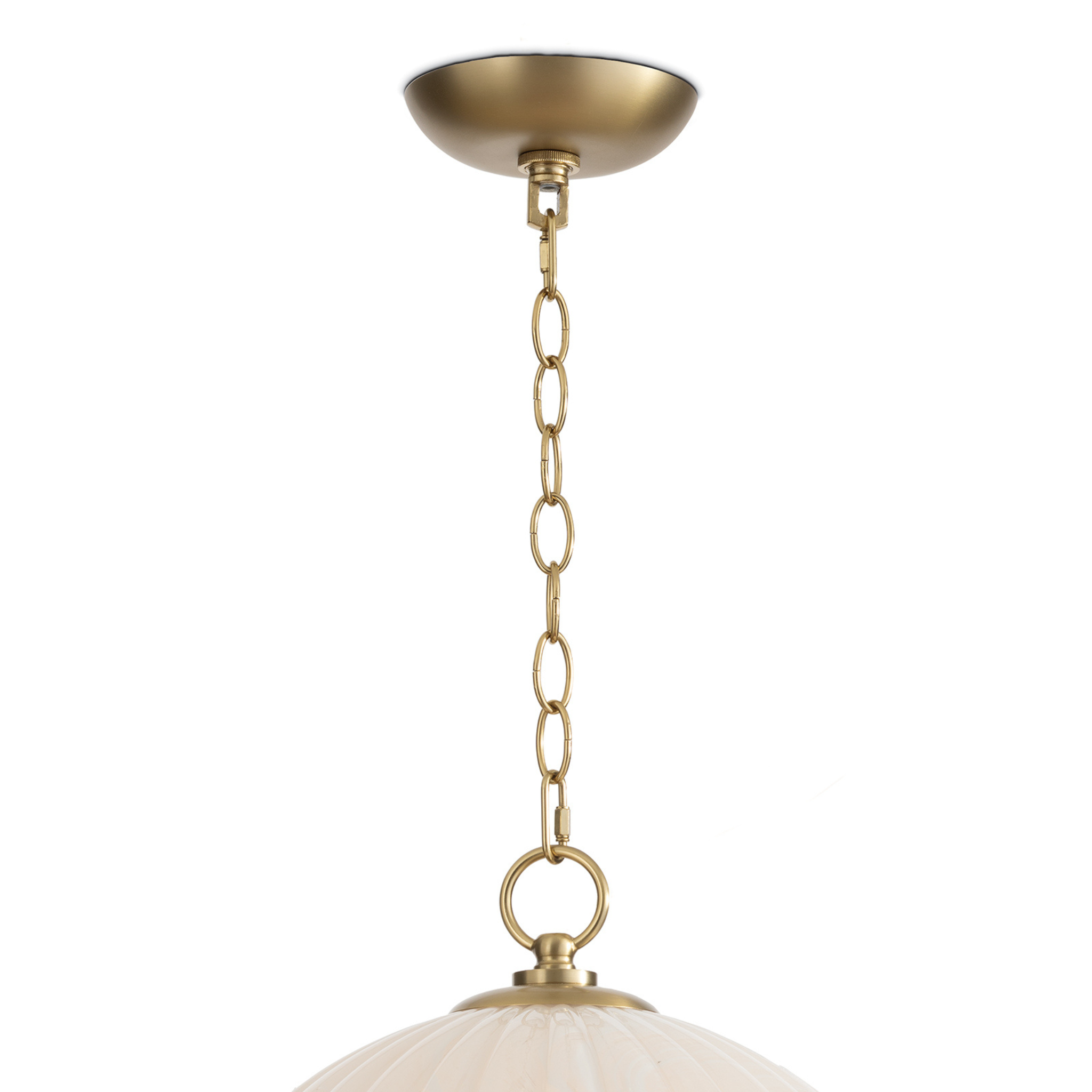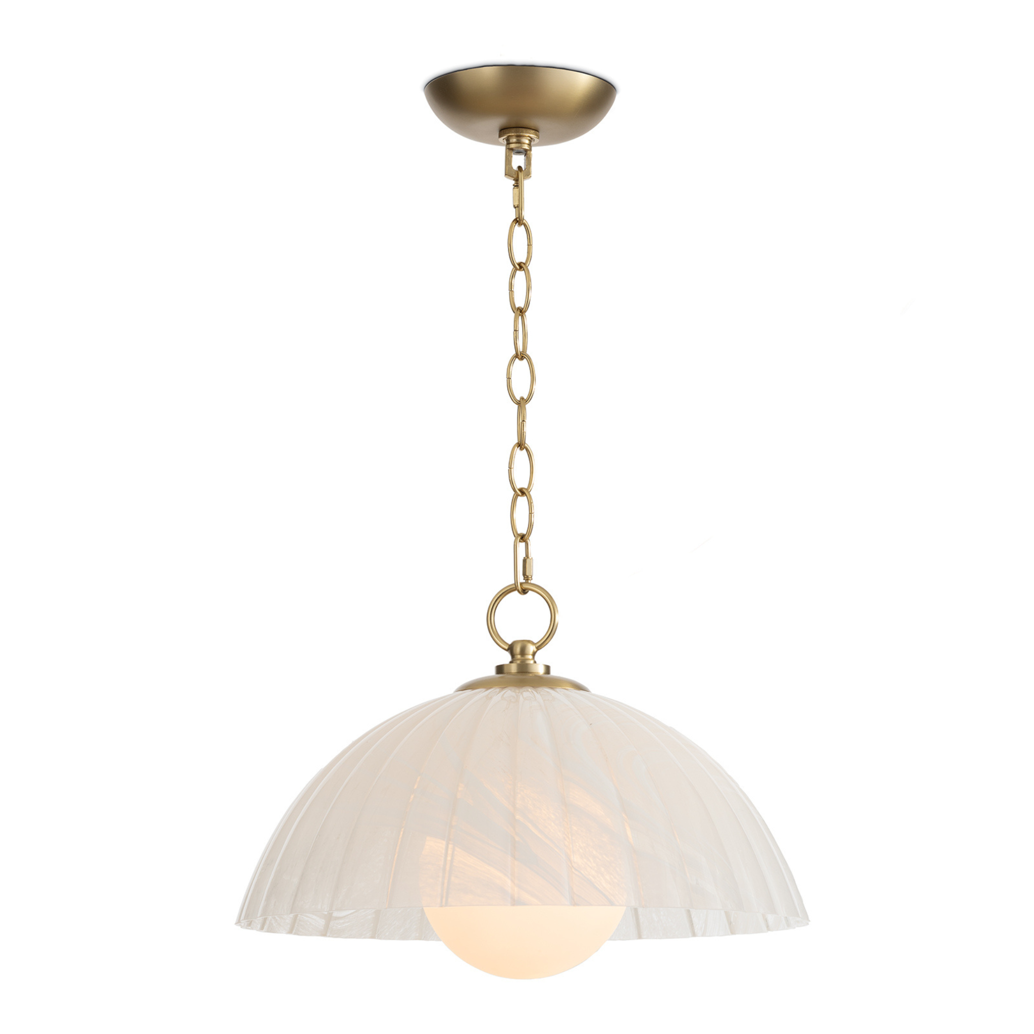 A timeless masterpiece that blends classic elegance with modern sophistication, the Dariel Glass Pendant is a versatile glass dome fixture featuring luxurious natural brass chain and accents. The glass shade has a mesmerizing swirled pattern, adding a touch of intrigue and casting an inviting glow wherever it illuminates