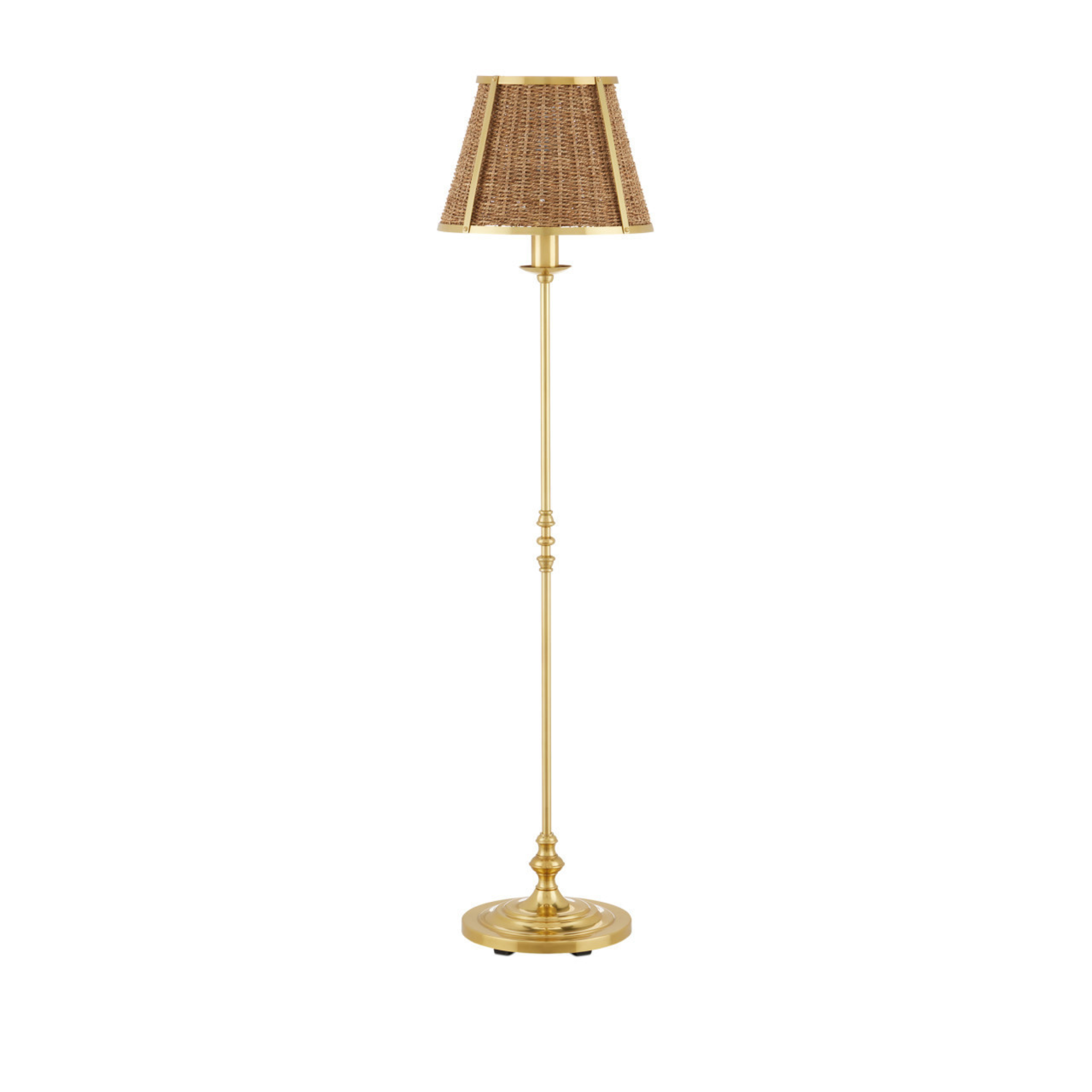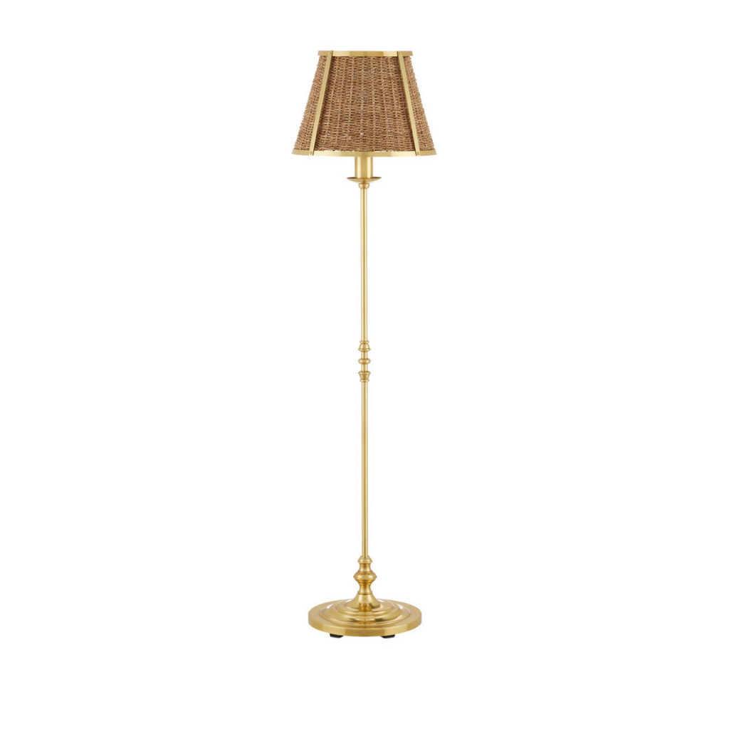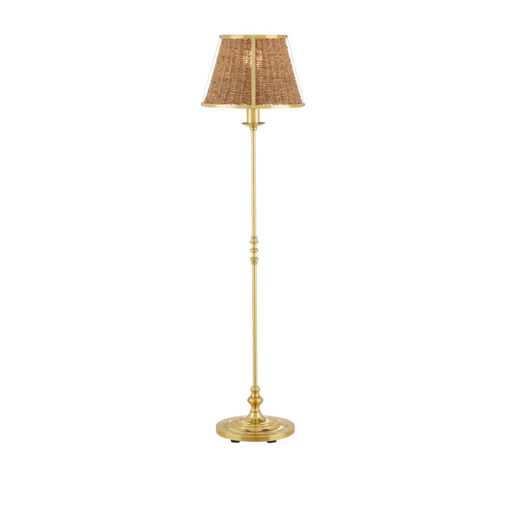 The Deauville Floor Lamp was created by Suzanne Duin, who founded the Houston shop and design studio Maison Maison, and is known for a keen eye in sourcing authentic French antiques and home accessories from around the globe. The Deauville an example in natural seagrass and steel in a polished brass finish. This tailored floor lamp trimmed in gold brings both texture and French flair.