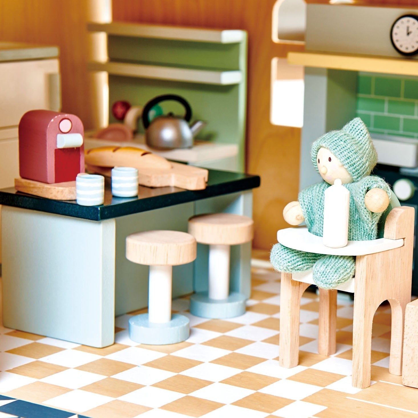 A Contemporary stylish kitchen set, with great attention to detail, Includes: island unit and 2 bar stools, A range style oven unit, fridge, butler sink unit, hand towel, kettle, fish pot, coffee machine with cups, 2 plates, recipe books, baguette on a chopping board, and a tray of freshly baked muffins. Suitable for all the wooden dolls houses, as scaled to 1:12.