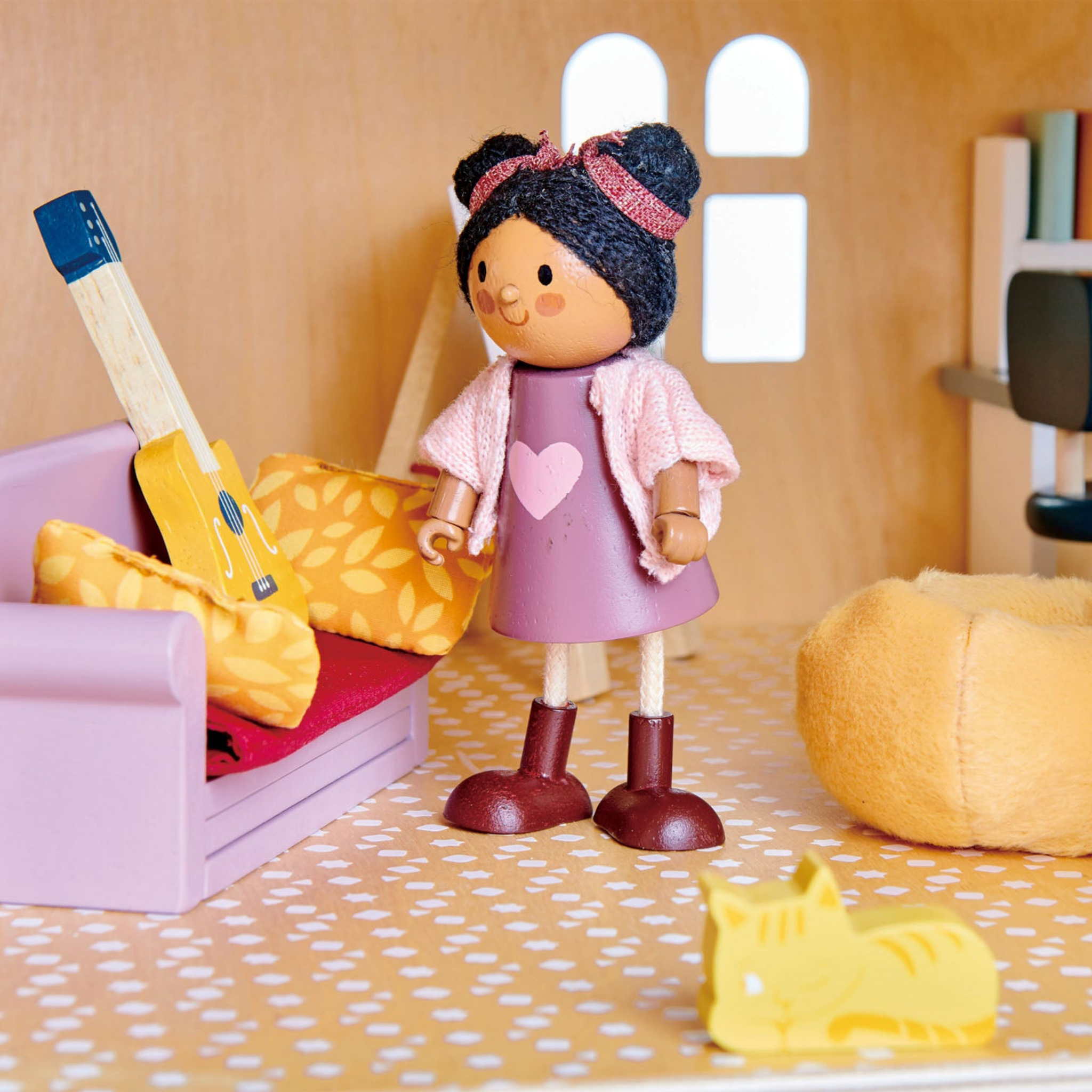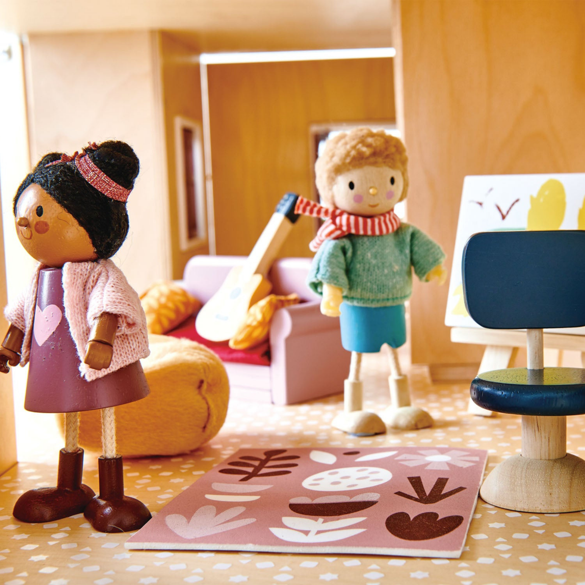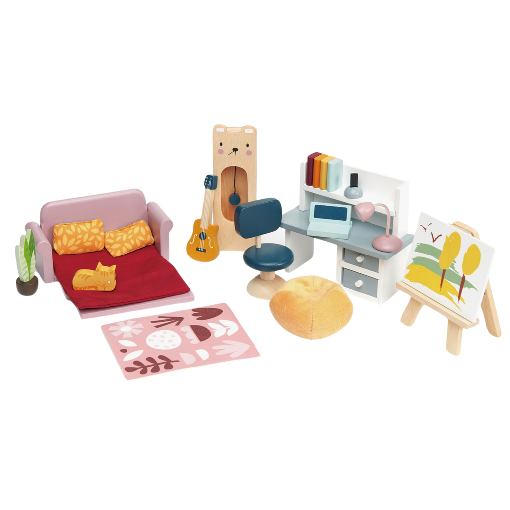 A stylish swivel office chair, desk, mobile phone holder, a laptop computer, an anglepoise lamp, 4 books, pull-out sofa with mattress and 2 printed pillows, guitar, cat, bean bag, wooden easel with landscape painting, pot plant, pretty printed rug, and a sweet bear standard clock.