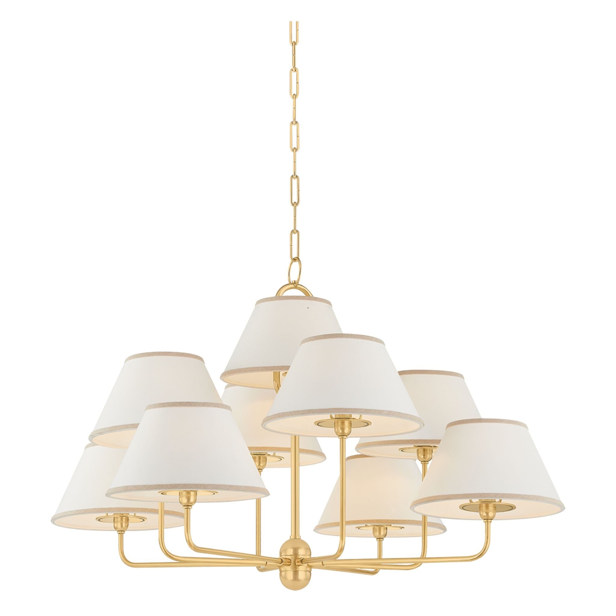 A vintage-inspired silhouette is elevated through thoughtful details in this transitional family. Arranged at varying heights, the overscale white linen tapered shades create a voluminous effect, like a sail billowing in the wind. Ivory trim provides subtle visual interest while remaining fresh and neutral. The frame is finished in Aged Brass with rounded right angles that keep the design feeling soft.