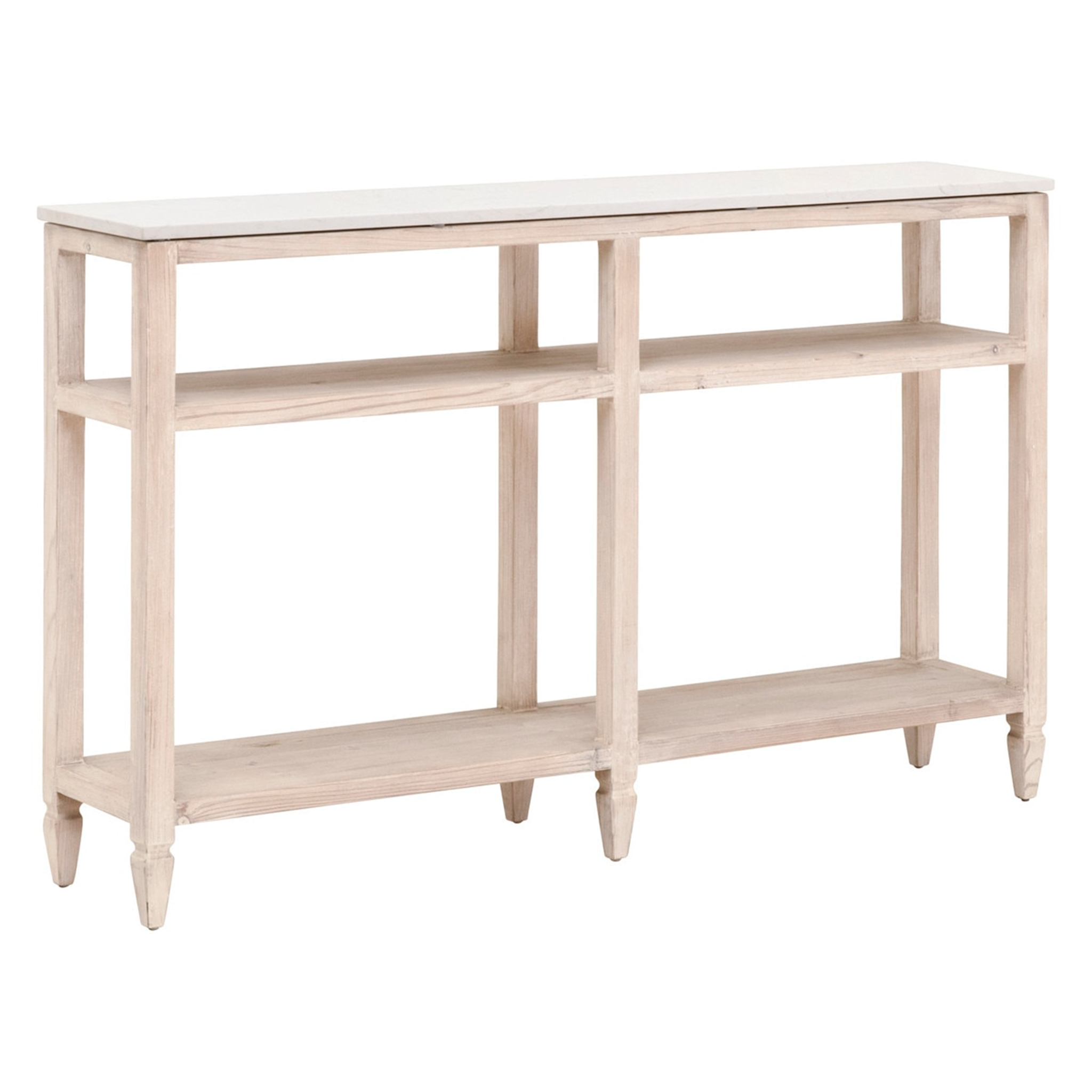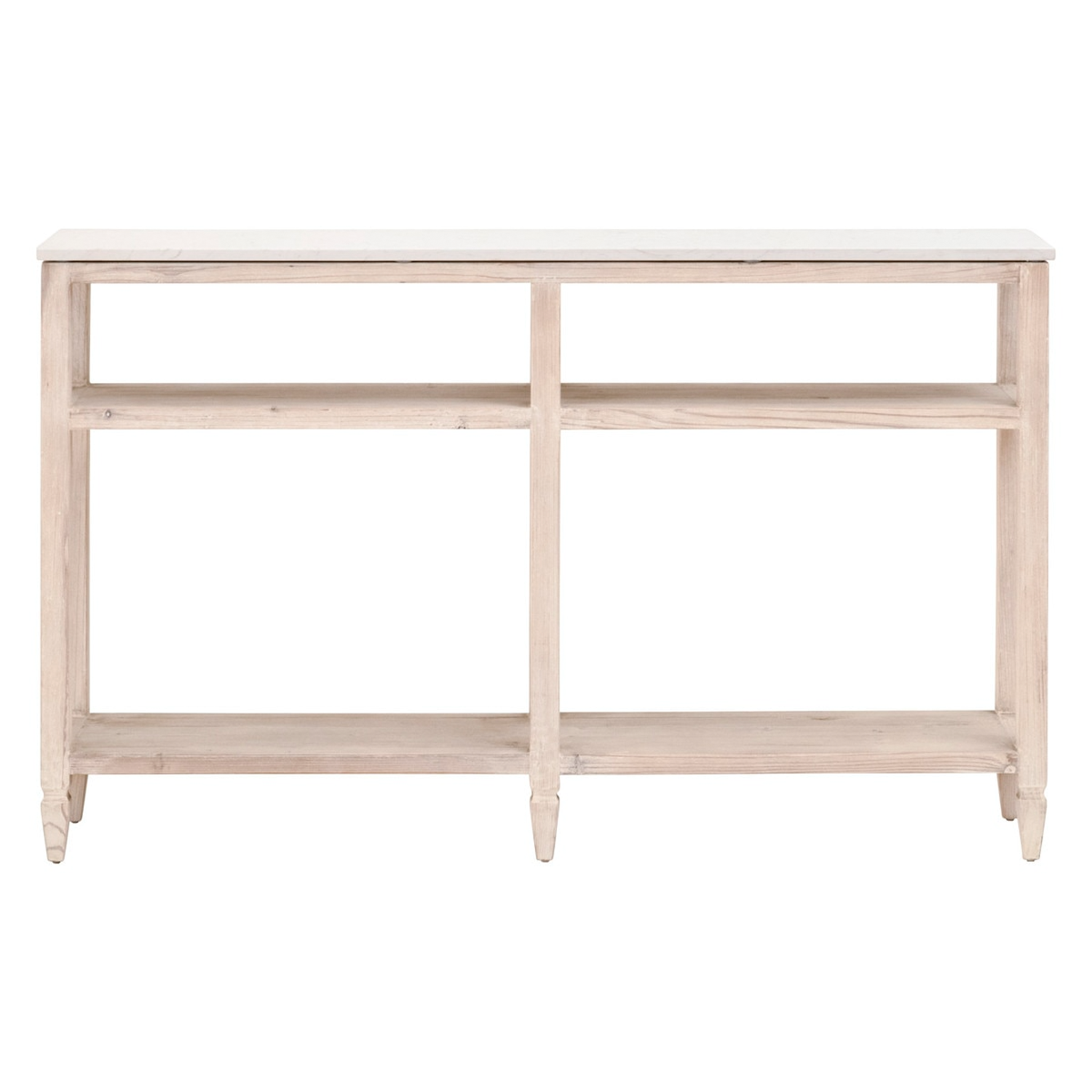 The Emerie Narrow Console Table is crafted from natural quartz stone and reclaimed pine wood. It includes a durable quartz slab top that has a marble look and two shelves.
