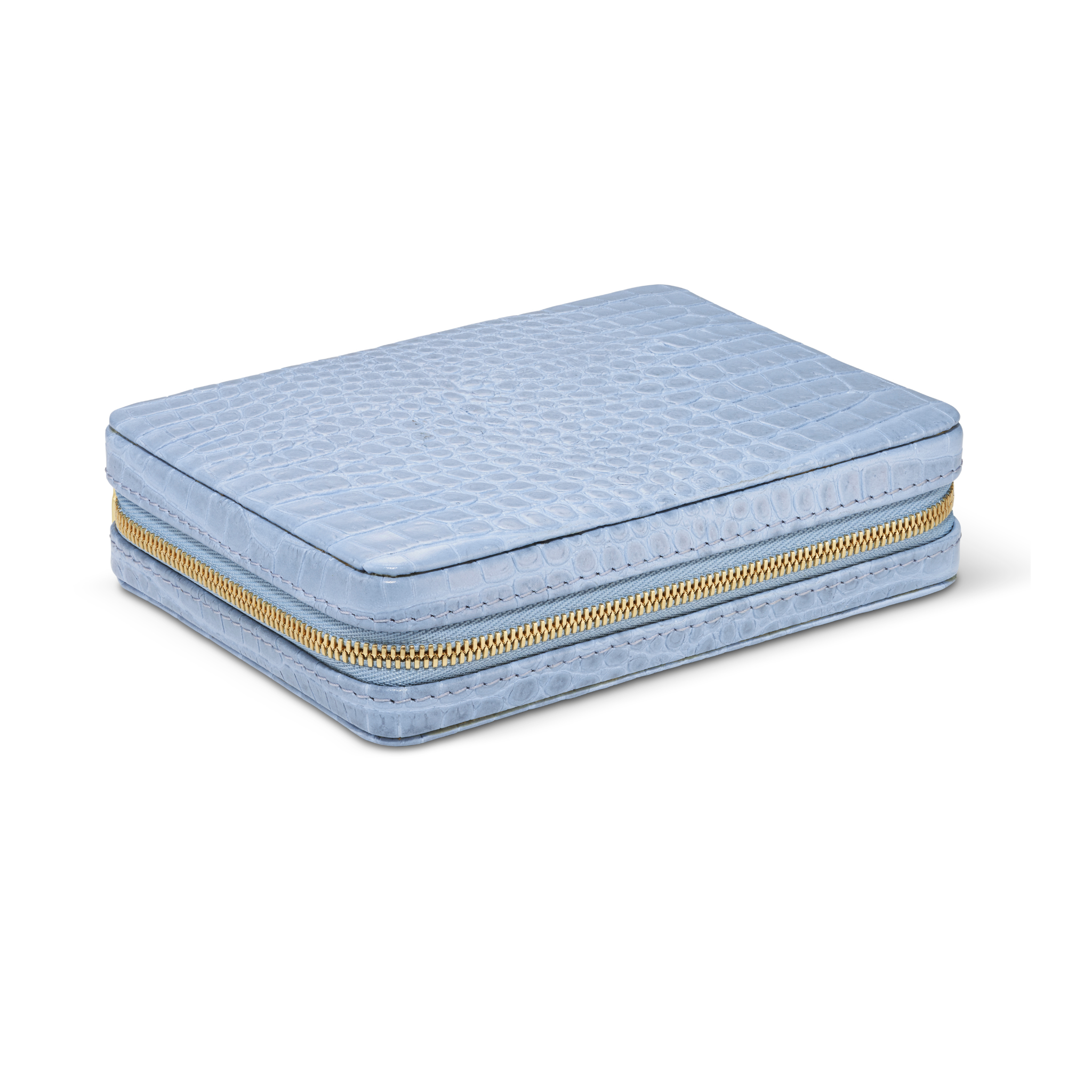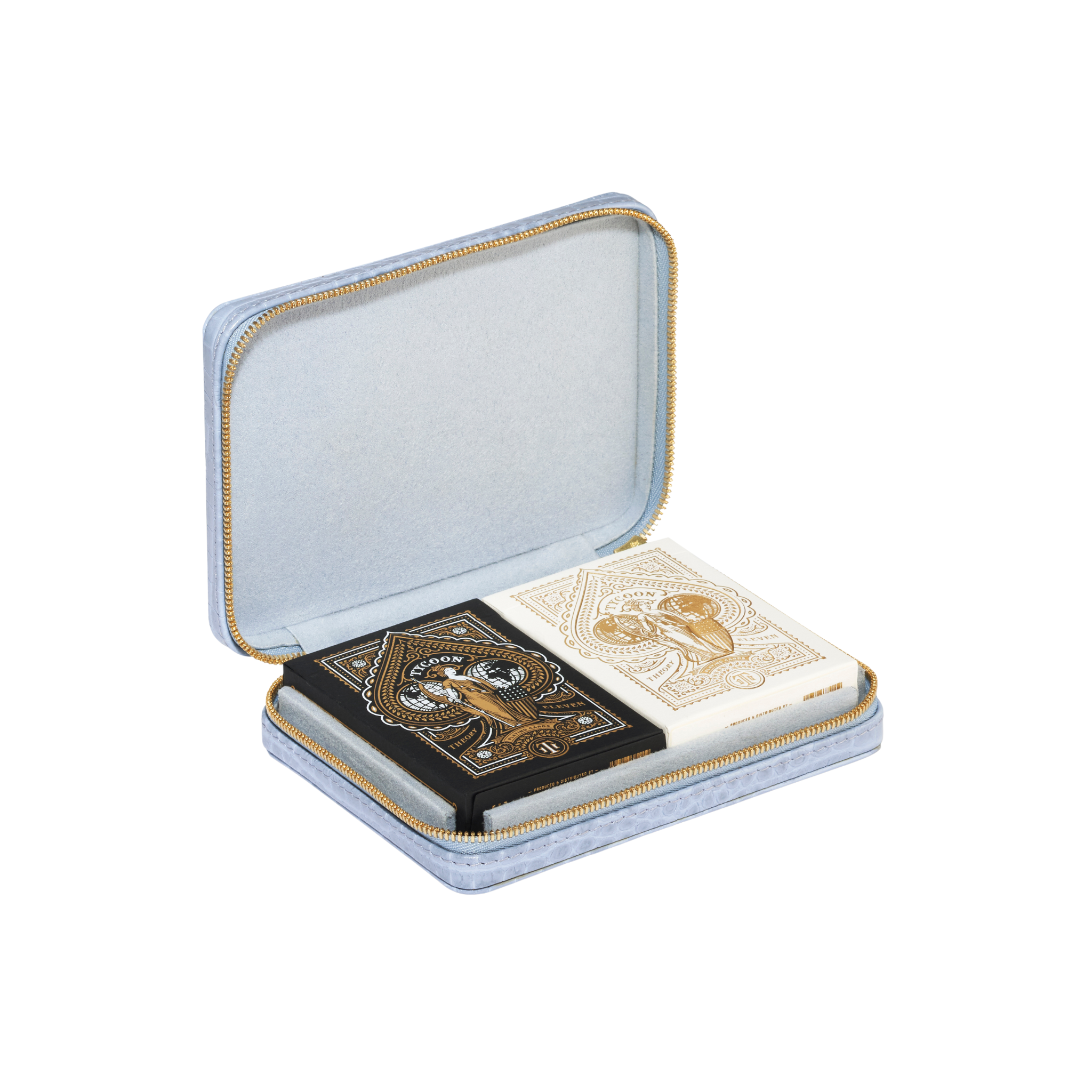 The Enzo Travel Card Set conveniently holds two sets of playing cards for travel or to store at home. The attractive case, crafted in Italian Croc Embossed Leather with a zipper, can be stored in a carry-on bag, on a tabletop, or a bookshelf.