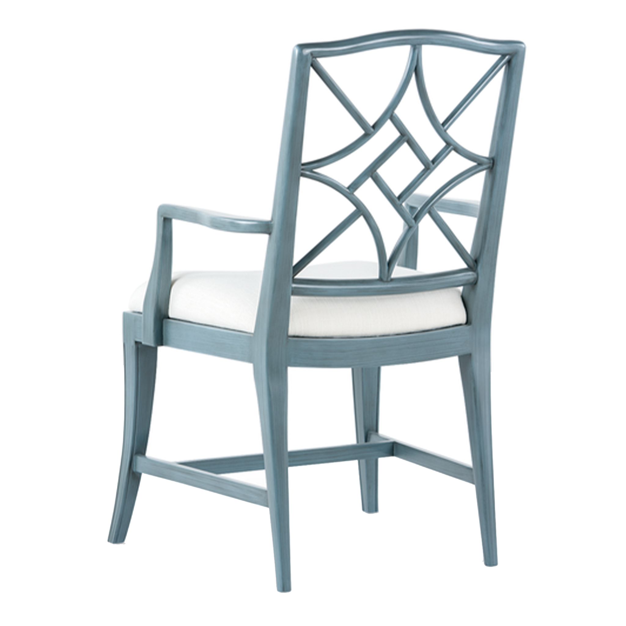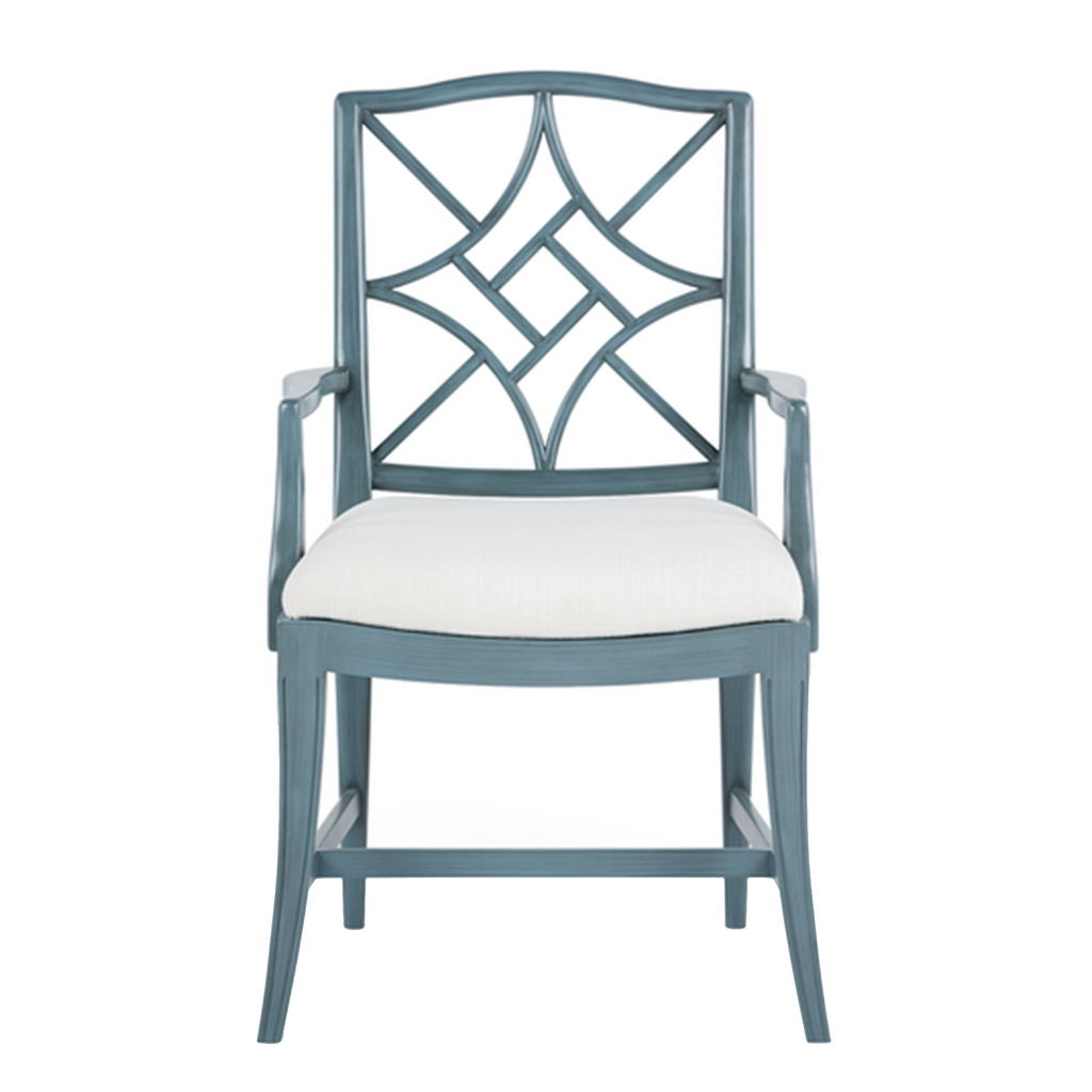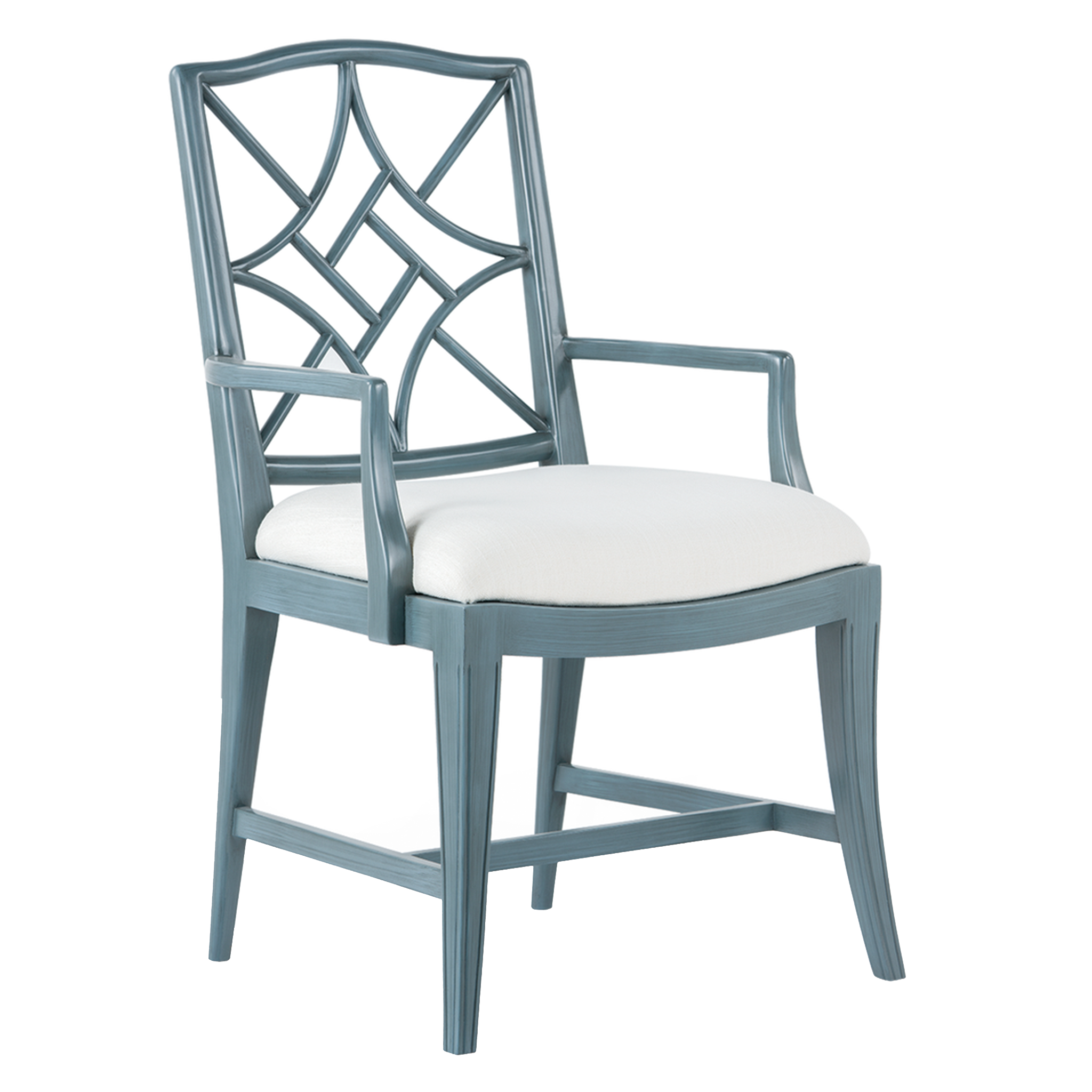 The Evelyn Armchair brings a relaxed take on Chippendale chinoiserie, with intricate fretwork, curved lines, and fluted legs. Crafted from lacquered mahogany and finished with a linen drop-in cushion, it blends Eastern elegance with country charm for timeless dining style.