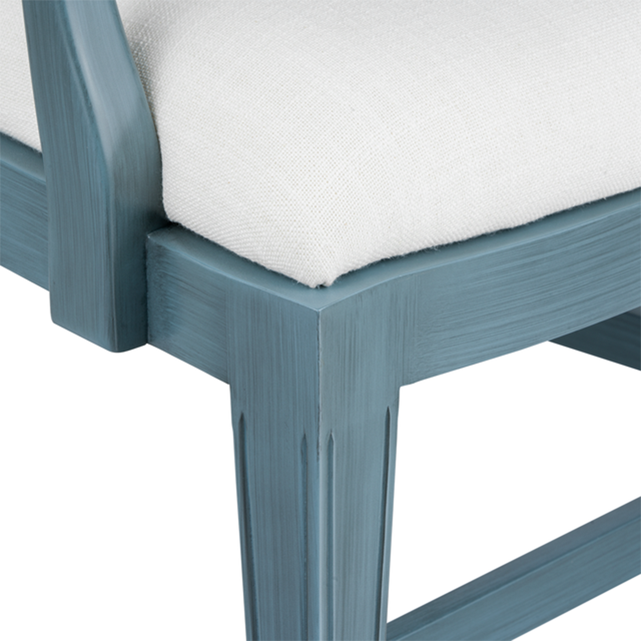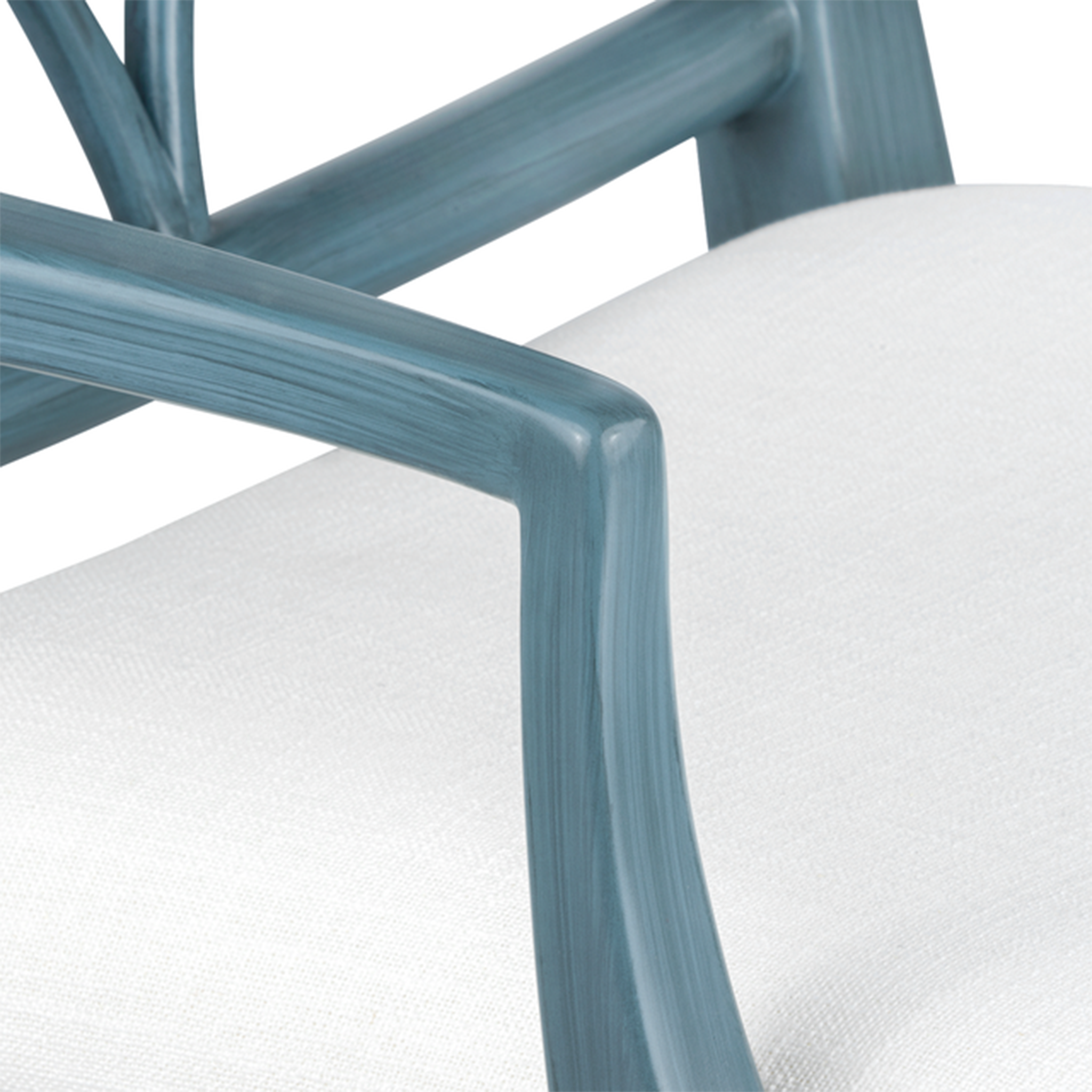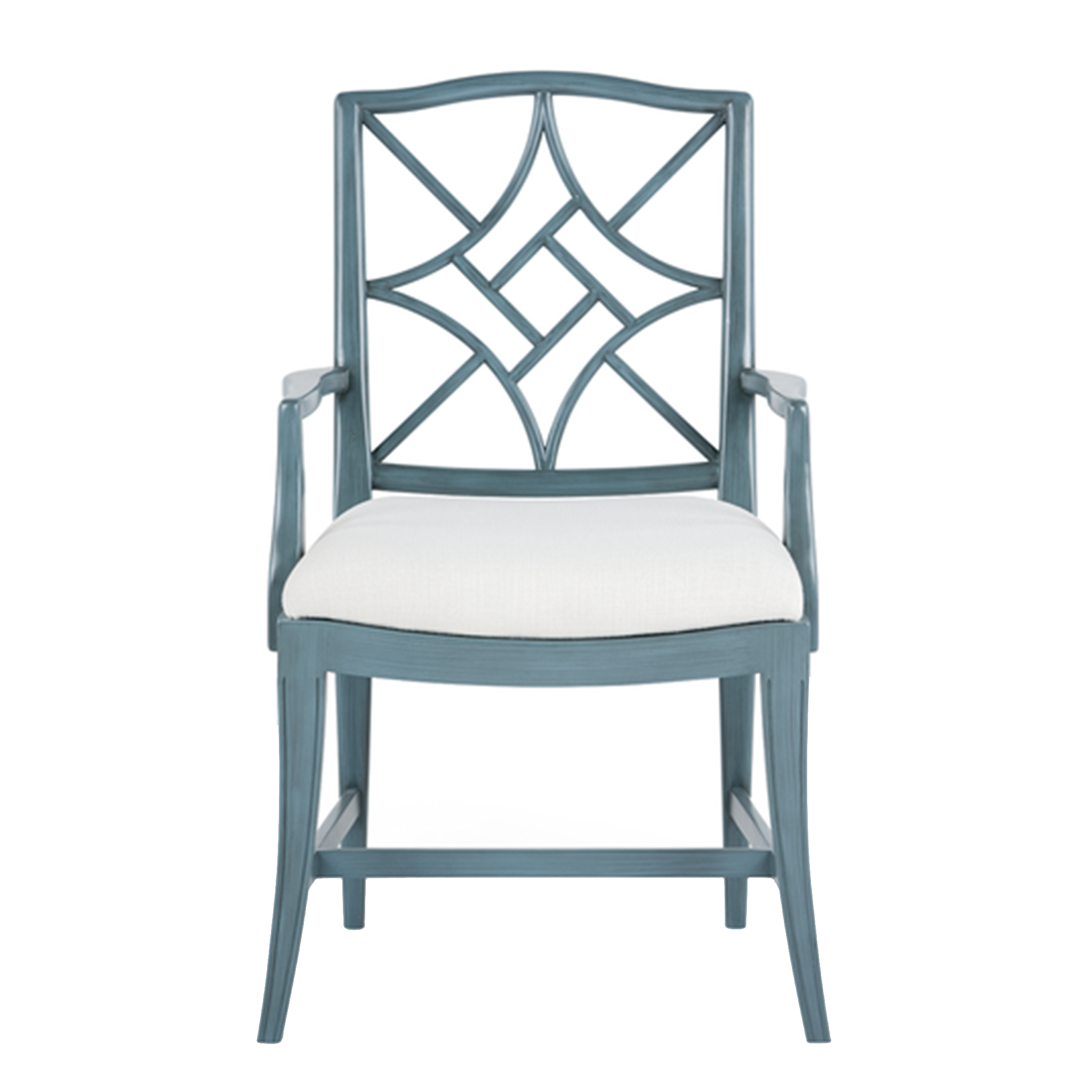 The Evelyn Armchair brings a relaxed take on Chippendale chinoiserie, with intricate fretwork, curved lines, and fluted legs. Crafted from lacquered mahogany and finished with a linen drop-in cushion, it blends Eastern elegance with country charm for timeless dining style.