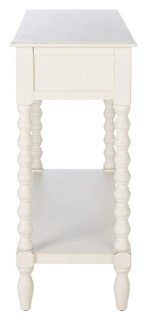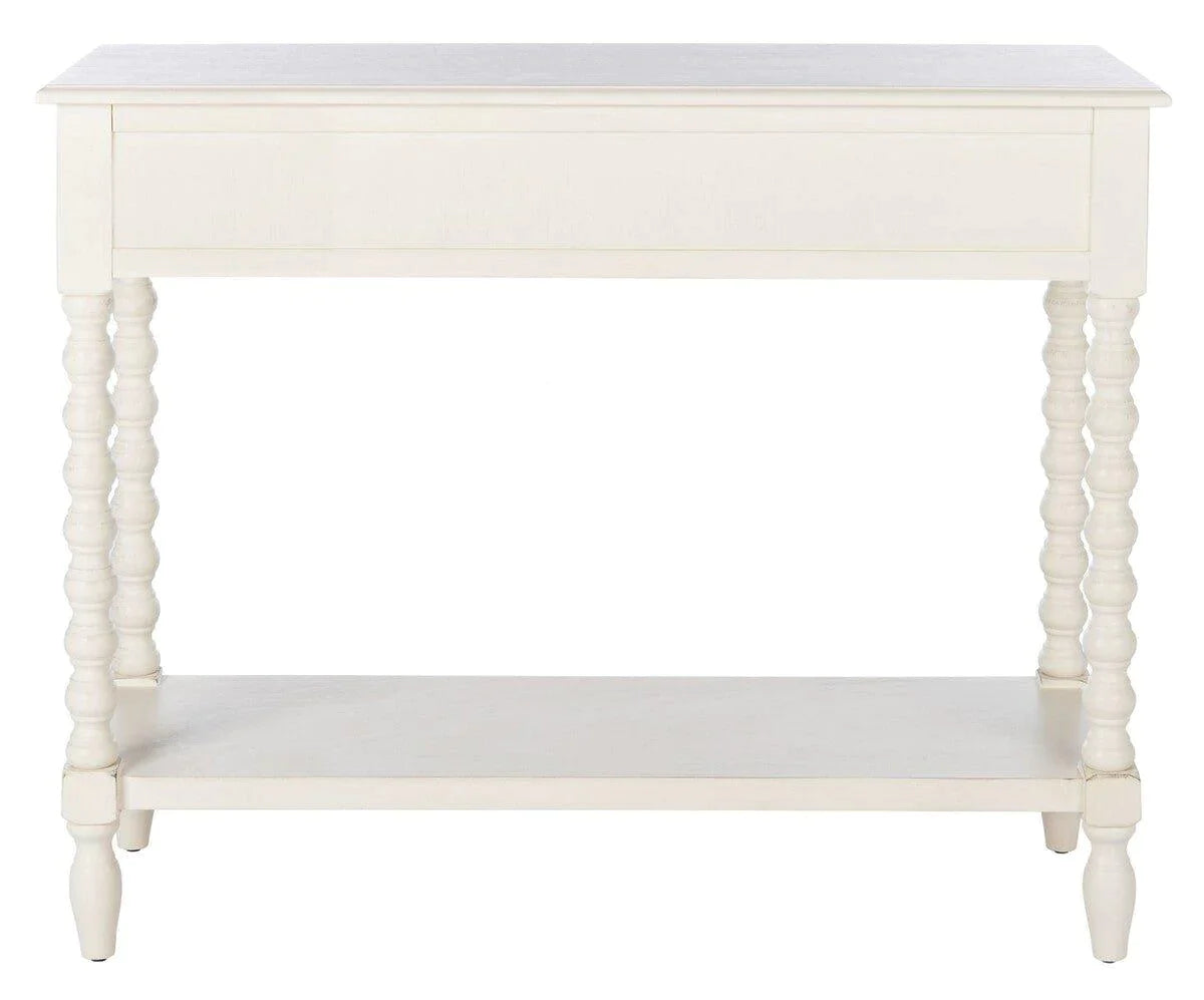 Bring farmhouse charm to any classic contemporary décor with this console table. The modernized ball turned legs are beautifully highlighted by its distressed white finish, while an open bottom shelf and twin slim drawers provide ample storage and display space.