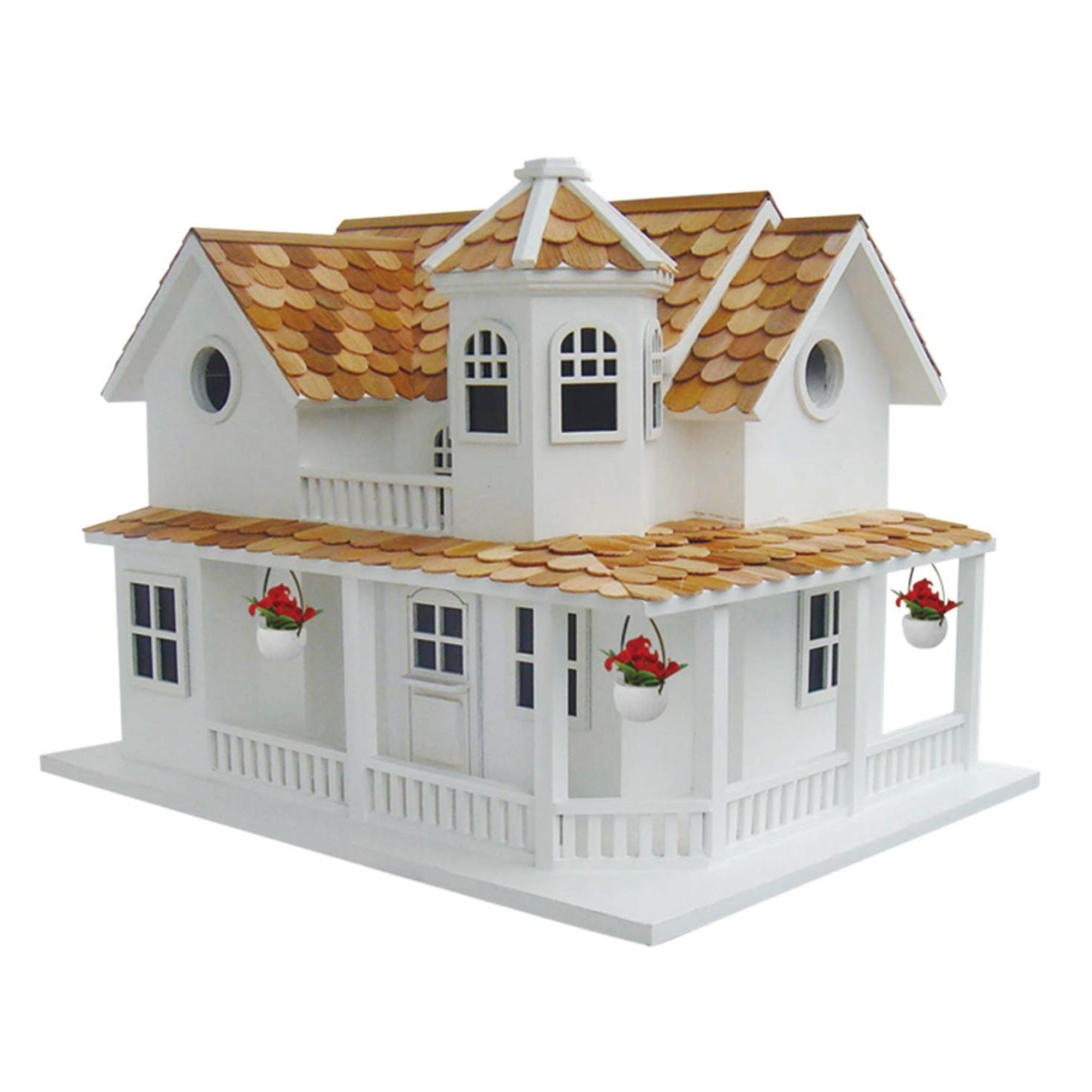 Such an inviting farmhouse cottage birdhouse with a beautiful wraparound porch. The western red cedar shingled roof, including a turret, are the standout features of this birdhouse. Three hanging flower baskets adorn the porch. There are two separate nest boxes separated by an interior wall. A removable back wall, drainage, ventilation, an unpainted interior.