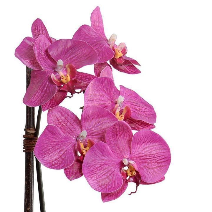 These premium blooming flower stems of the classic Phalaenopsis plant are planted by hand into a contemporary white ceramic vase. Two faux fuchsia stems are attached to natural black bamboo, with artificial pre-shaped leaves at the base of each stem. Delicately arranged by hand in our North Carolina workshop.