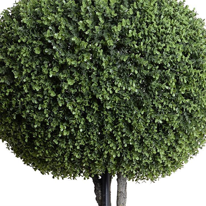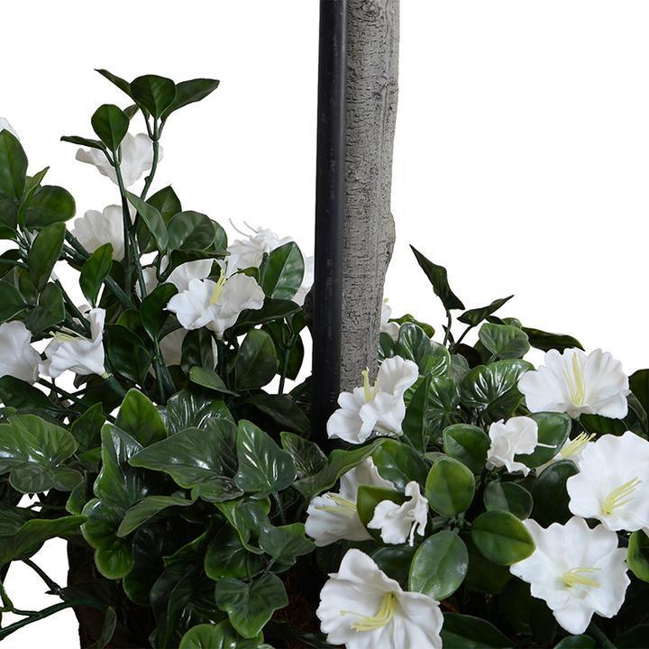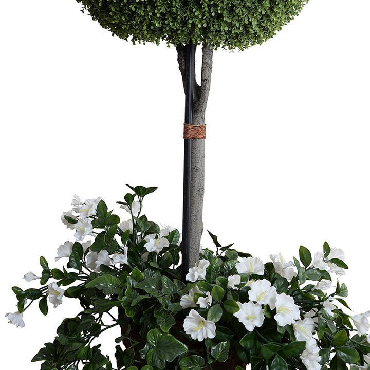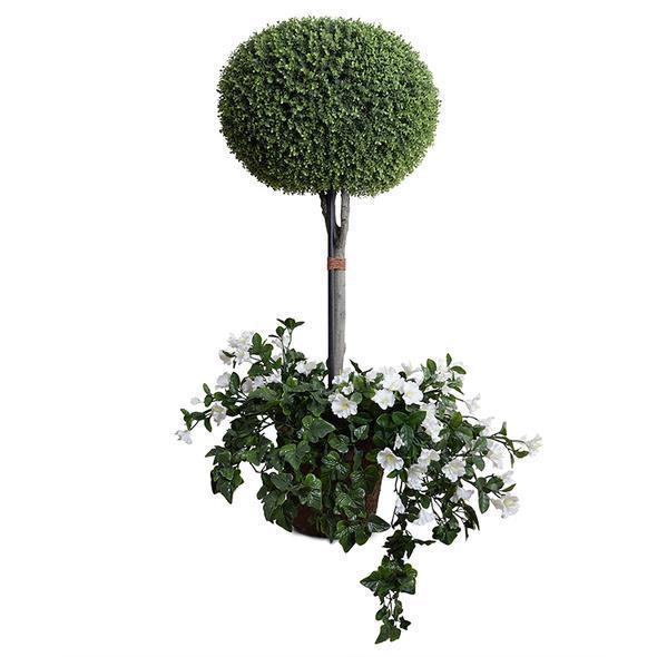 This 64" tall shrub topiary adds another dimension to the landscape, with white flowering vines and green ivy cascading from the base. This UV-stable outdoor plant features a 26" diameter Enduraleaf boxwood pumpkin-shape which is secured onto an artificial trunk, and mounted in a 16" dia. x 13" ht. nursery pot. The realistic trunk is stabilized with a reinforcing metal rod, while the ball has strong wire support inside to avoid crushing. The vines flow out from the base, which is weighted for stability. Mount this plant into any pot with at least a 17" opening and 14" depth, or "plant" directly into the ground.