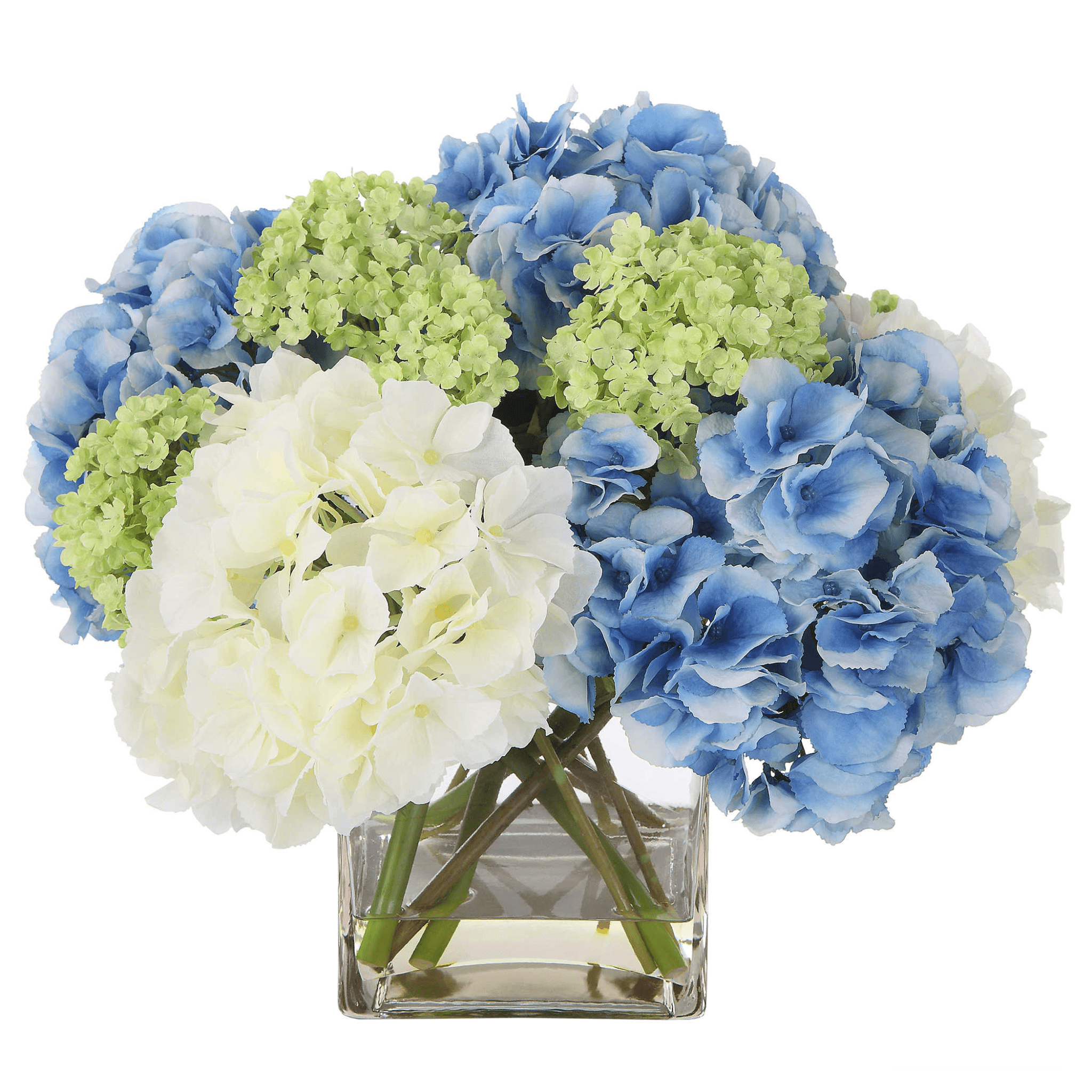 Filled with large summertime blooms, the Providence bouquet shows off a variety of white, blue, and limelight hydrangea stems in a square glass vase with faux water.
