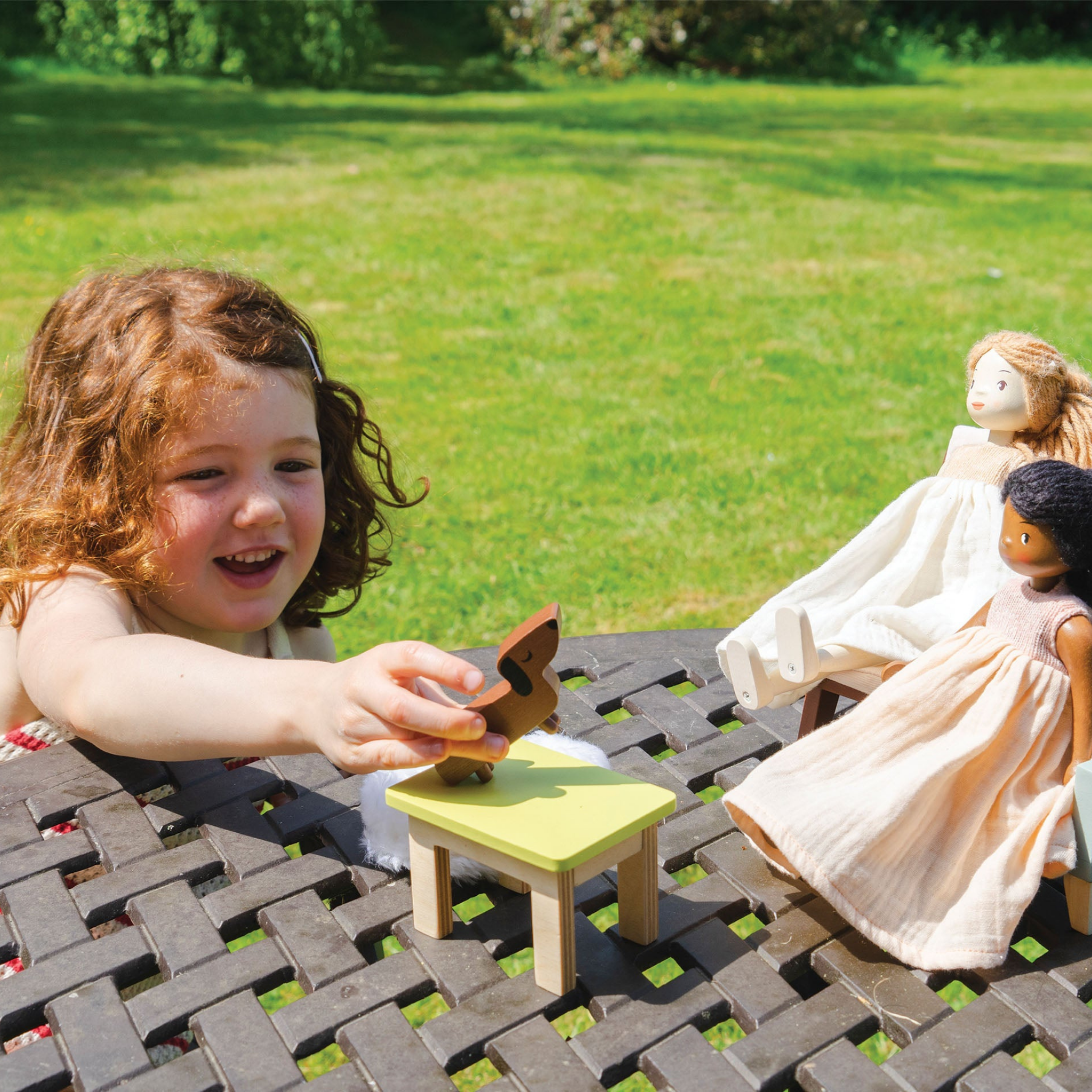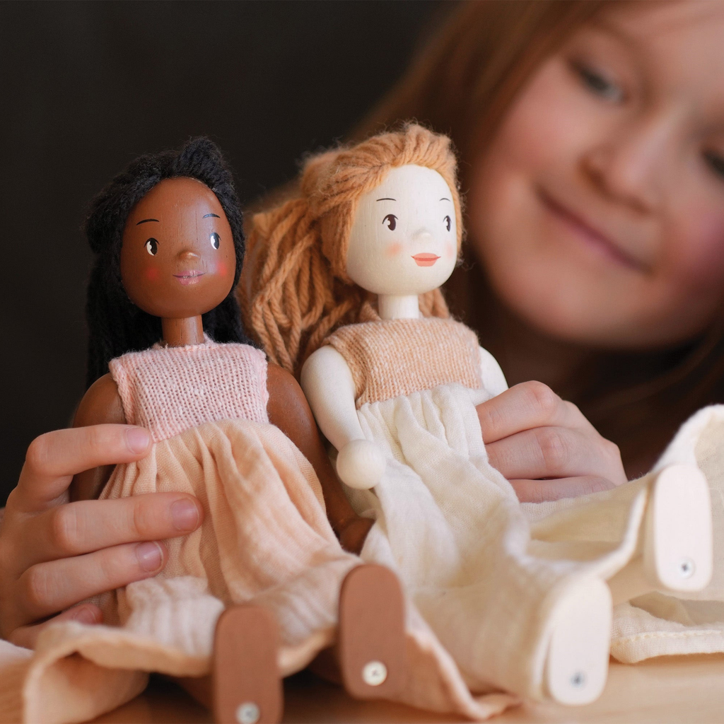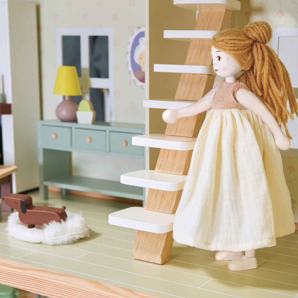 Meet Ferne, our enchanting wooden doll, lovingly handcrafted to live in Mulberry mansion. Ferne is brought to life from sustainably sourced rubber wood, can stand on her own, and has rotating arms and legs allowing her flexibility.
