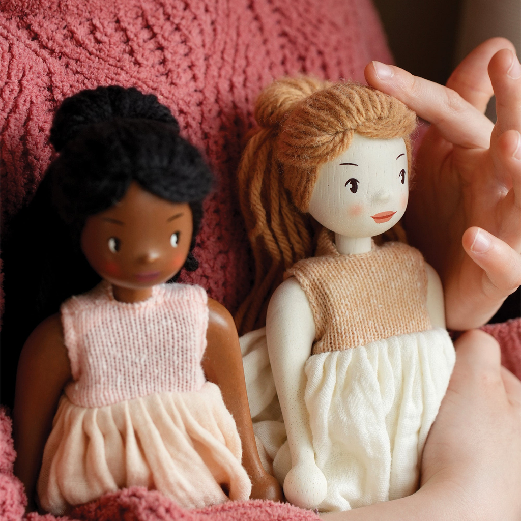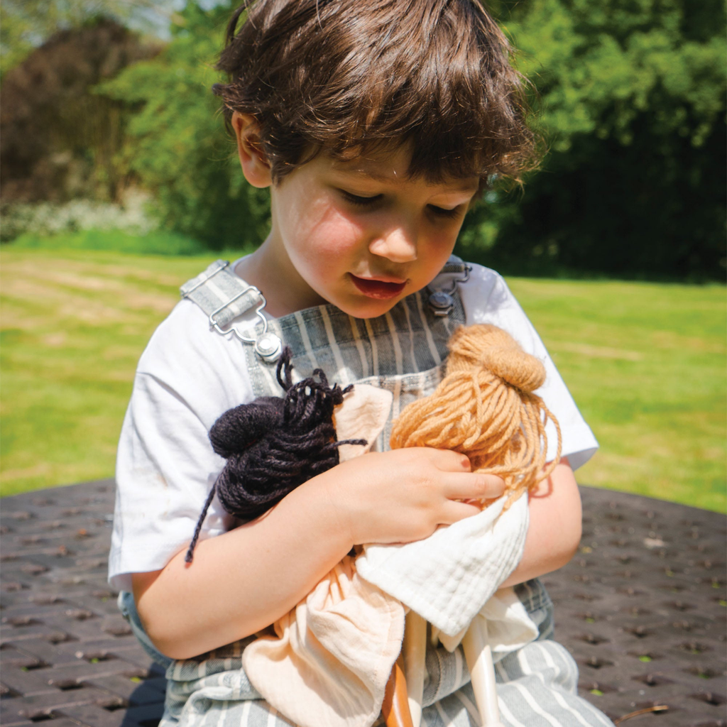 Ferne has a pretty painted face and soft wool hair. You can easily take off her muslin and knitted dress when it’s time for a change, and she even has some comfy cotton underpants. Ferne is more than a doll; she is a lifelong friend waiting to be cherished.