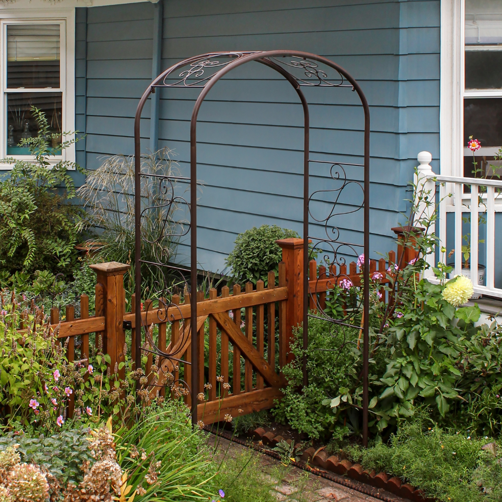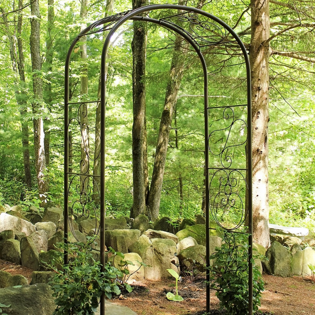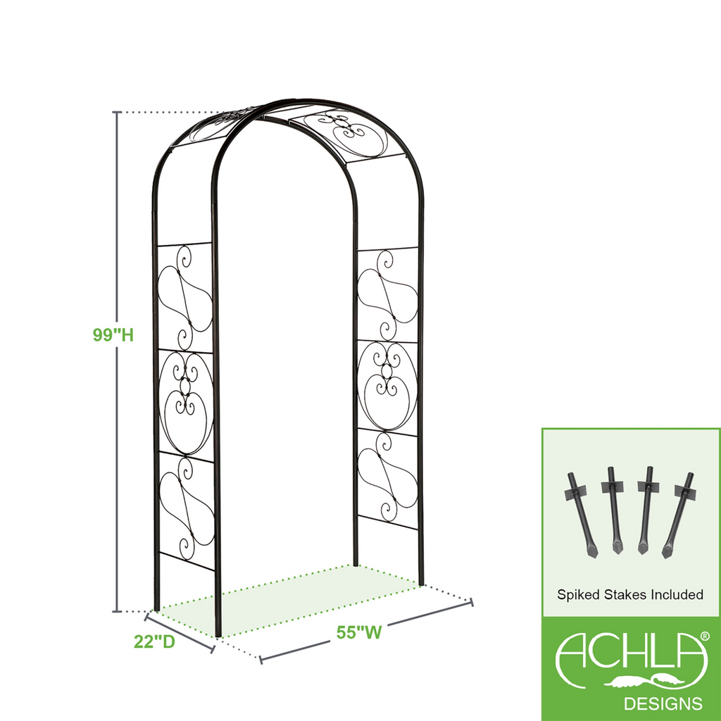 This Italianate arbor uses the delicate tracery of traditional ironwork to create an elegant support for climbers. A matching trellis is available to give your garden a beautiful old-world feeling. Tall enough to support climbing vines with ample room for passage beneath.