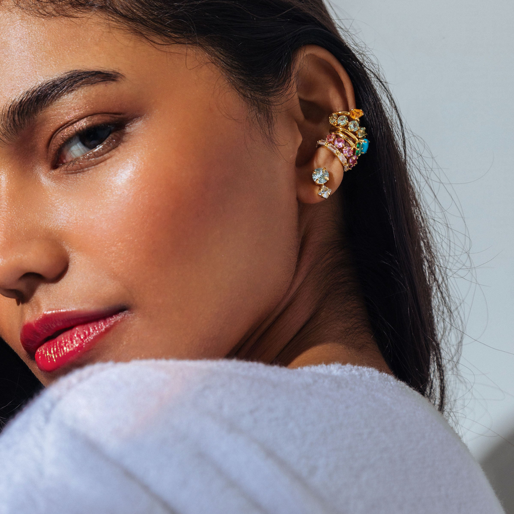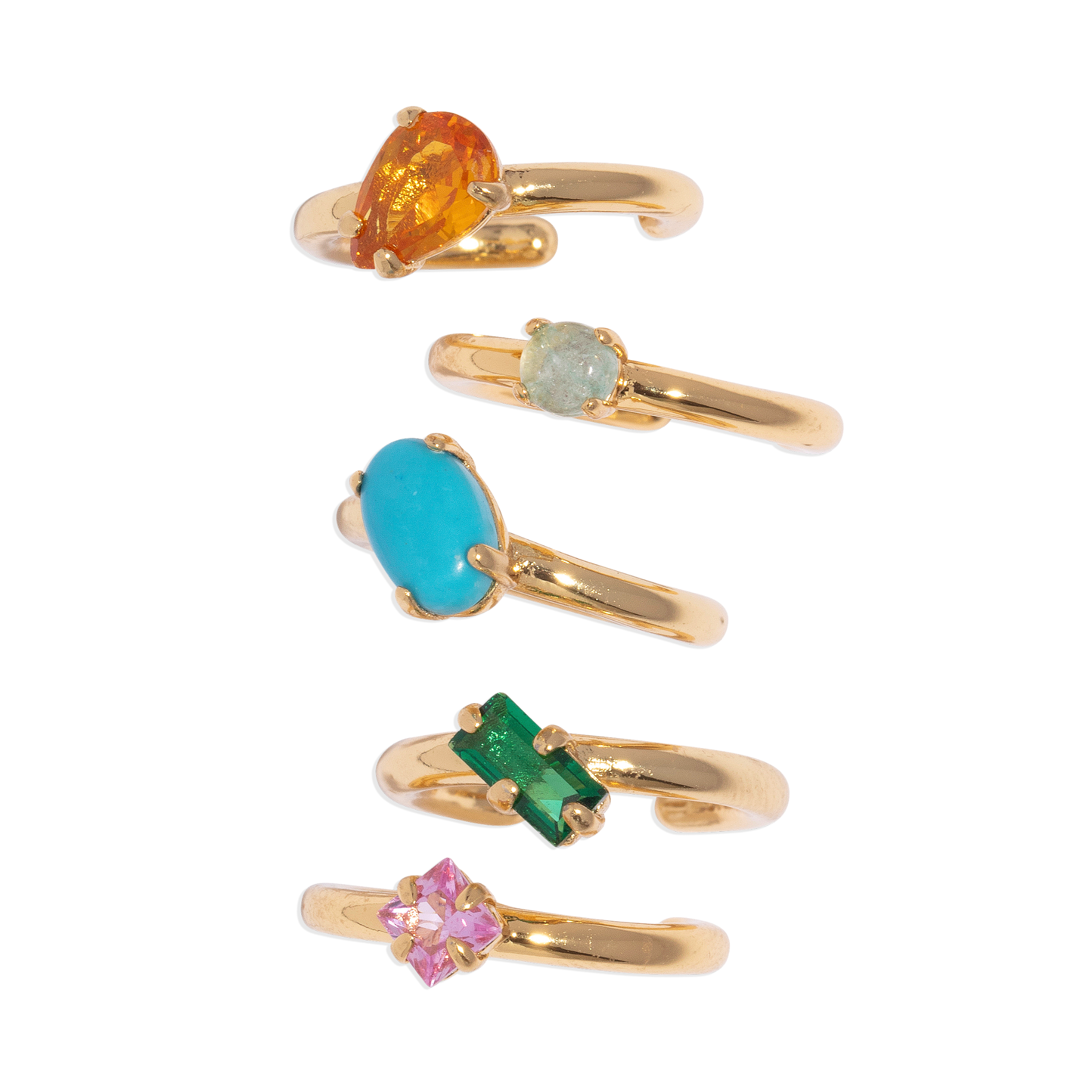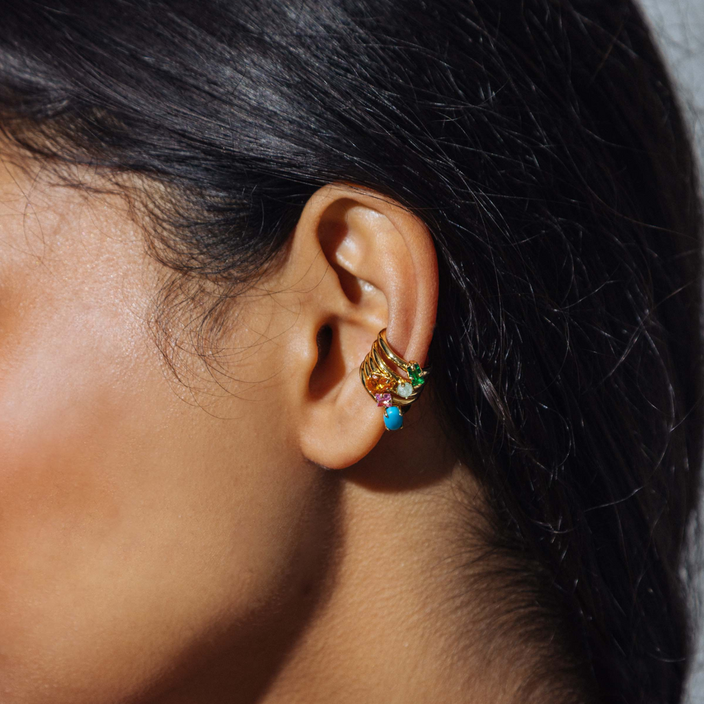 A true party of five, the irresistible Fiesta Ear Cuff Set is a playful cluster of 5 different shapes of deliciously different colored stones that just look like they’re having so much fun together. Layer them with huggies or add on top of a statement earring for extra oomph.