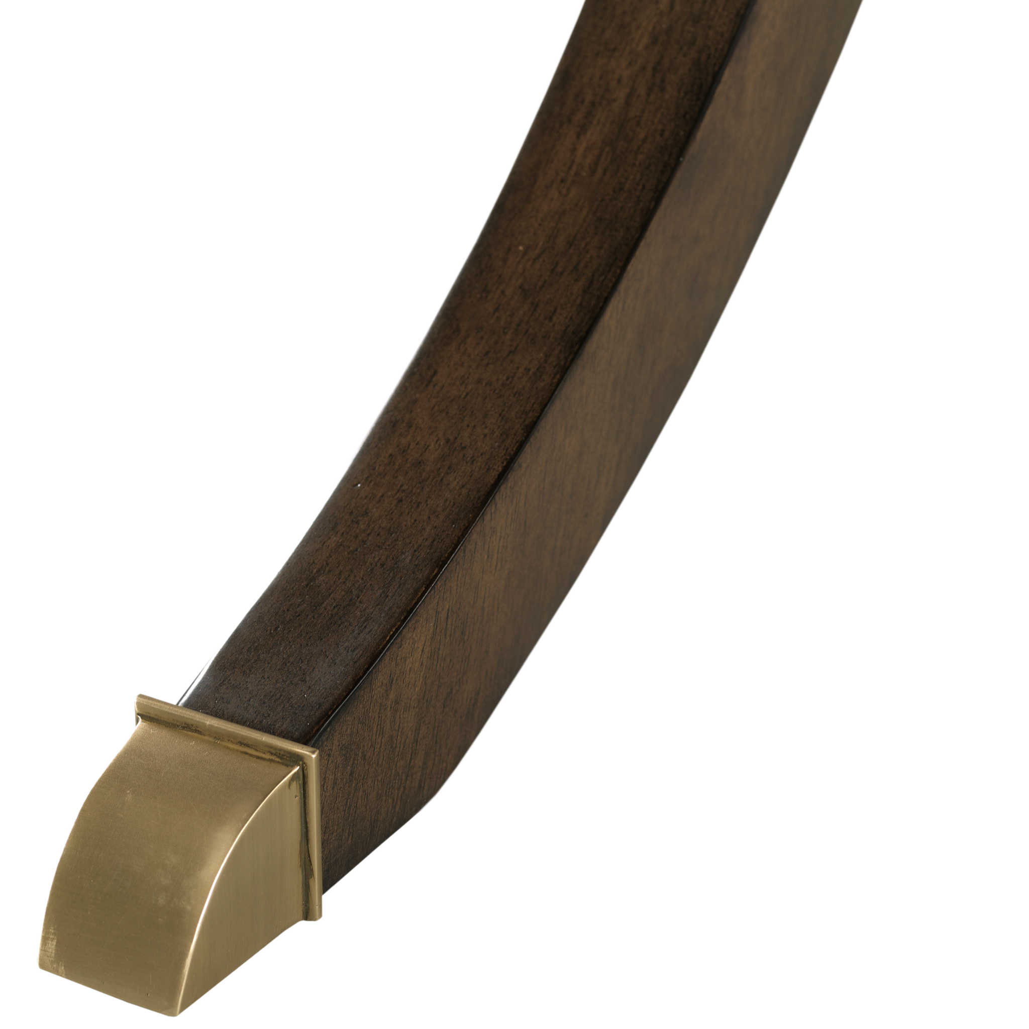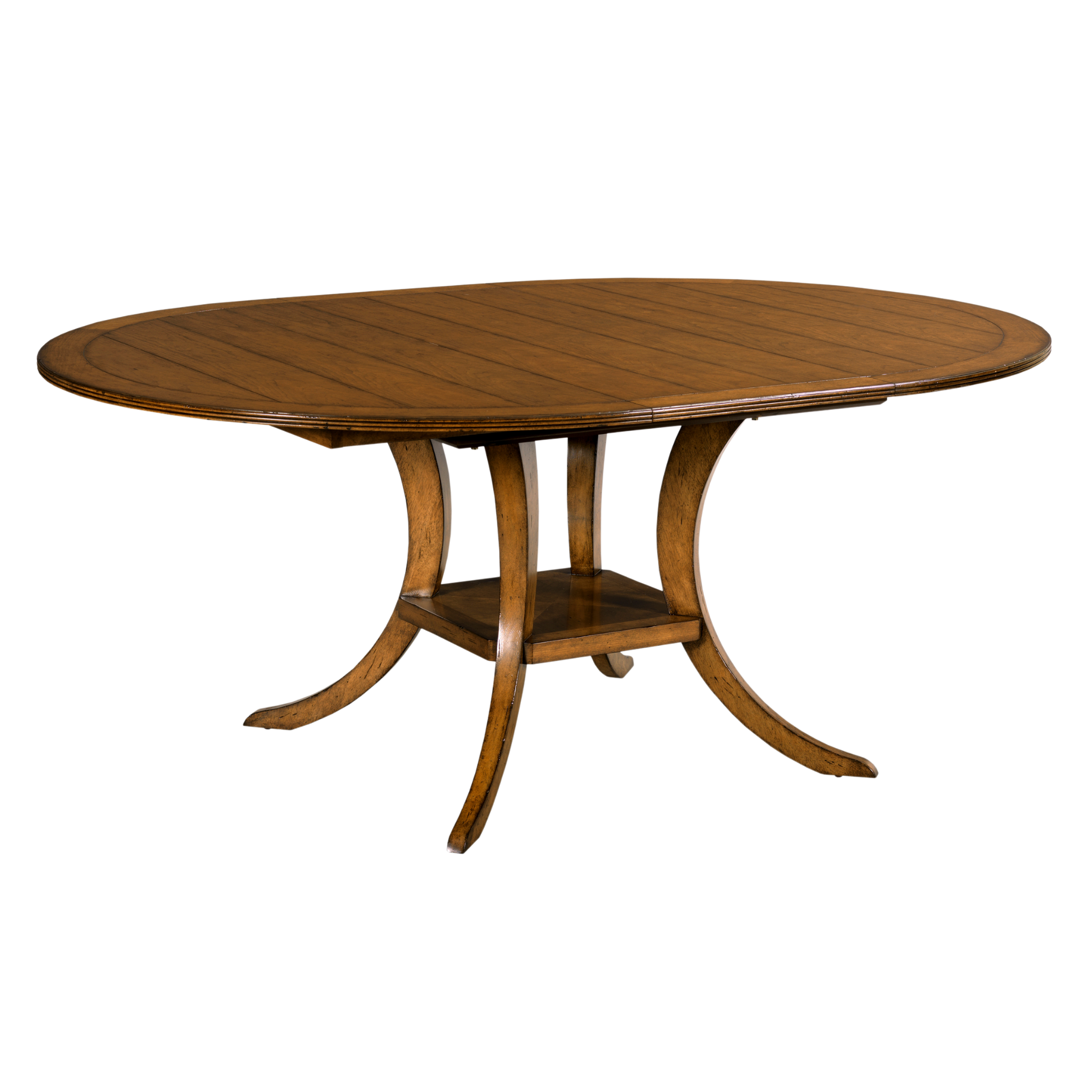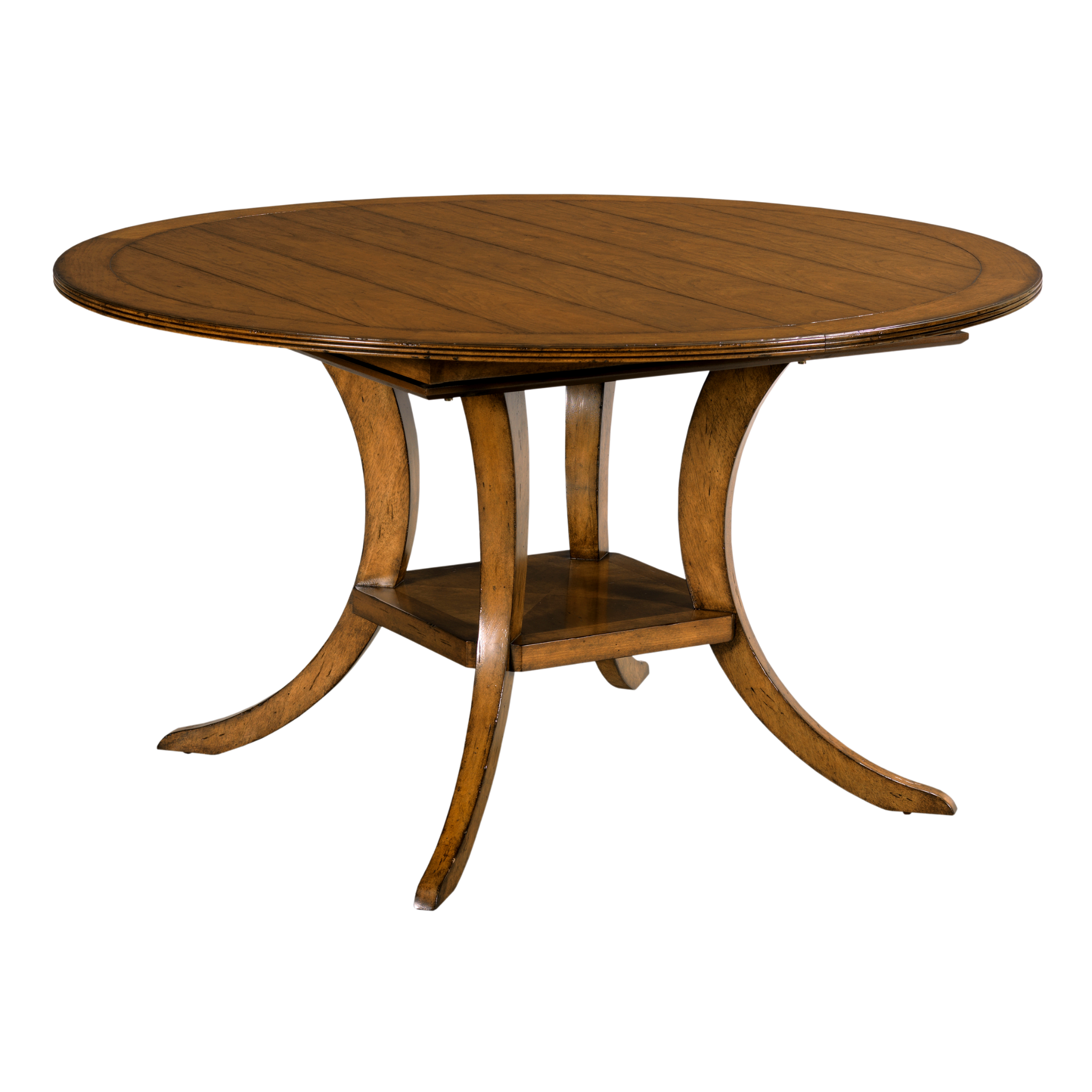 A wonderful table for dining with a round top that divides at its center to accommodate 2-18” fillers. The table is elevated on ample sable legs that are joined by a low square shelf.