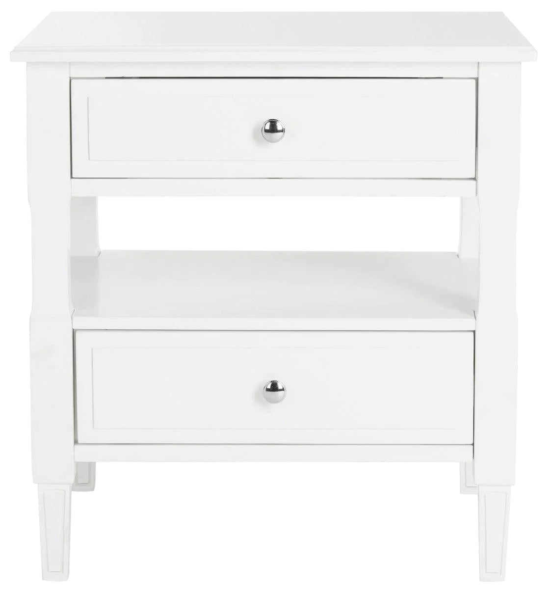 An impromptu retreat to the heart of Burgundy inspired this white two drawer nightstand. A fine iteration of French country living, this transitional piece features delicately crafted wood detail on its legs, stylish silver pulls and layers of storage. Measures 24"W x 18"D x 26"H. Made of rubber wood with chrome handles. Weighs 44lbs. Please note, some light assembly is required. Click image for greater detail.