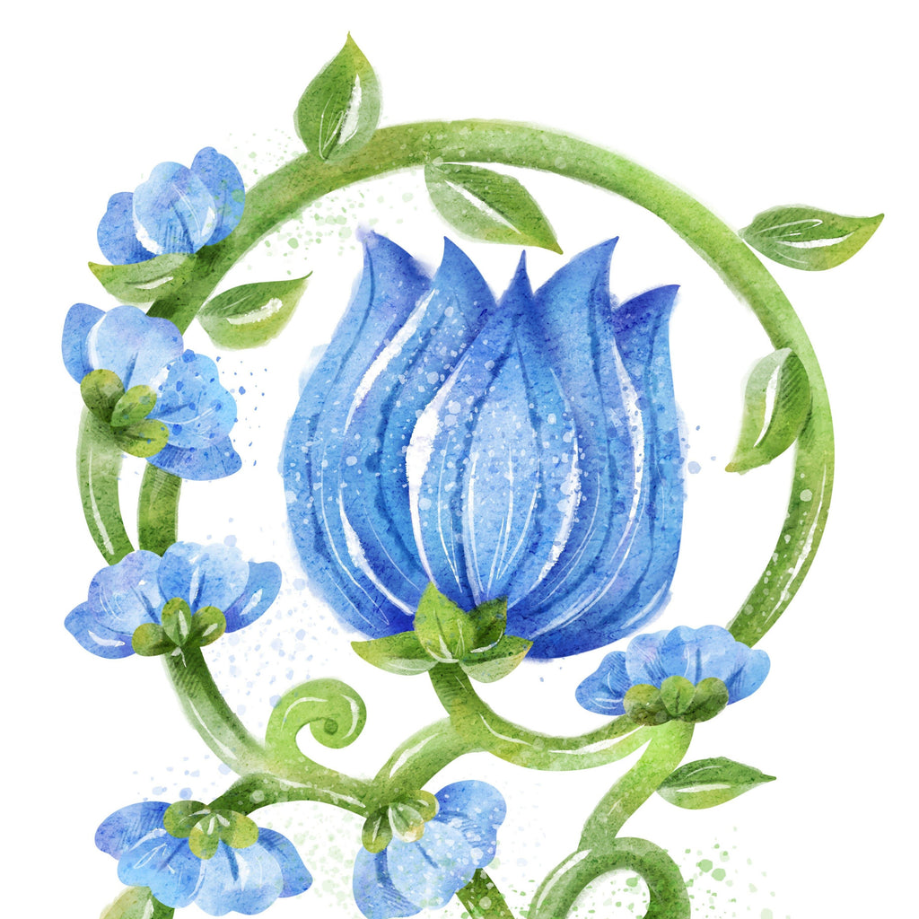 Add an additional elegant touch to your table setting with place cards. We commissioned original artwork to create this marvelous blue flower.