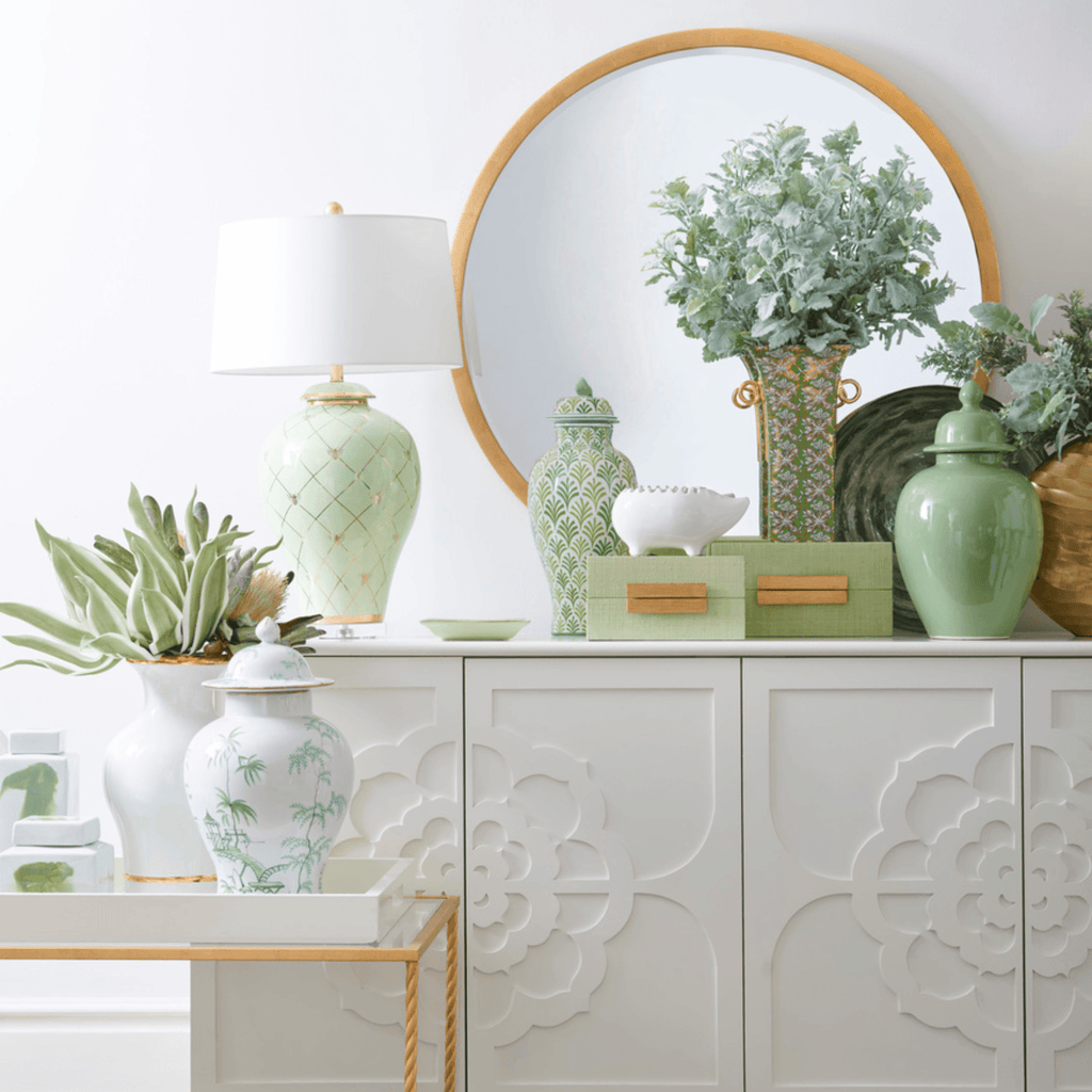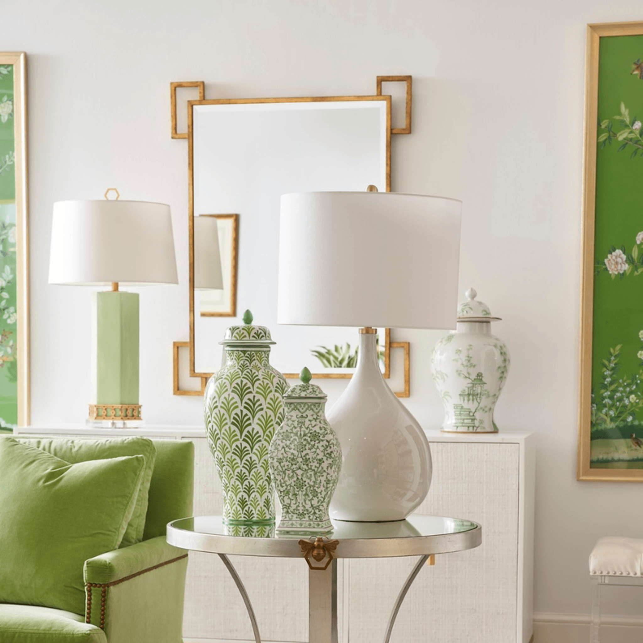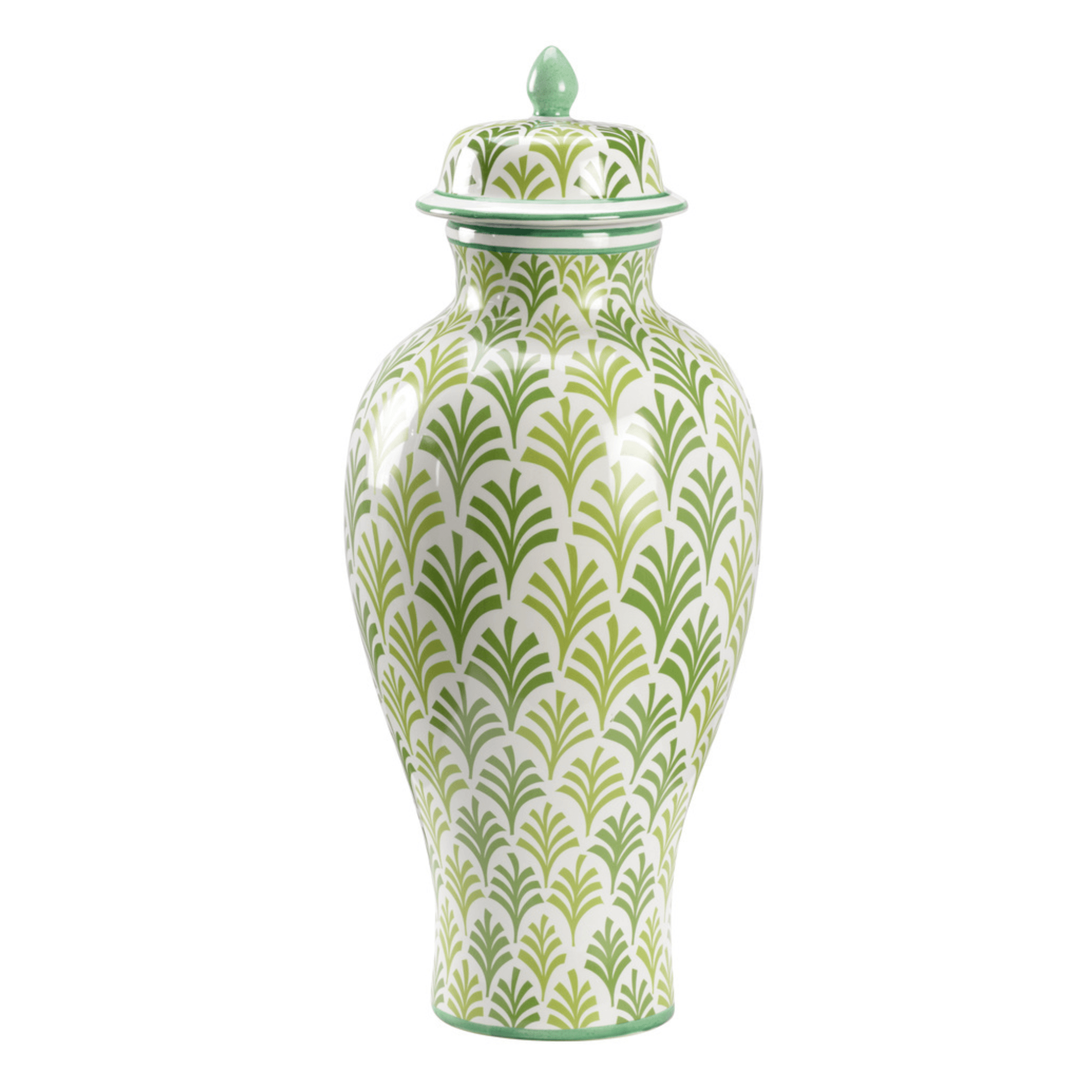This classic covered urn features a gand painted green pattern. Designed by Claire Bell. Overall Dimensions: 20"h x 8.5"w x 8.5"d. Click on images for greater detail