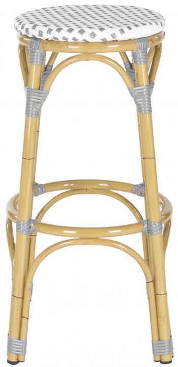 Cheers! Raise a glass to country and coastal decorating with this sophisticated grey and white indoor-outdoor bar stool. A bright and colorful addition to any kitchen or patio bar, the pretty piece is inspired by classic European bistro stools and crafted of white PE wicker and aluminum faux bamboo for easy care. This stool measures 20.5"W x 20.5"D x 30”H; the seat measures 13.4"D x 30.7”H. Click on images for greater detail.