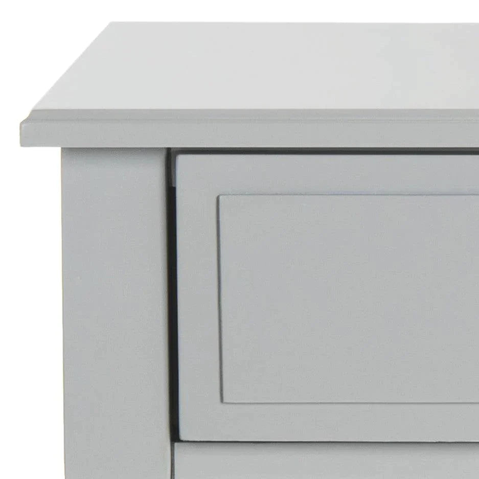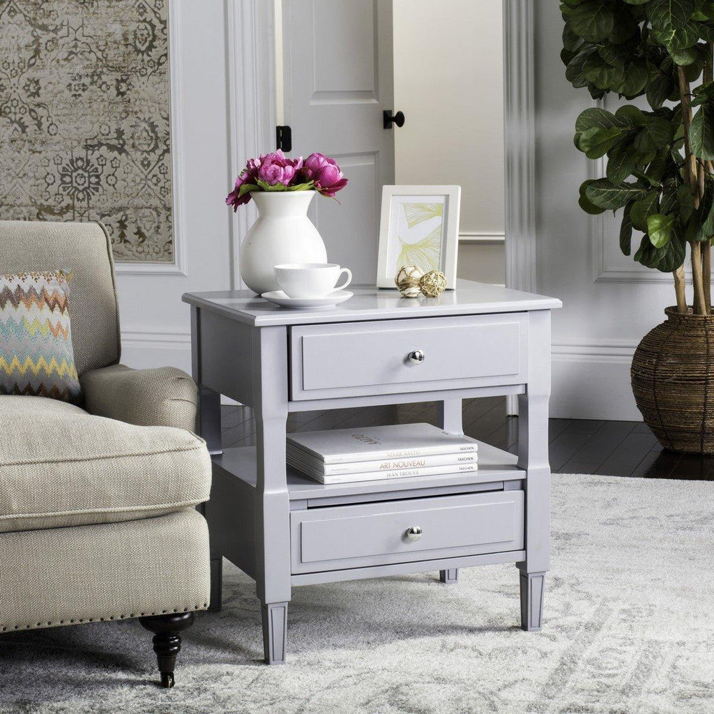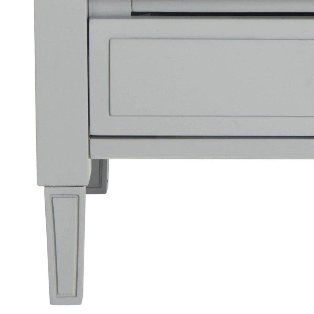 An impromptu retreat to the heart of Burgundy inspired this grey two drawer nightstand. A fine iteration of French country living, this transitional piece features delicately crafted wood detail on its legs, stylish silver pulls and layers of storage. Measures 24"W x 18"D x 26"H. Made of rubber wood with chrome handles. Weighs 44lbs. Click image for greater detail.