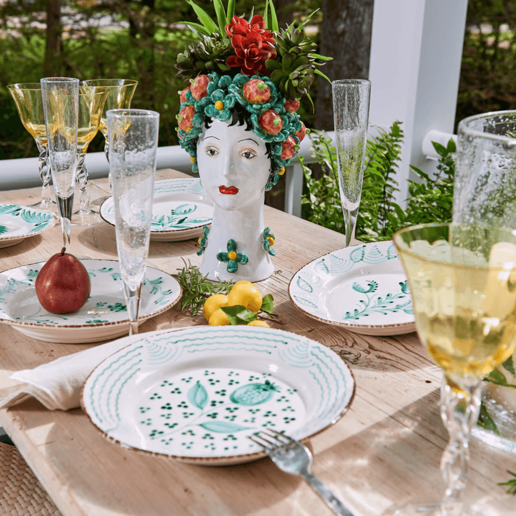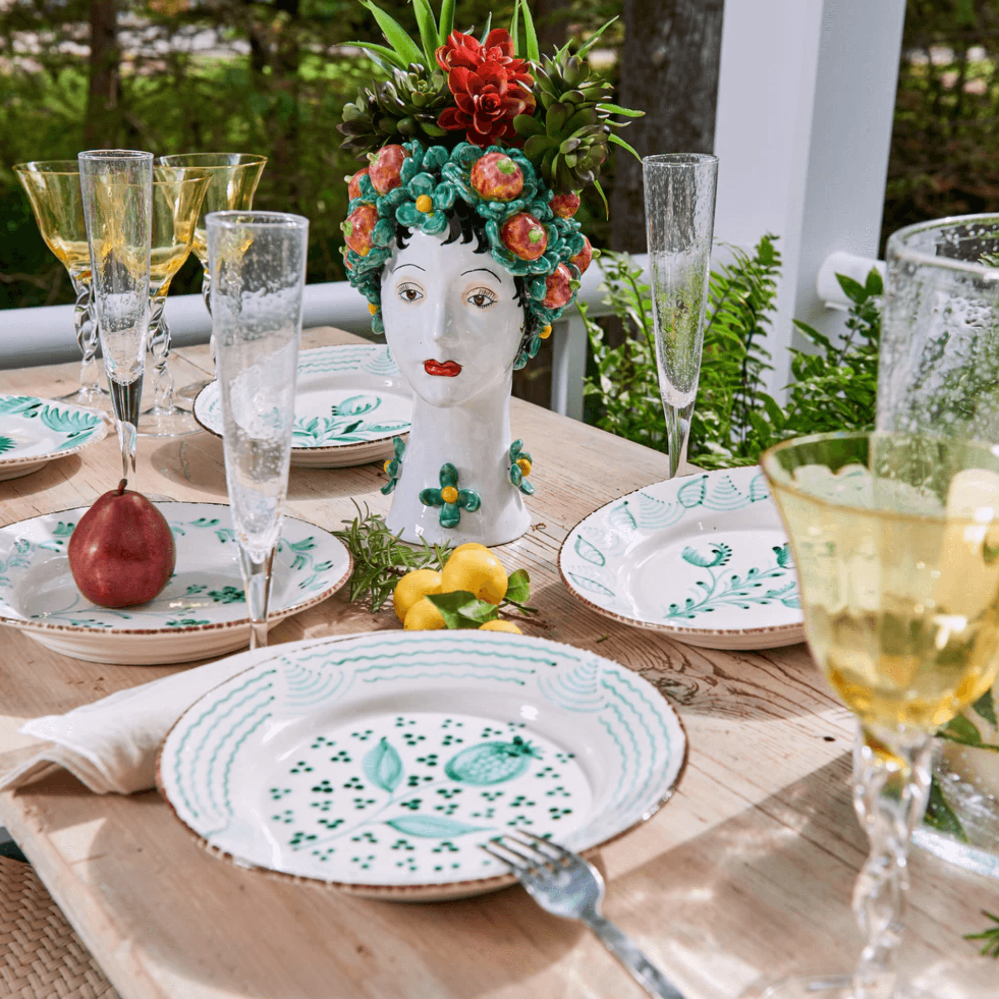 A new take on an old tradition. Enjoy our new collection of green and white hand-painted plates influenced by the beautiful antique Portuguese and Spanish Talavera.