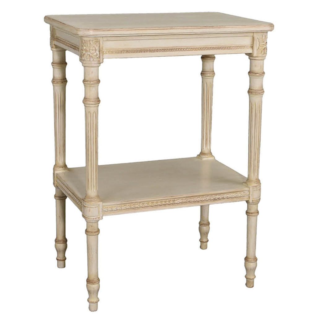 This small two shelf cream side table features impeccable hand carved detailing. The table measures 20” x 15” x 27". This item may not be returned unless there is damage or defect upon receipt of the item. Click on image for greater detail.