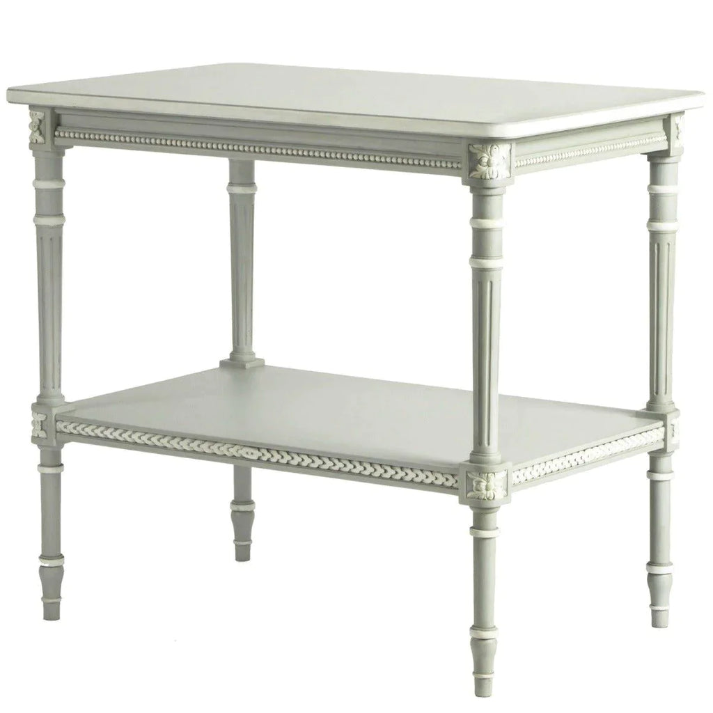 This lovely wood side table features two shelves and a gray finish. The table measures 30" X 20" X 27". This item may not be returned unless there is damage or defect upon receipt of the item. Click on image for greater detail.