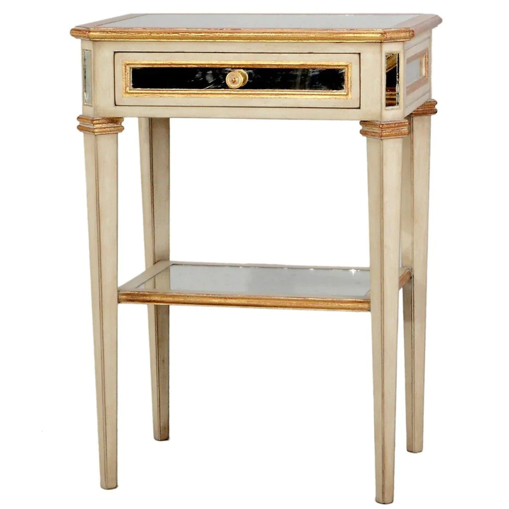 This lovely handmade table features a cream finish and two shelves with mirrored tops. The table measures 15" X 20" X 27". This item may not be returned unless there is damage or defect upon receipt of the item. Click on image for greater detail.
