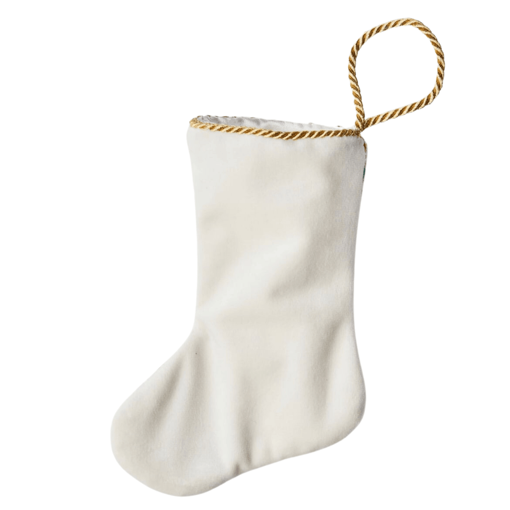 - Hand-stitched needlepoint heirloom stockings with cotton threads and velvet backing.