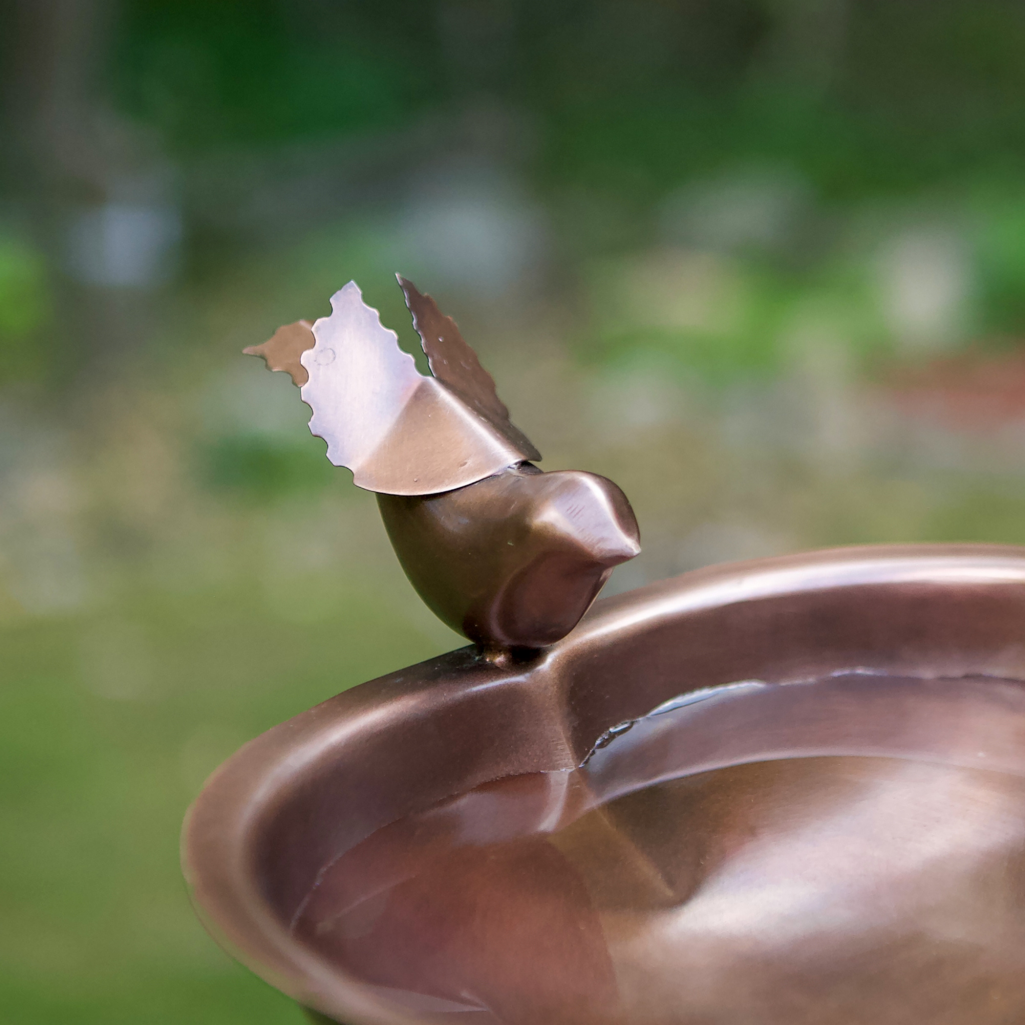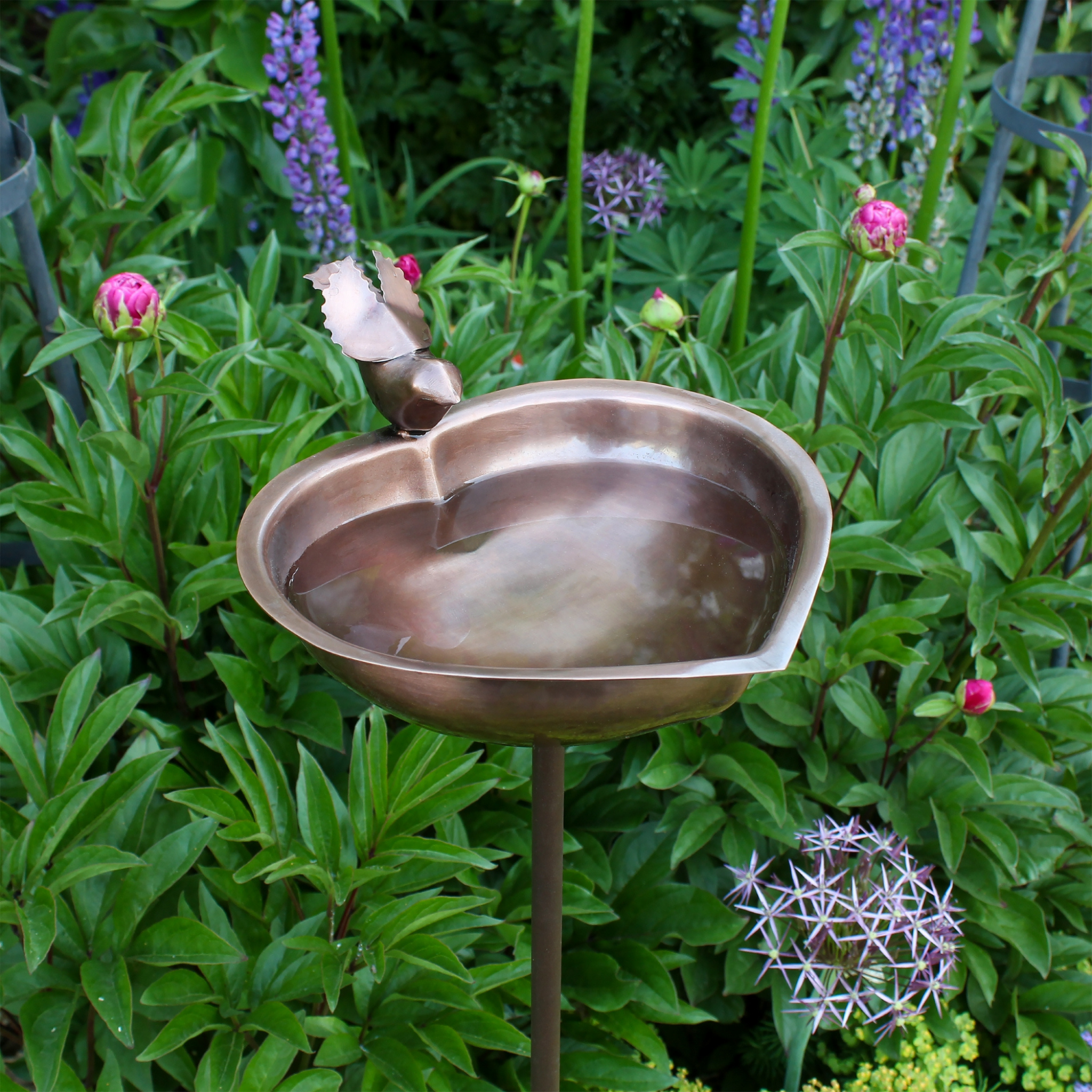 A simple bird detail perches on top of this cute heart-shaped copper bowl, ideal for a bird-loving valentine or for a copper anniversary sweetheart. The threaded base on the underside of the bowl attaches it to the 36” wrought iron garden stake. The two-prong design gives added stability for staking directly into garden beds and borders.