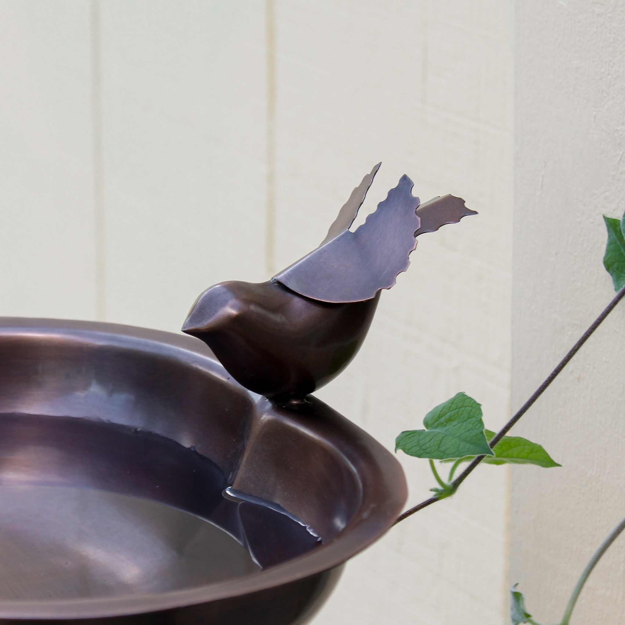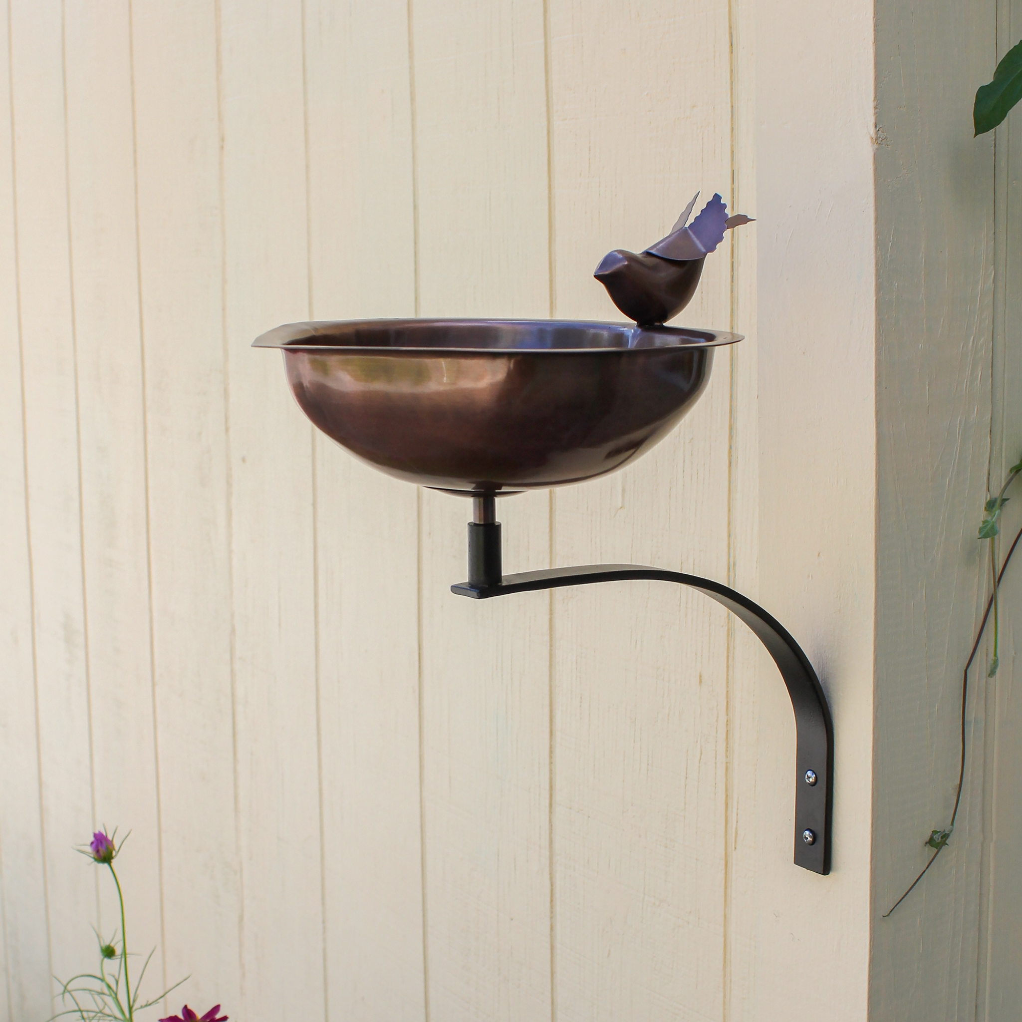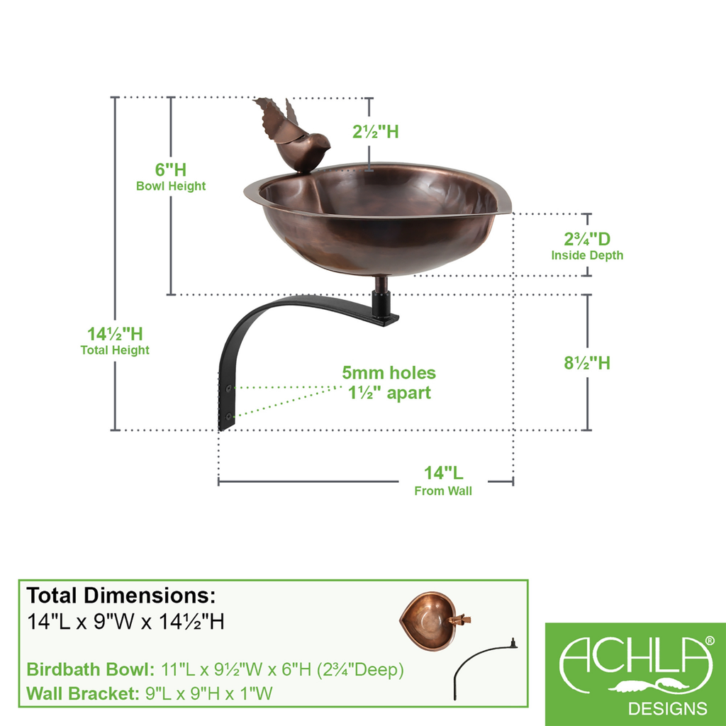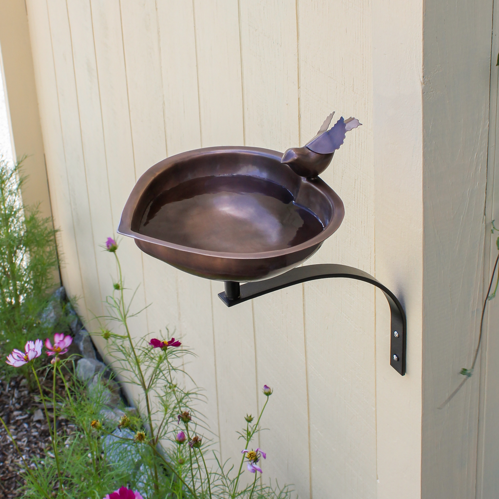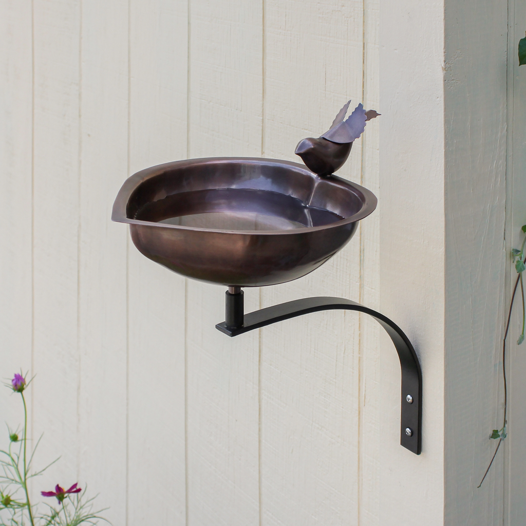 A simple bird detail perches on this cute heart-shaped copper bowl, ideal for a bird-loving Valentine or a copper anniversary sweetheart. Ideal for small gardens and urban landscapes, for porch, deck, and fence posts, the threaded base on the underside of the bowl attaches to the wrought iron Wall Bracket. Two mounting holes and stainless-steel hardware are provided.