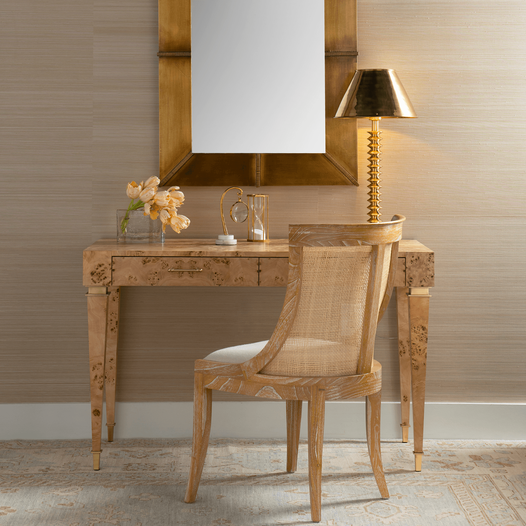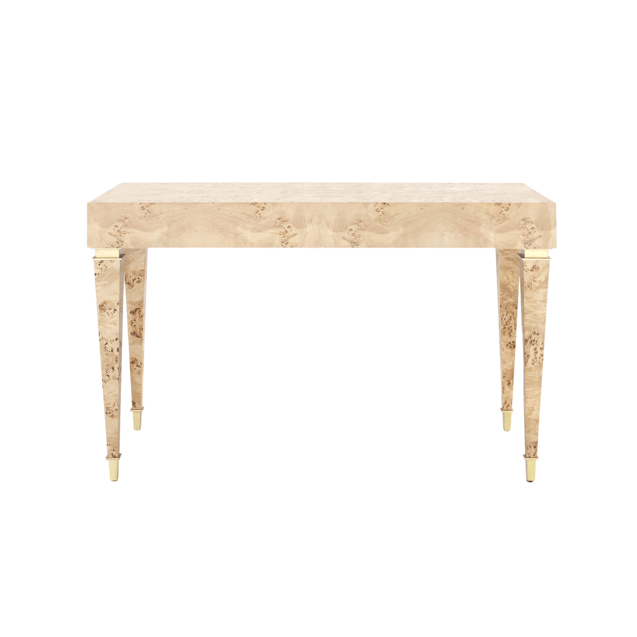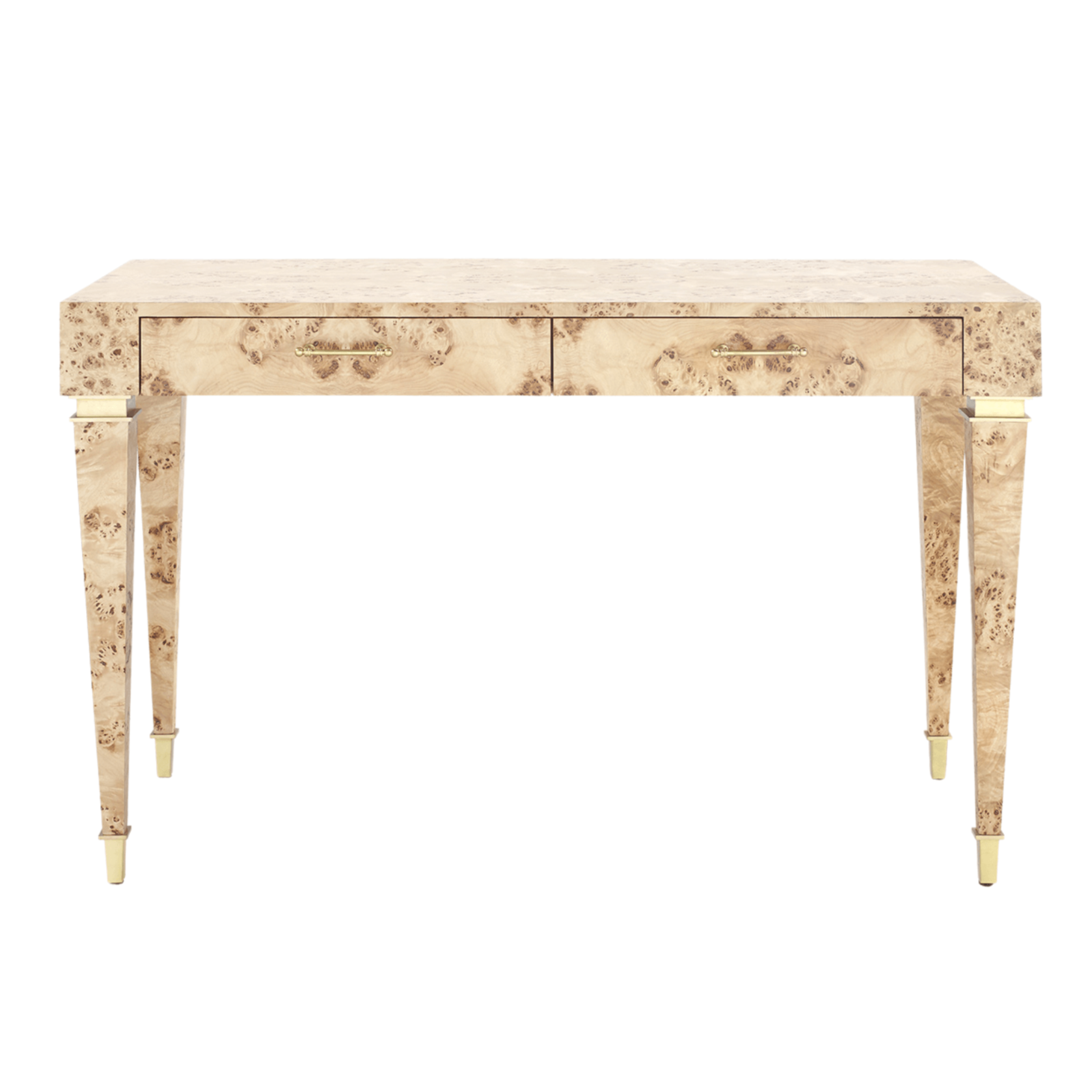 The Helena Desk, wrapped in exquisite burl-wood veneer, brings the art of nature into your home design. Details include the warm glow of brushed brass drawer handles, and brushed brass sabots and accents on the tapering legs.