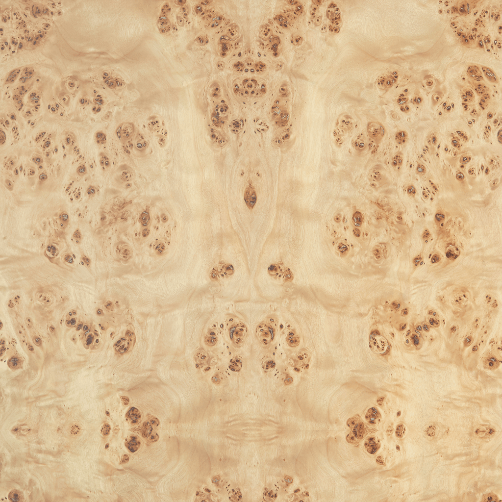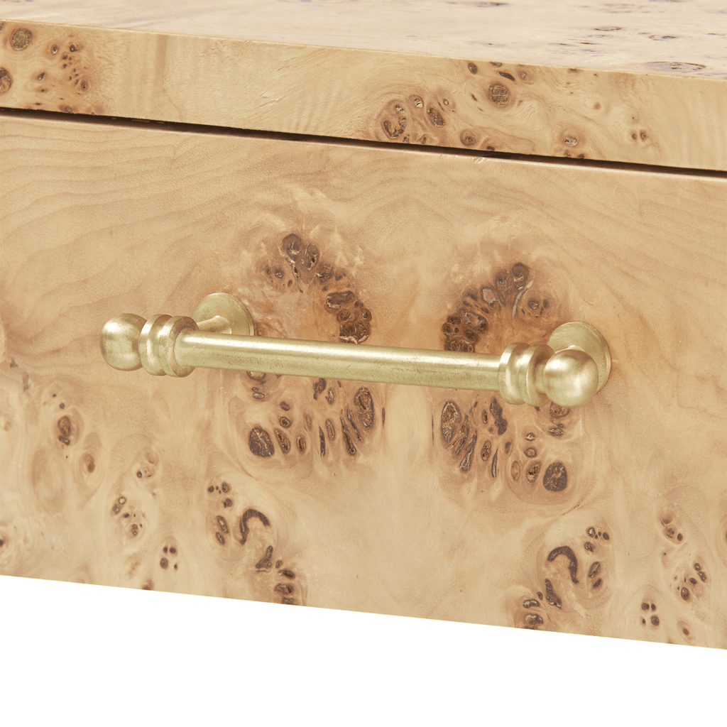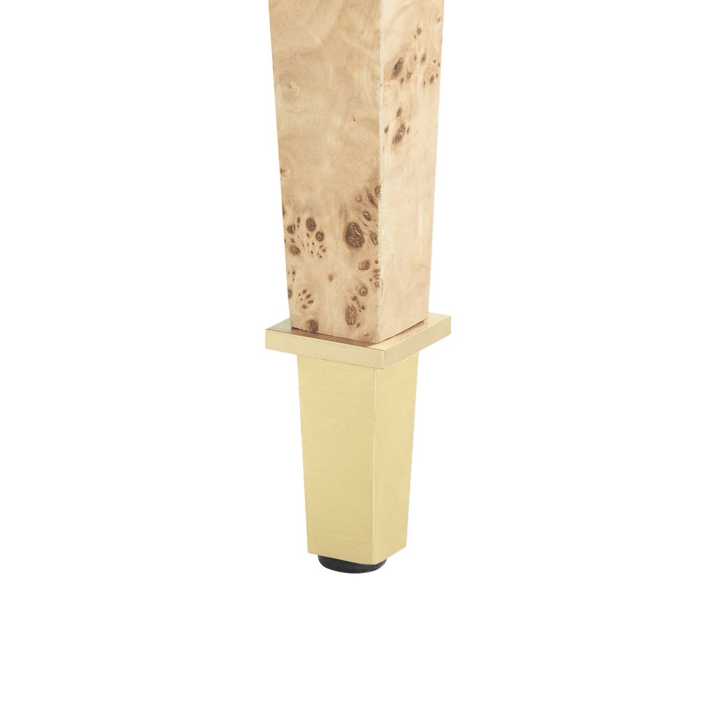 The Helena Desk, wrapped in exquisite burl-wood veneer, brings the art of nature into your home design. Details include the warm glow of brushed brass drawer handles, and brushed brass sabots and accents on the tapering legs.