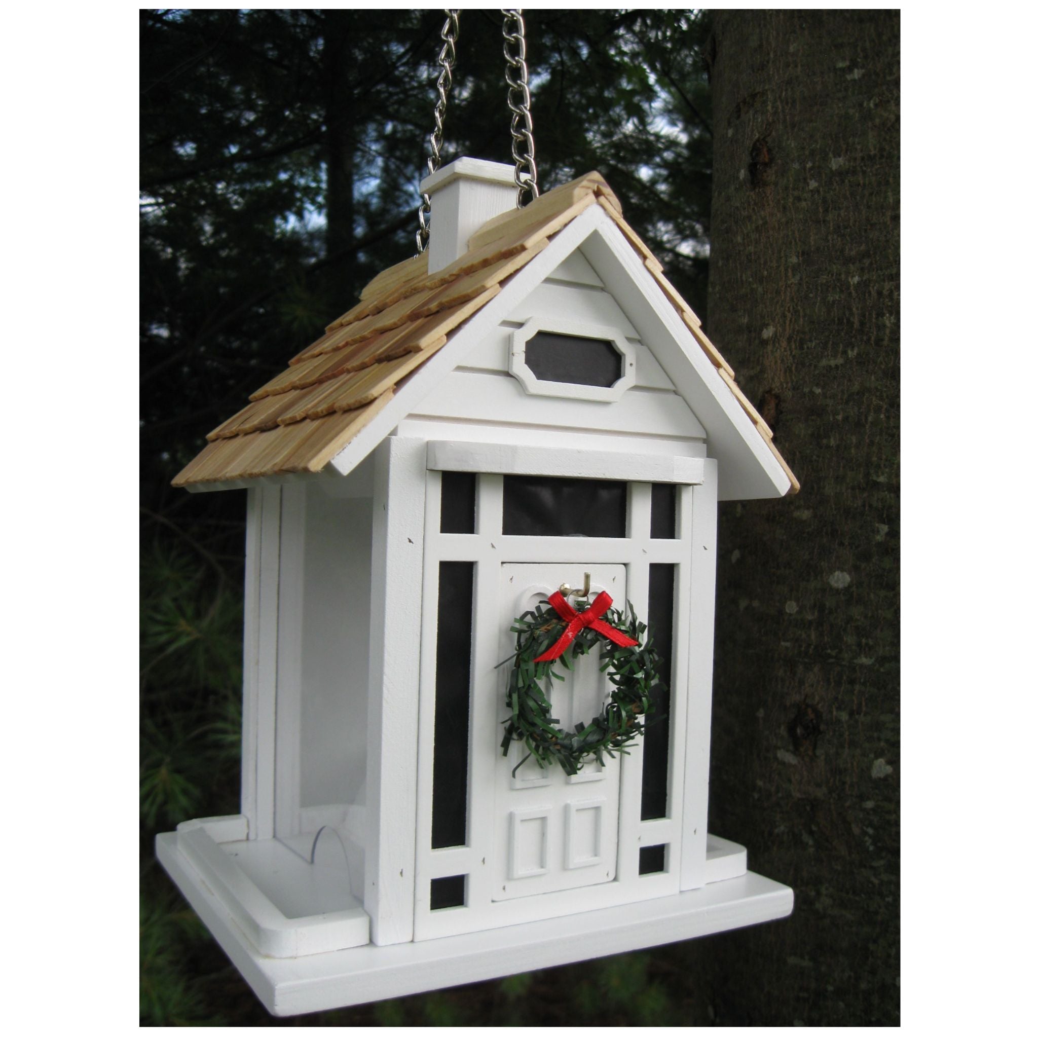 This fully functional bird feeder will fit right into any yuletide backyard. Top lifts up to expose ample cavity for seed. Features a removable wreath. Topped off with a pine roof. Hangs from a sturdy brass chain.