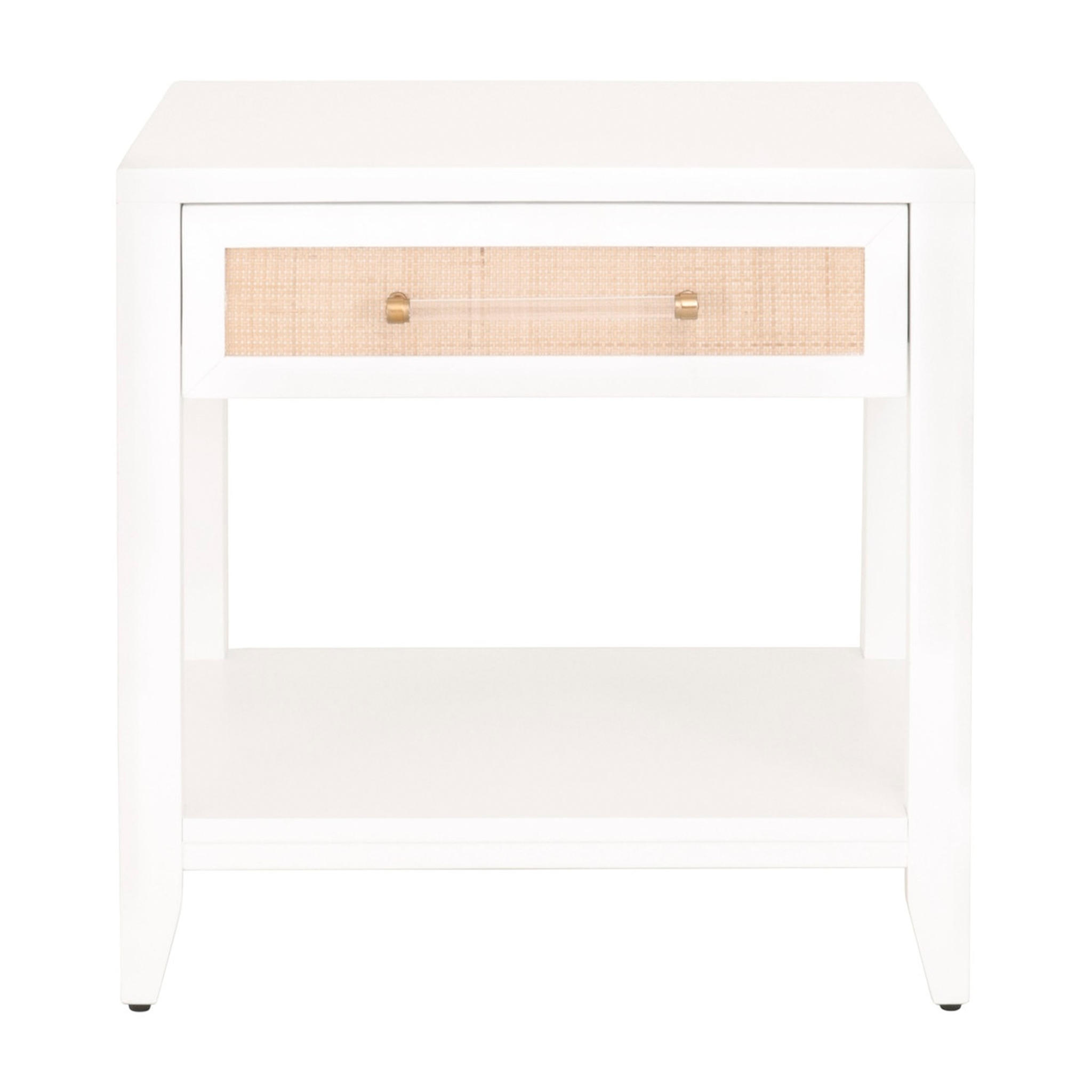 This transitional Holland 1-Drawer Side Table blends design styles taken from tropical, traditional, and modern looks. The storage drawer features a rattan inlay framed by a matte white lacquered wood. The contemporary clear handle with brushed brass ends accessorizes this table as well. Complete your living room or bedroom set with this beautifully designed side table.